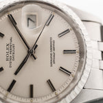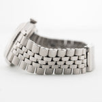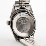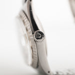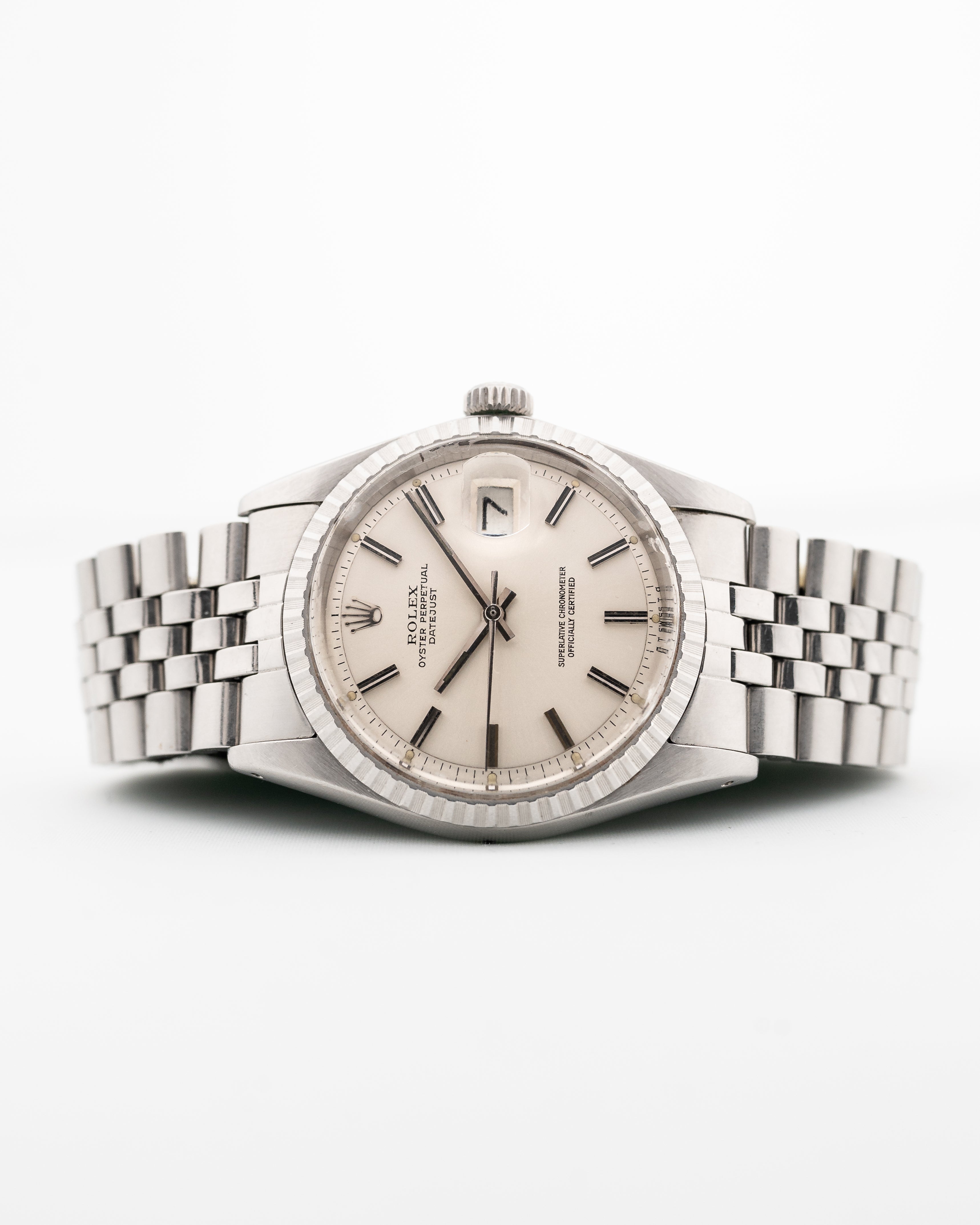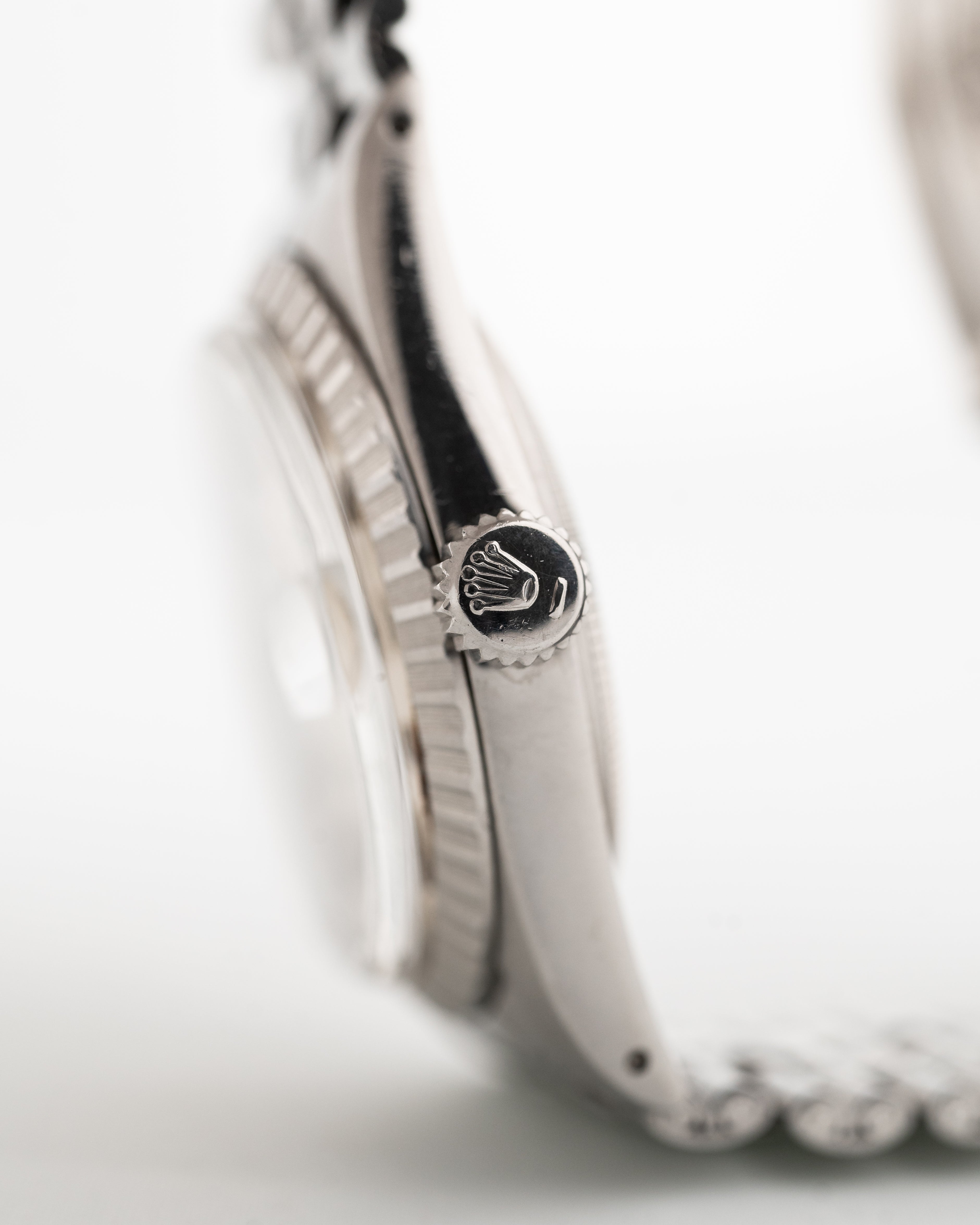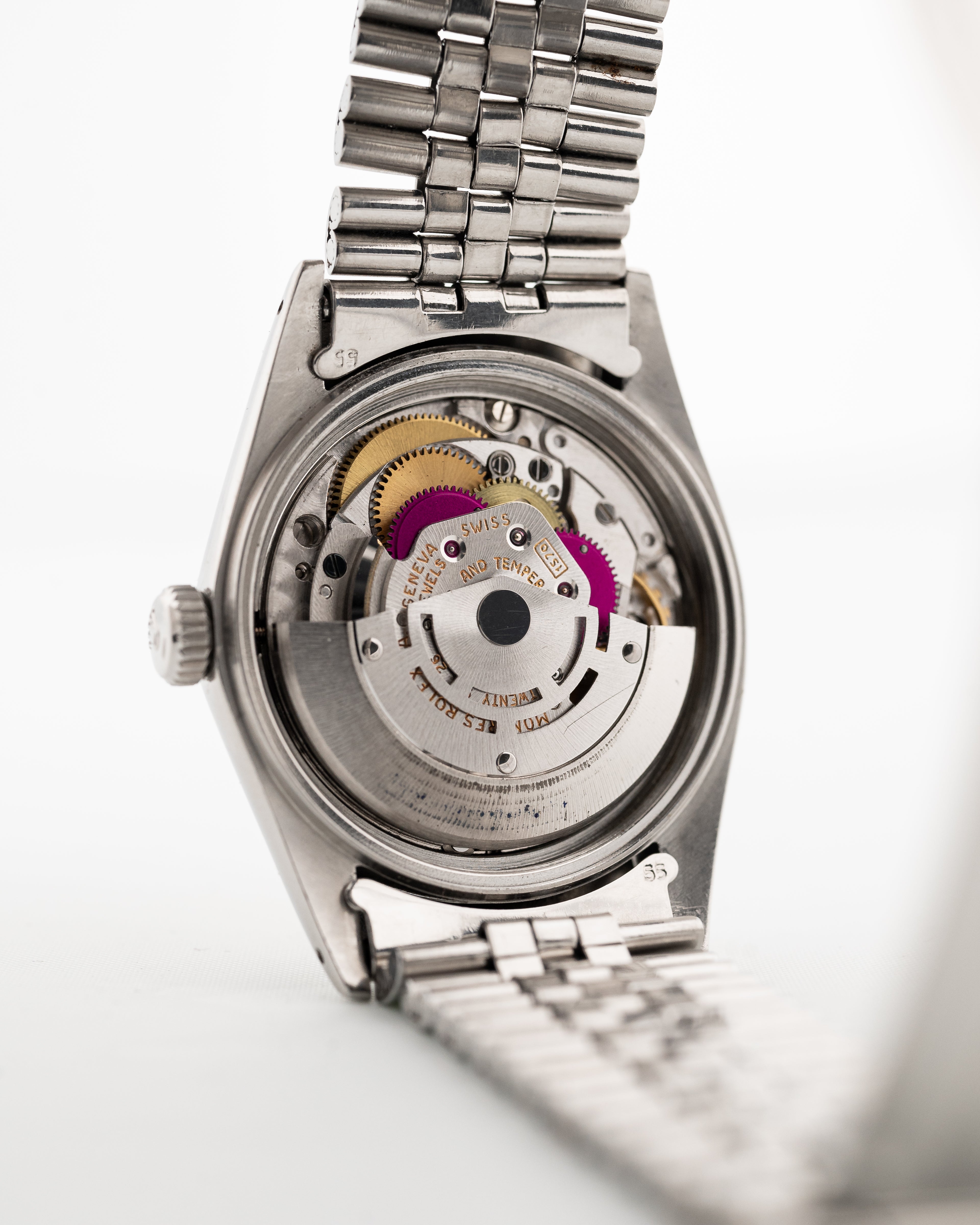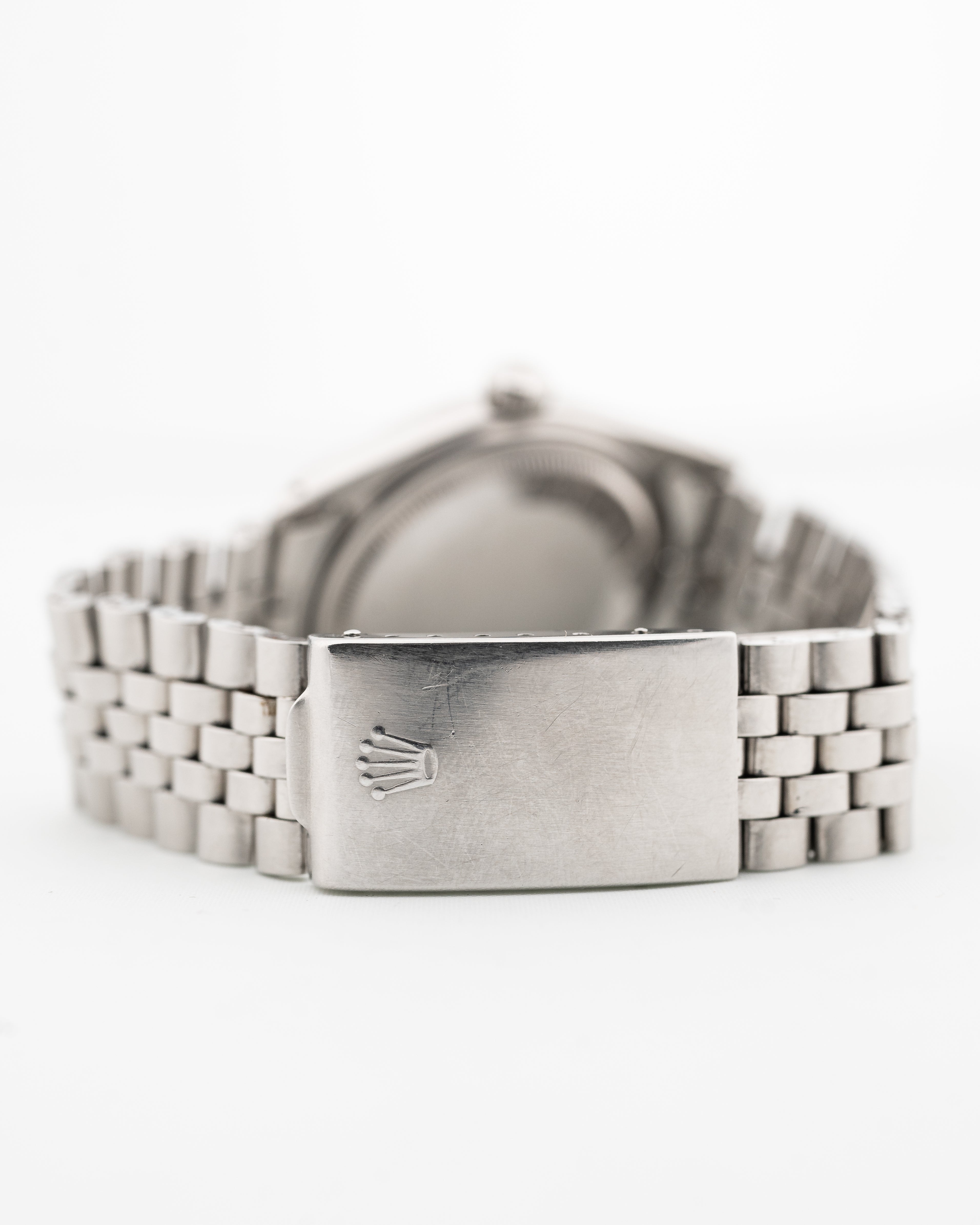 Our particular piece with the Reference 1603 from 1973 is notable for its engine turned bezel, a beautiful silver pie pan dial in flawless condition and a very strong case with sharp edges.