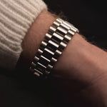 The Rolex Day-Date reference 18039 is a classic example of the brand’s craftsmanship from the 1980s. Made from solid 18k white gold and fitted with the signature President bracelet, the watch carries the unmistakable presence of the Day-Date line. Its 36mm case, fluted bezel, and automatic caliber 3055 movement with quickset date combine reliability with unmistakable design.