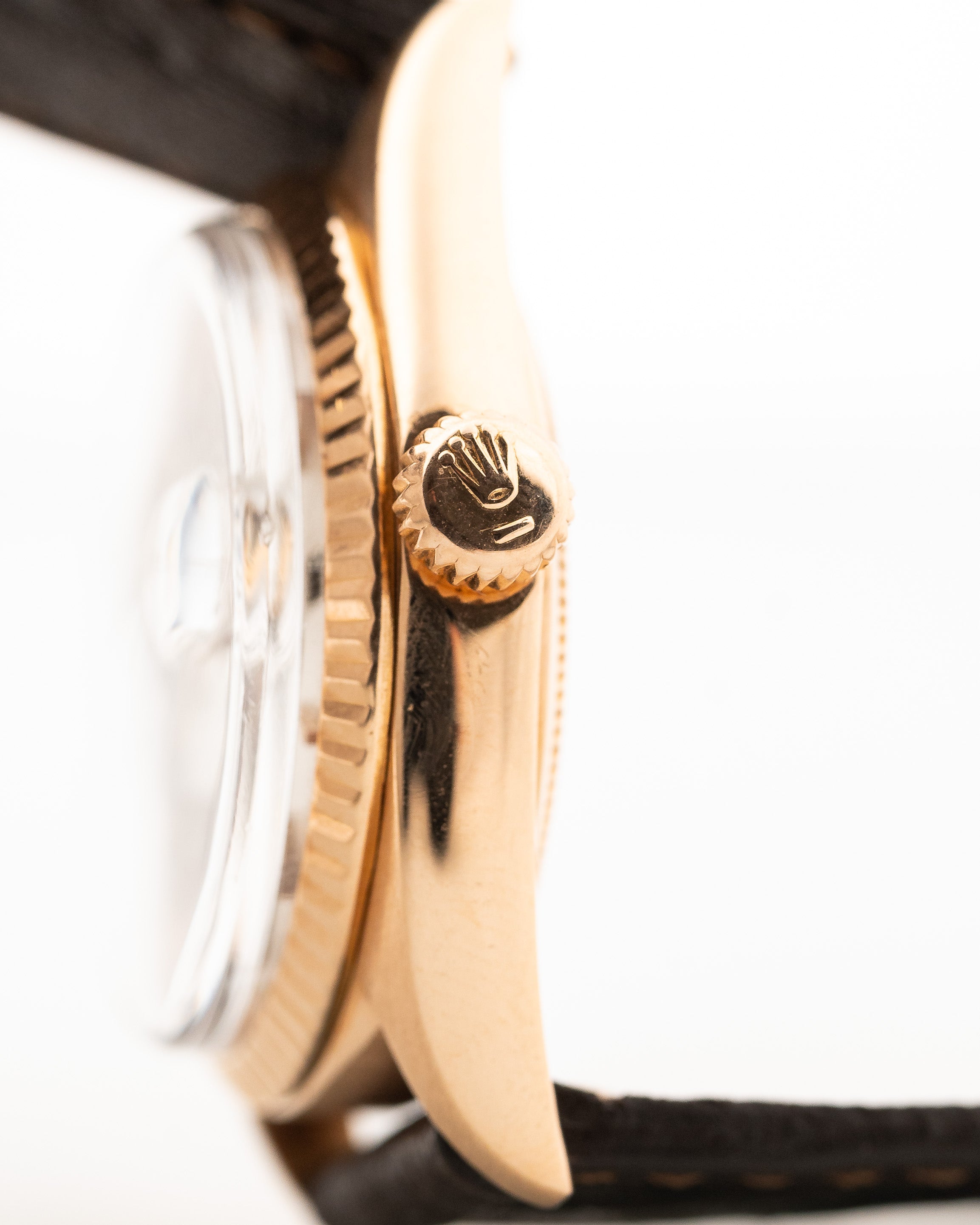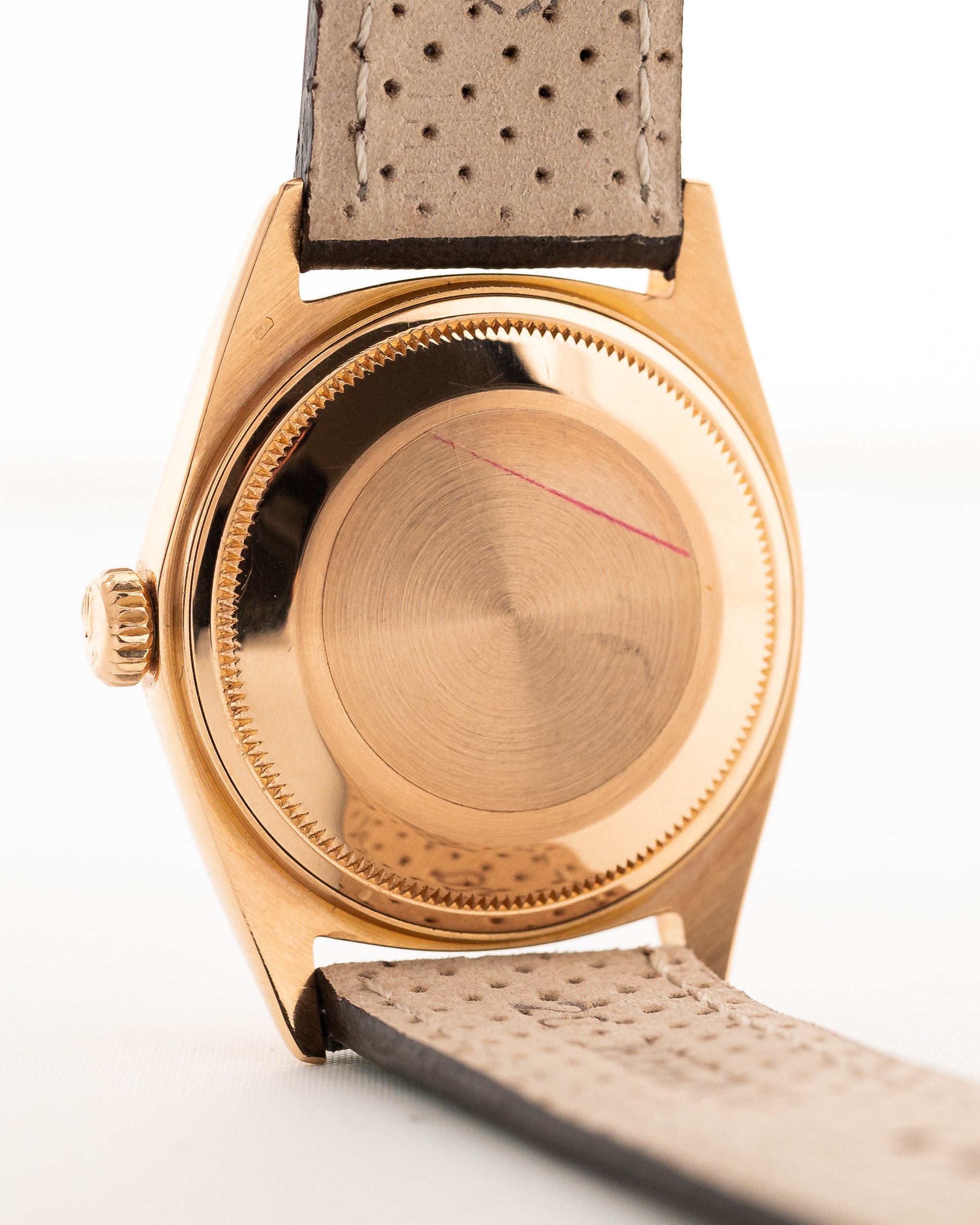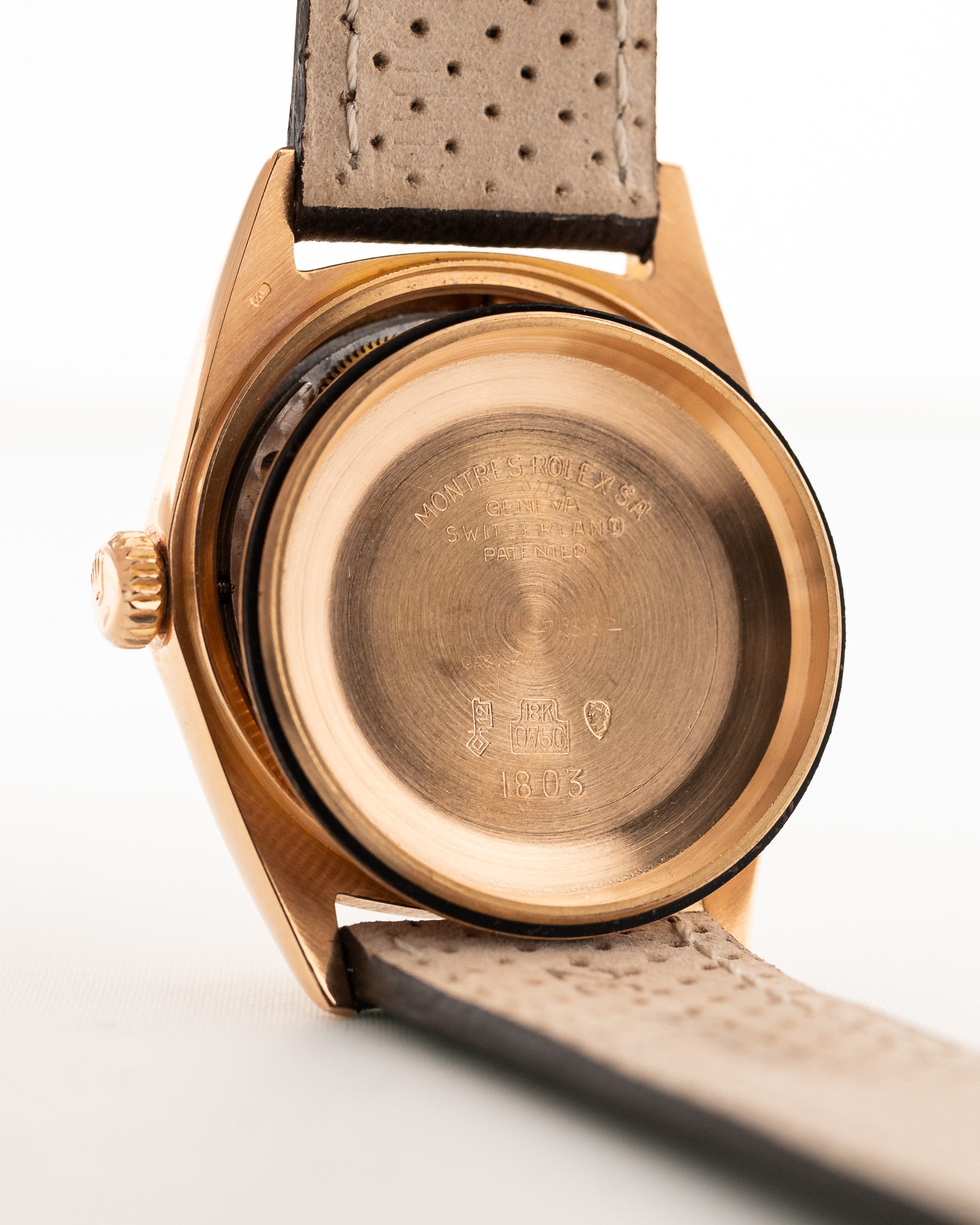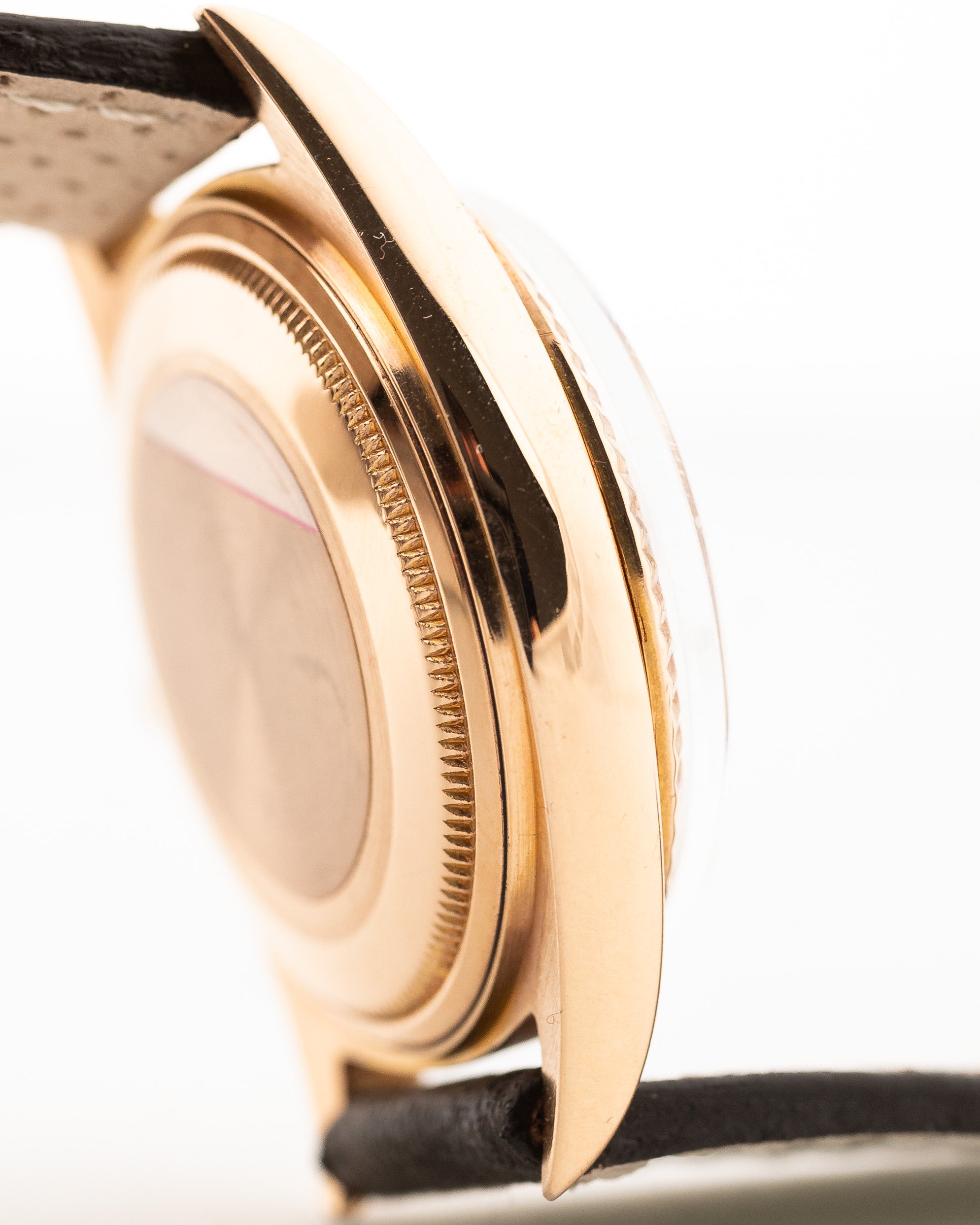 Our Reference (1803 Fluted) is an update to the 6500 and was introduced in 1959. Early 1800 models had the very rare cal. 1556. Our unpolished reference is even more rare because of the pie pan dial with stick indexes in flawless condition and rare 18k rose gold case.