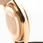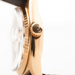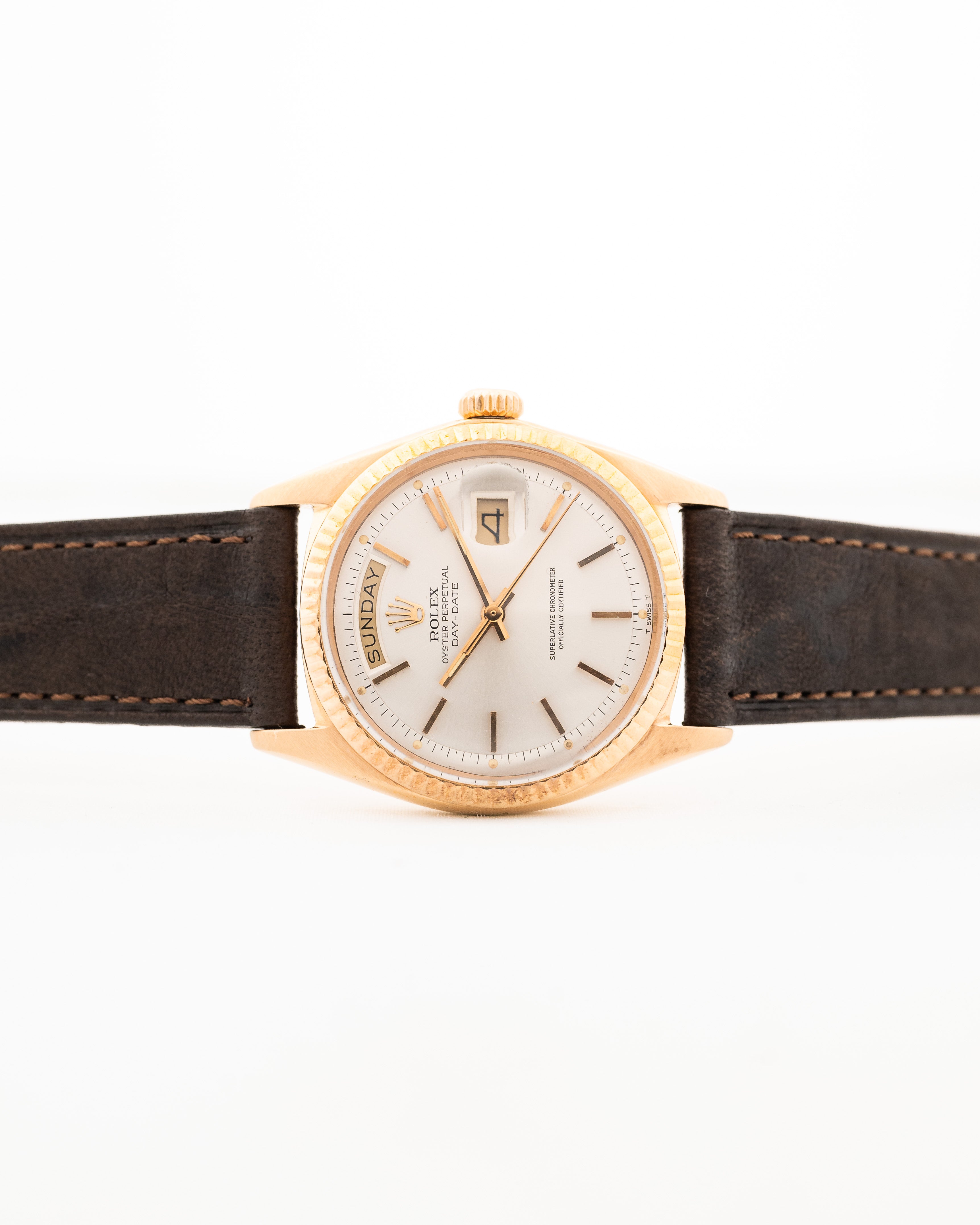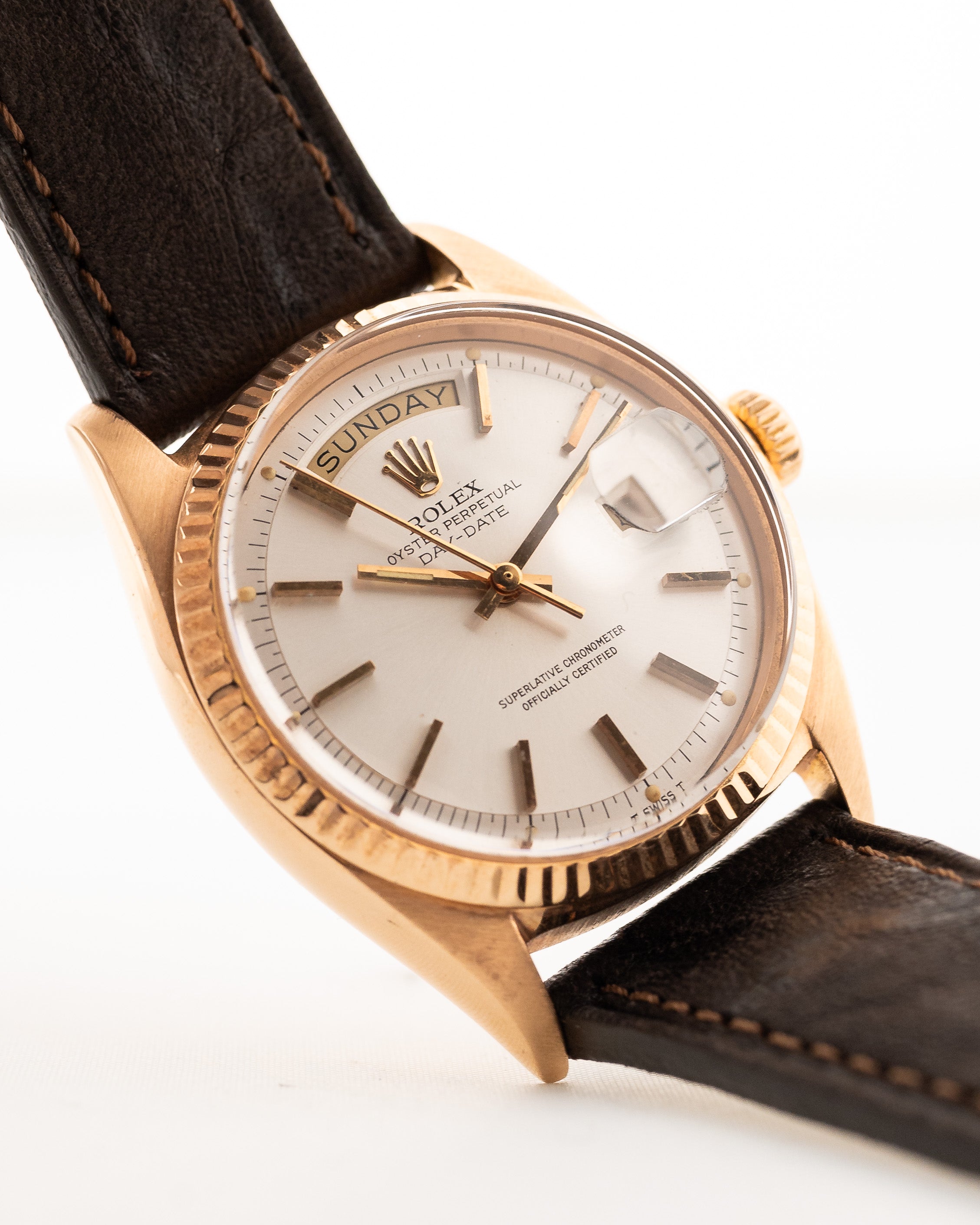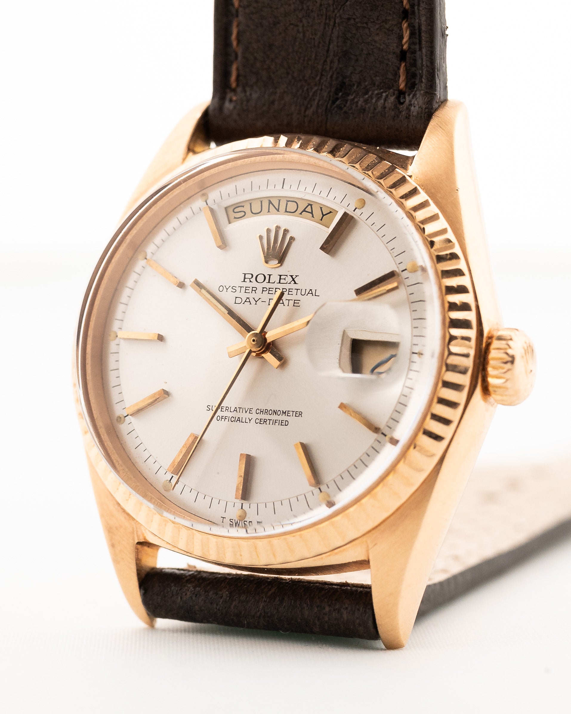 Our Reference (1803 Fluted) is an update to the 6500 and was introduced in 1959. Early 1800 models had the very rare cal. 1556. Our unpolished reference is even more rare because of the pie pan dial with stick indexes in flawless condition and rare 18k rose gold case.