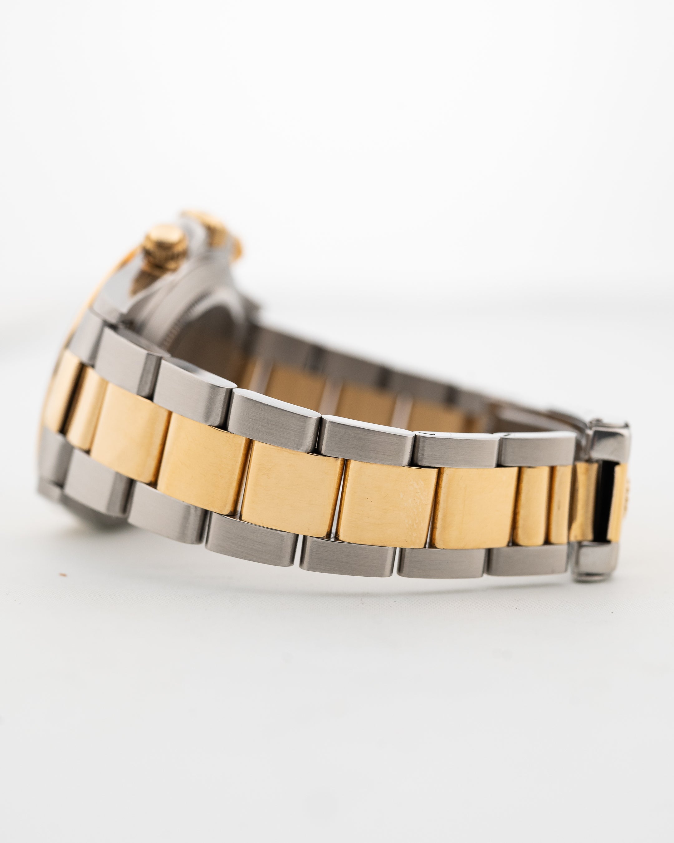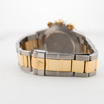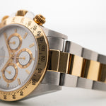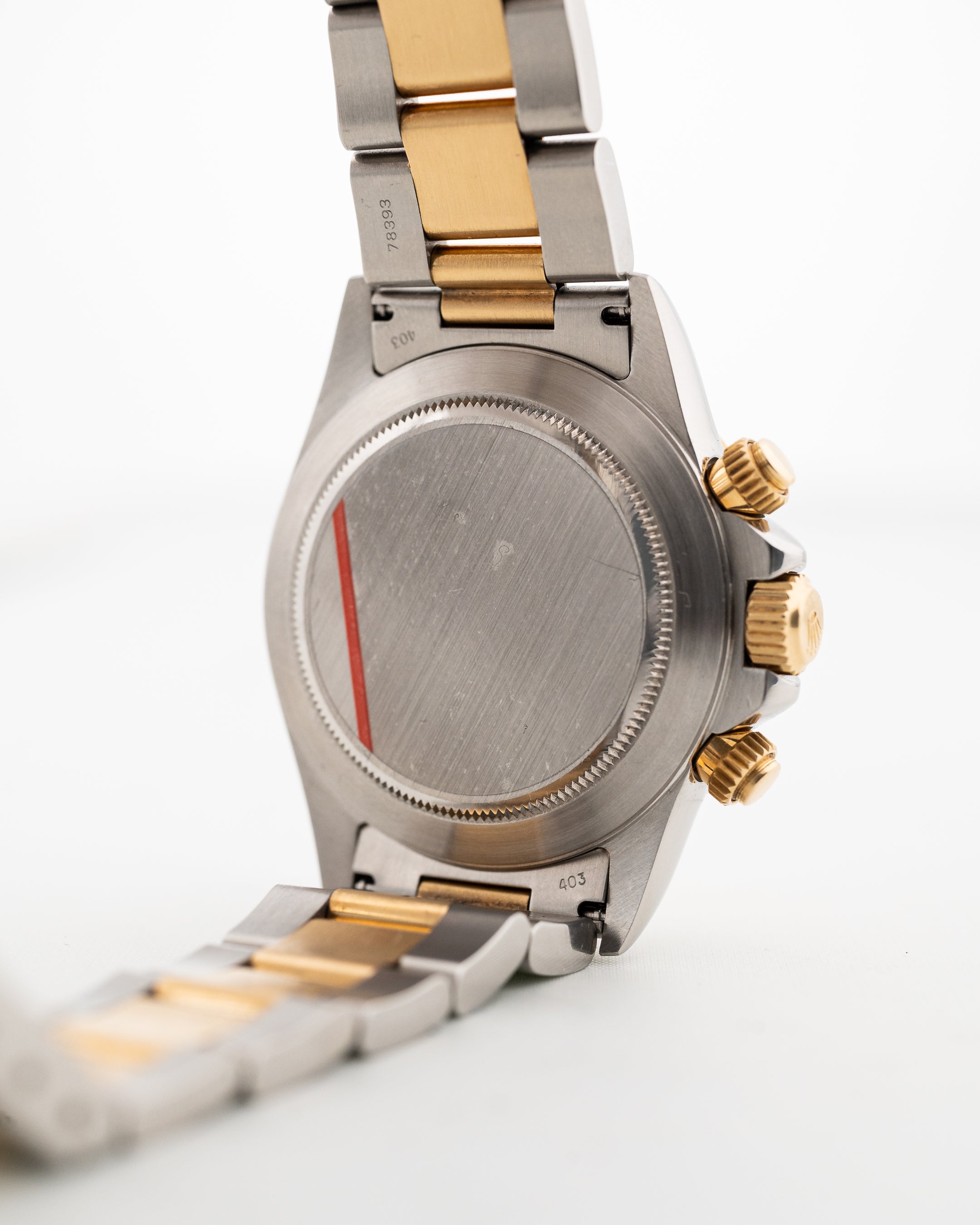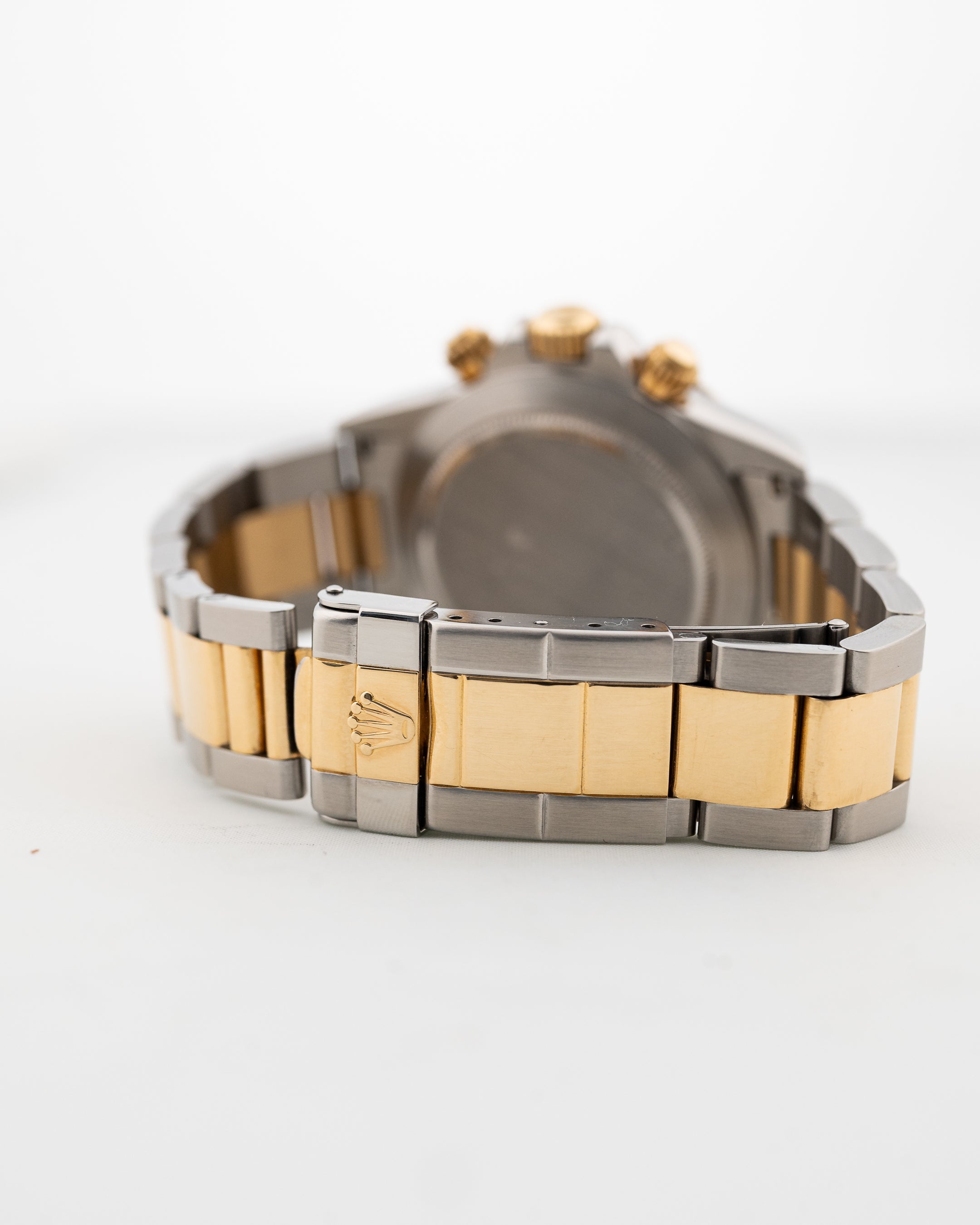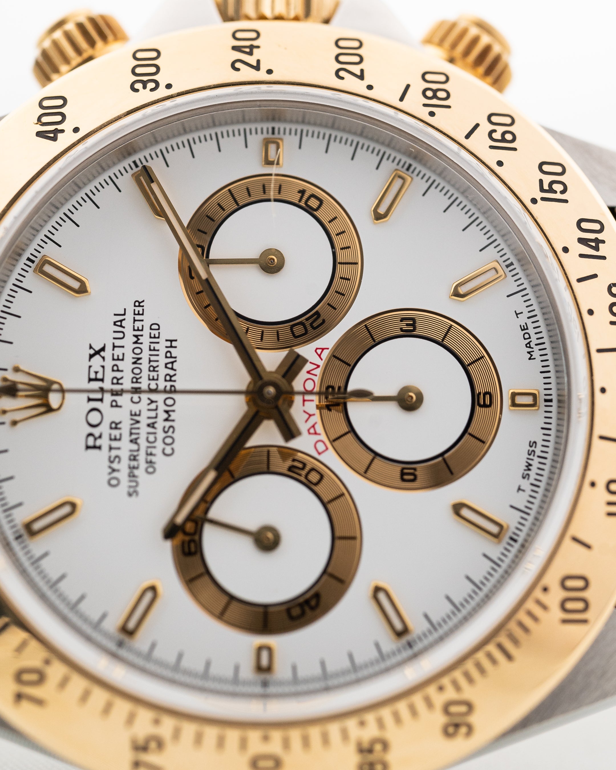Our Ref. 16523 with a white dial, gold registers and two tone case comes in perfect condition and was professionally serviced including a 1-year warranty.
