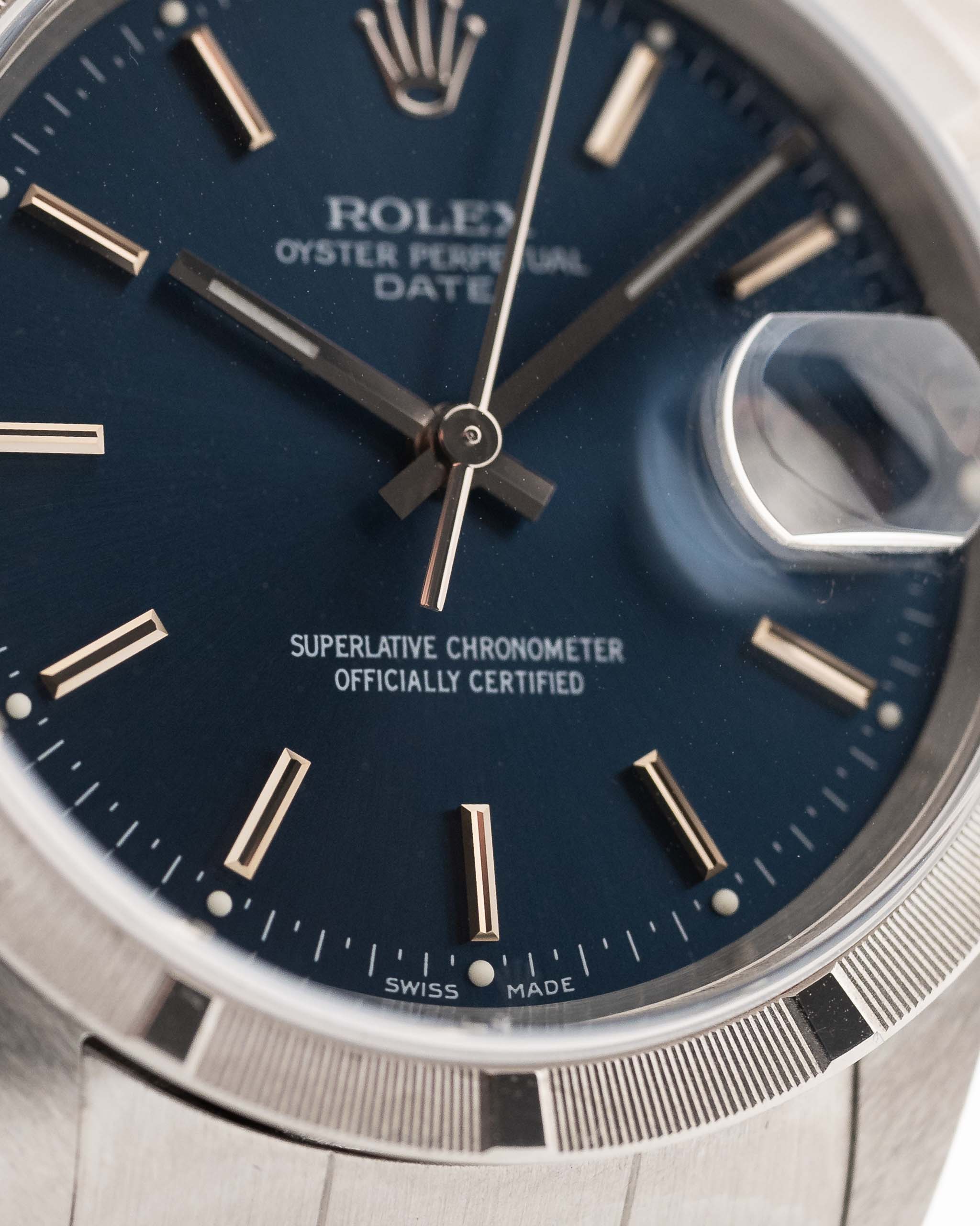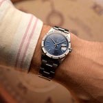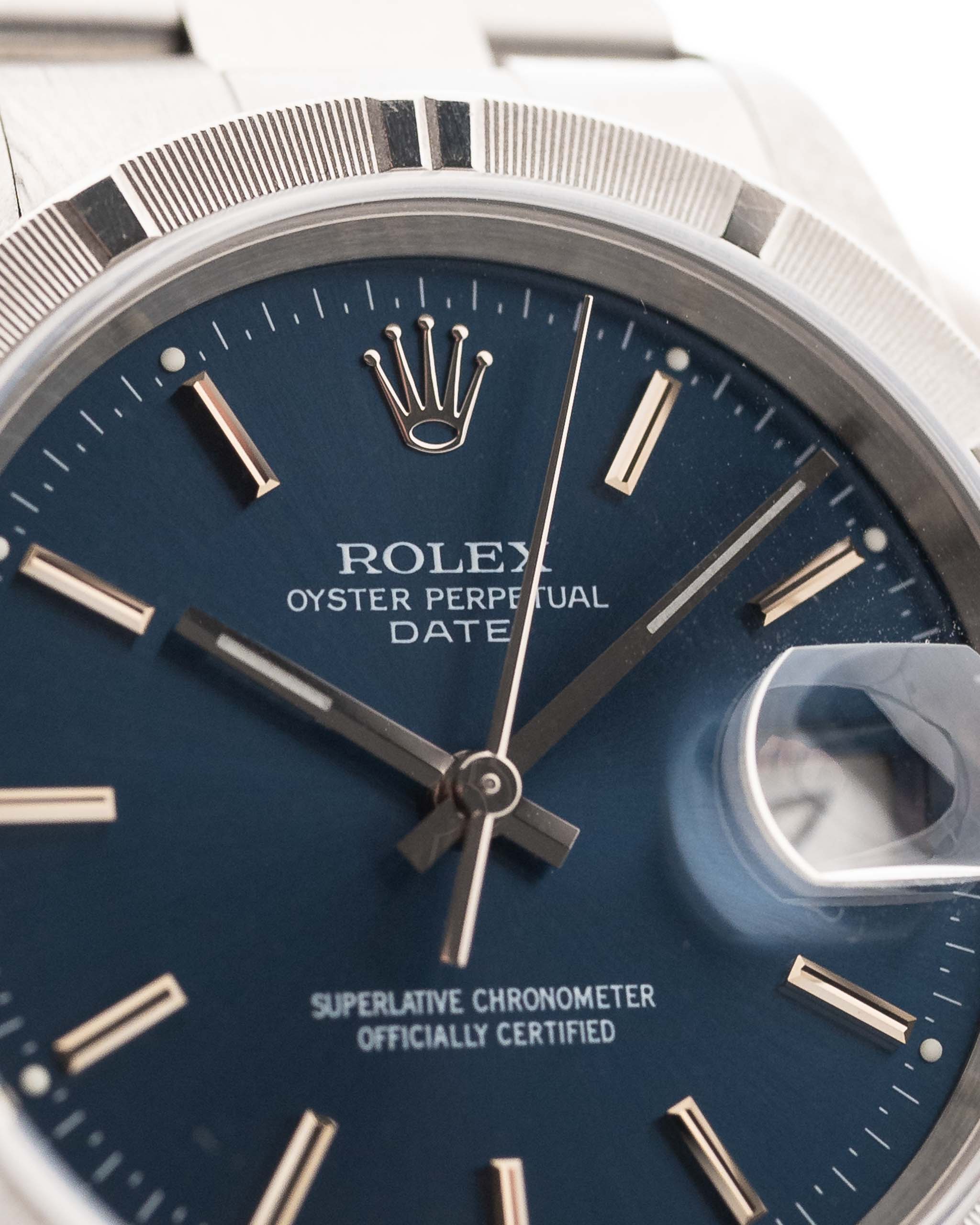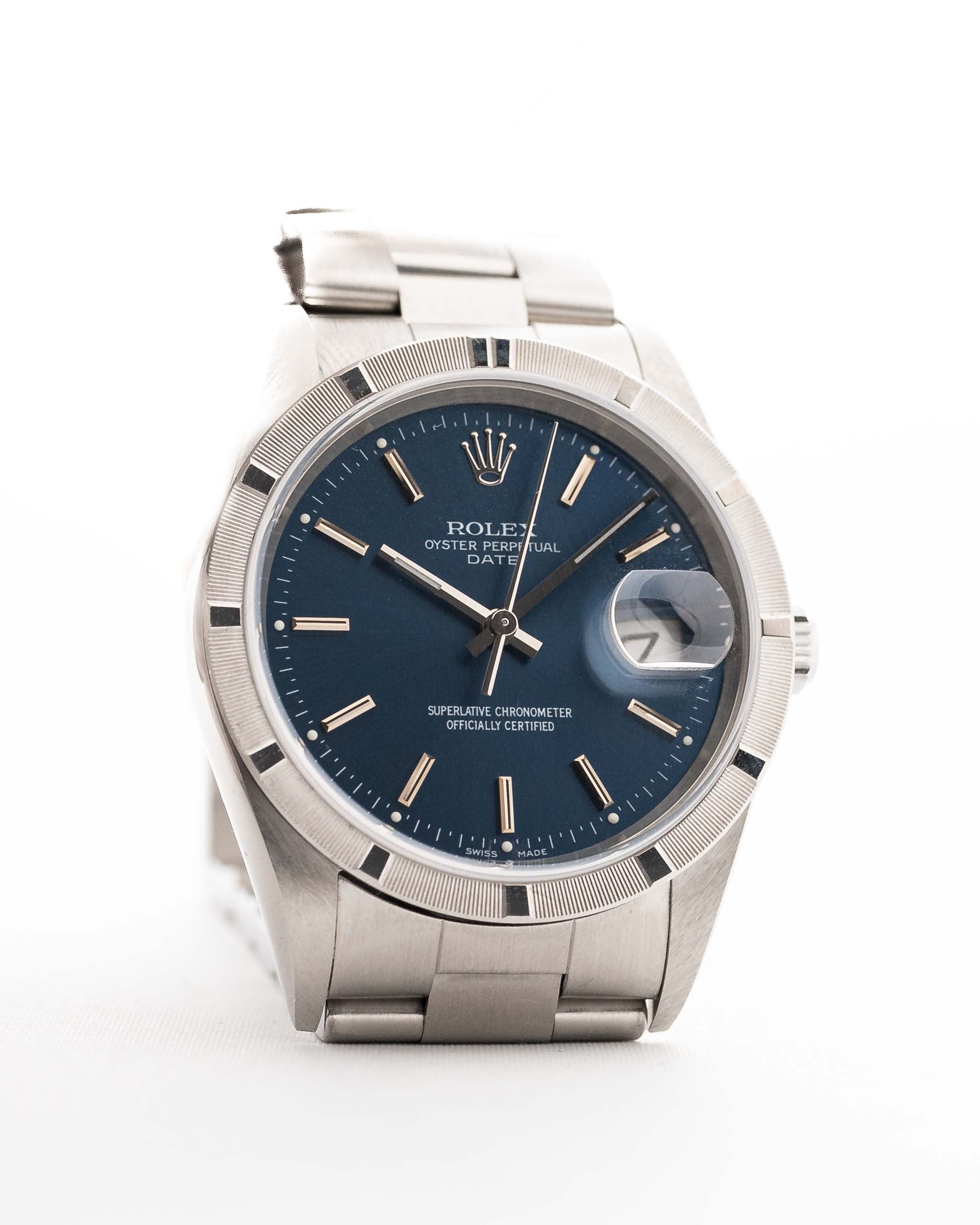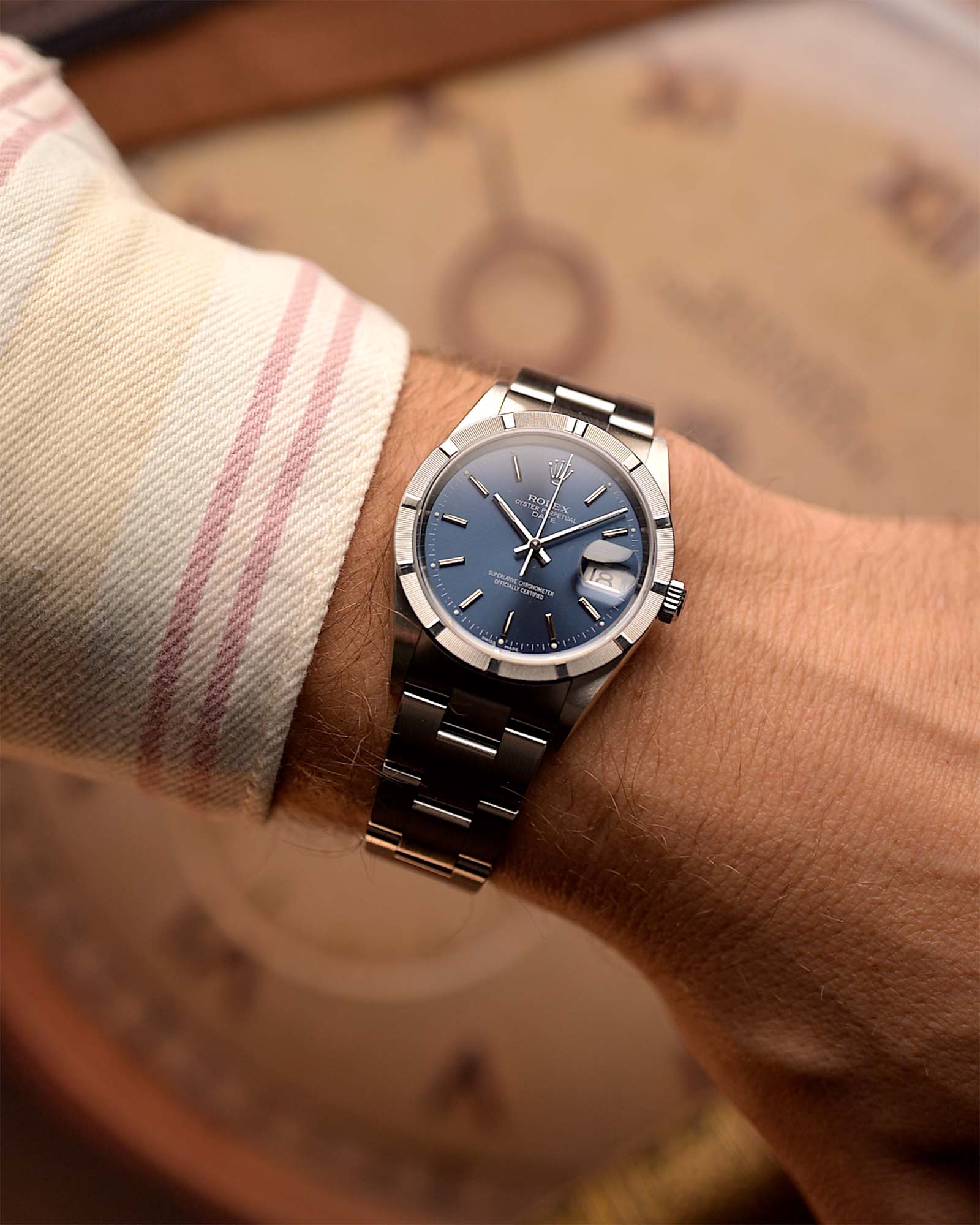 The rare deep blue dial catches the light beautifully and is framed by a refined engine-turned bezel, adding a subtle vintage edge. Measuring 34mm, the stainless steel Oyster case wears perfectly for both modern and classic tastes – sporty yet refined.