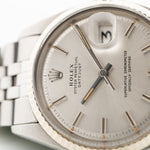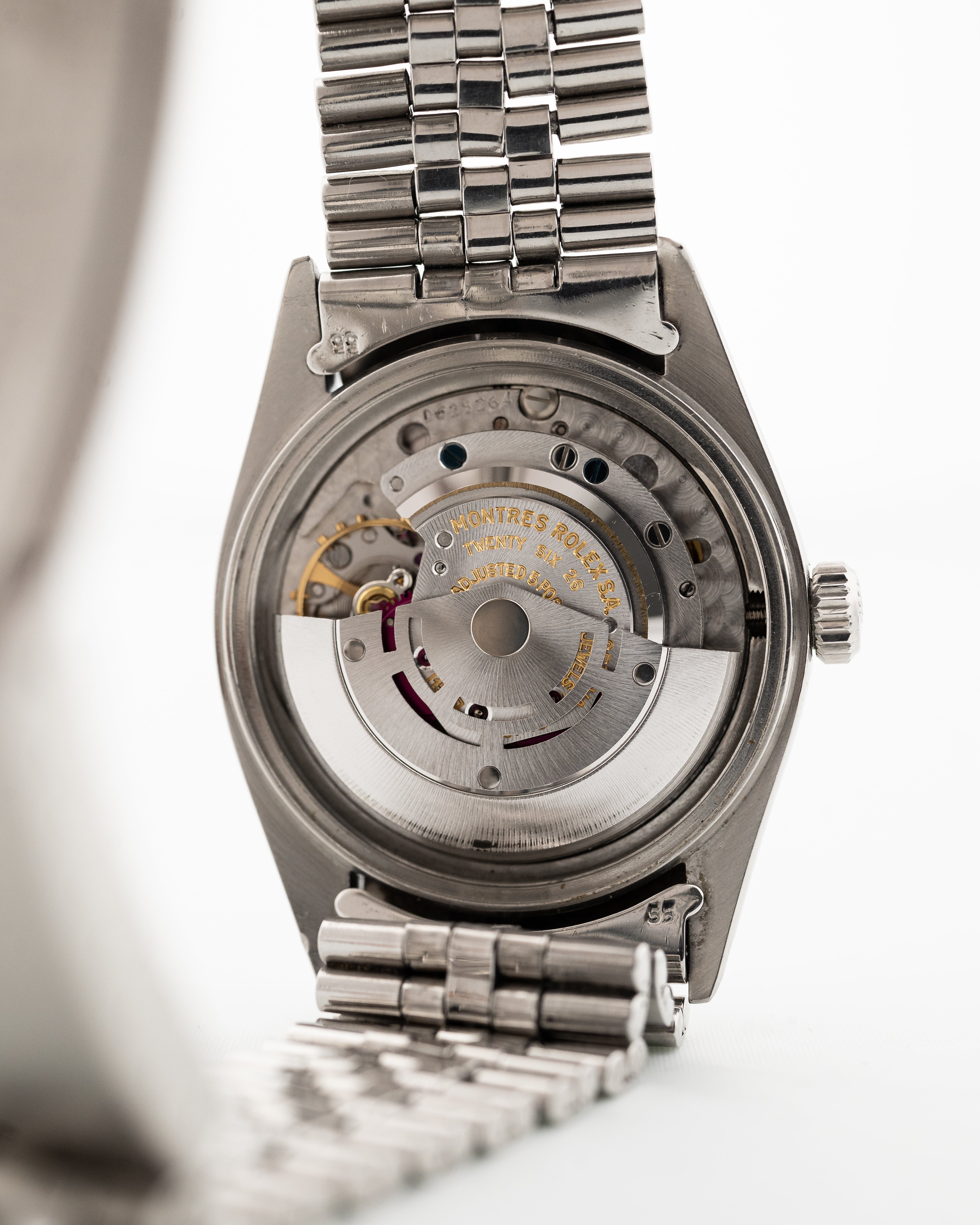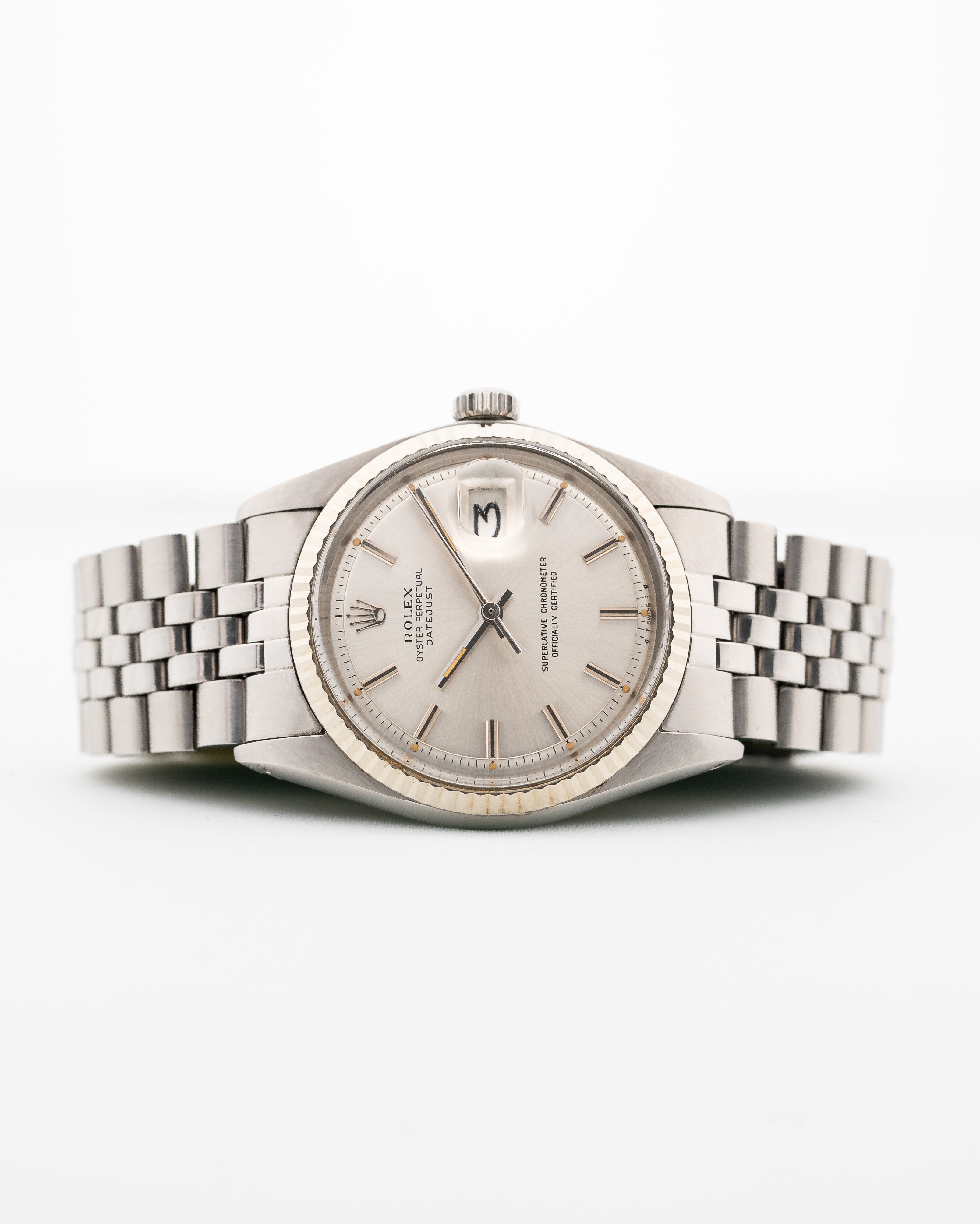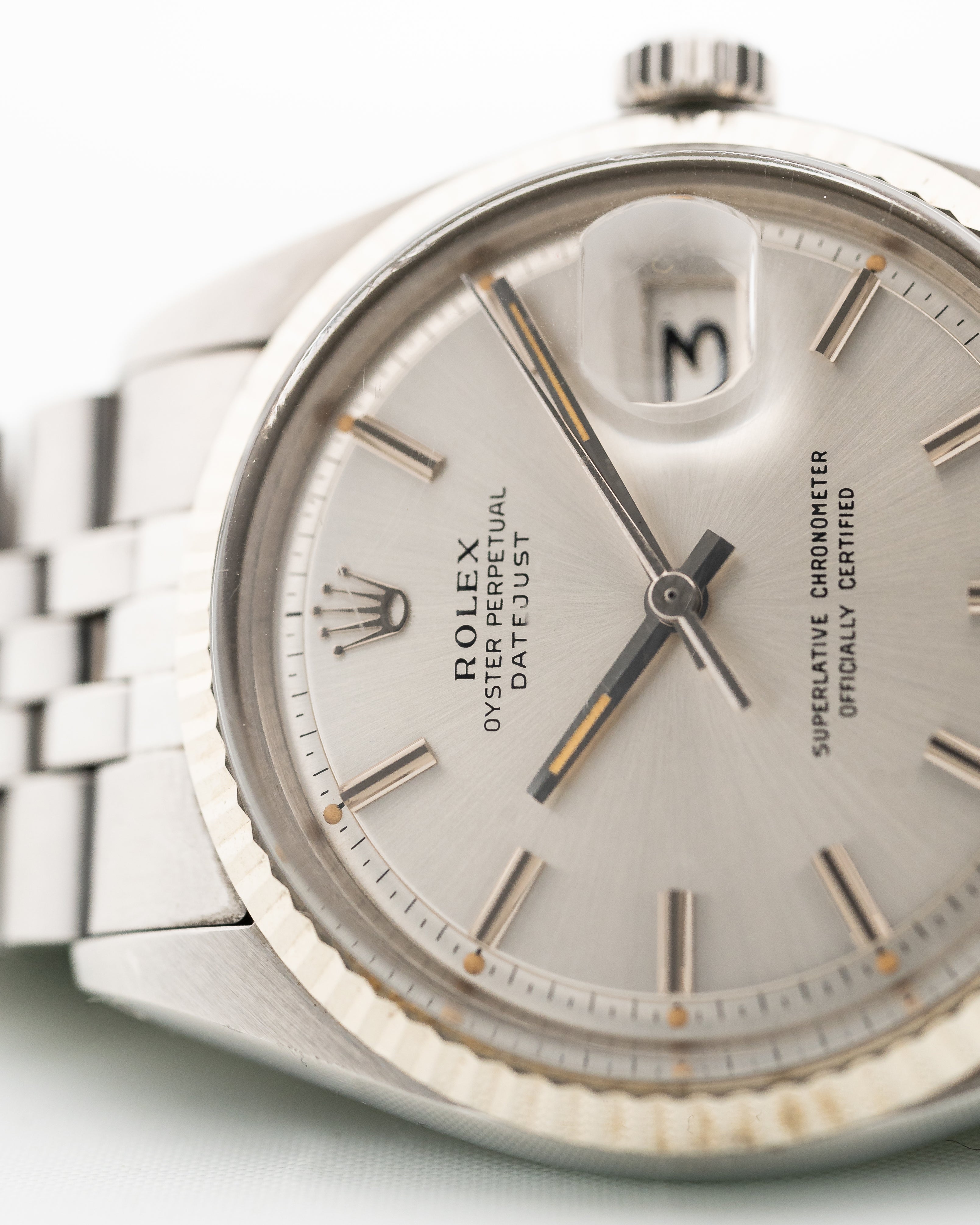 This particular piece from 1974 is notable for its 18k white gold fluted bezel, a flawless silver sunburst pie pan dial and a very strong case with sharp edges in outstanding condition.