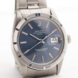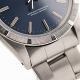 Encased in durable stainless steel, featuring a flat engine-turned bezel, and adorned with a serene ocean blue dial, complemented by steel hands and hour markers, this watch epitomizes simplicity and elegance.