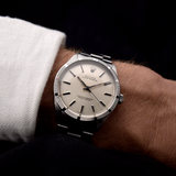 A solid stainless steel case with the flat engine-turned bezel and a beautiful clean silver colored dial keep the appearance simple and elegant.
