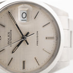 The Rolex Oysterdate Precision is a real "under the radar" piece. It was introduced as the 6694 in the early 60s and made up until the late 80s. And aesthetically, this Rolex is timeless and gorgeous with 35 mm but it wears bigger. It has a classy, elegant look that seems suitable for the tennis court, a business meeting or any number of casual settings.