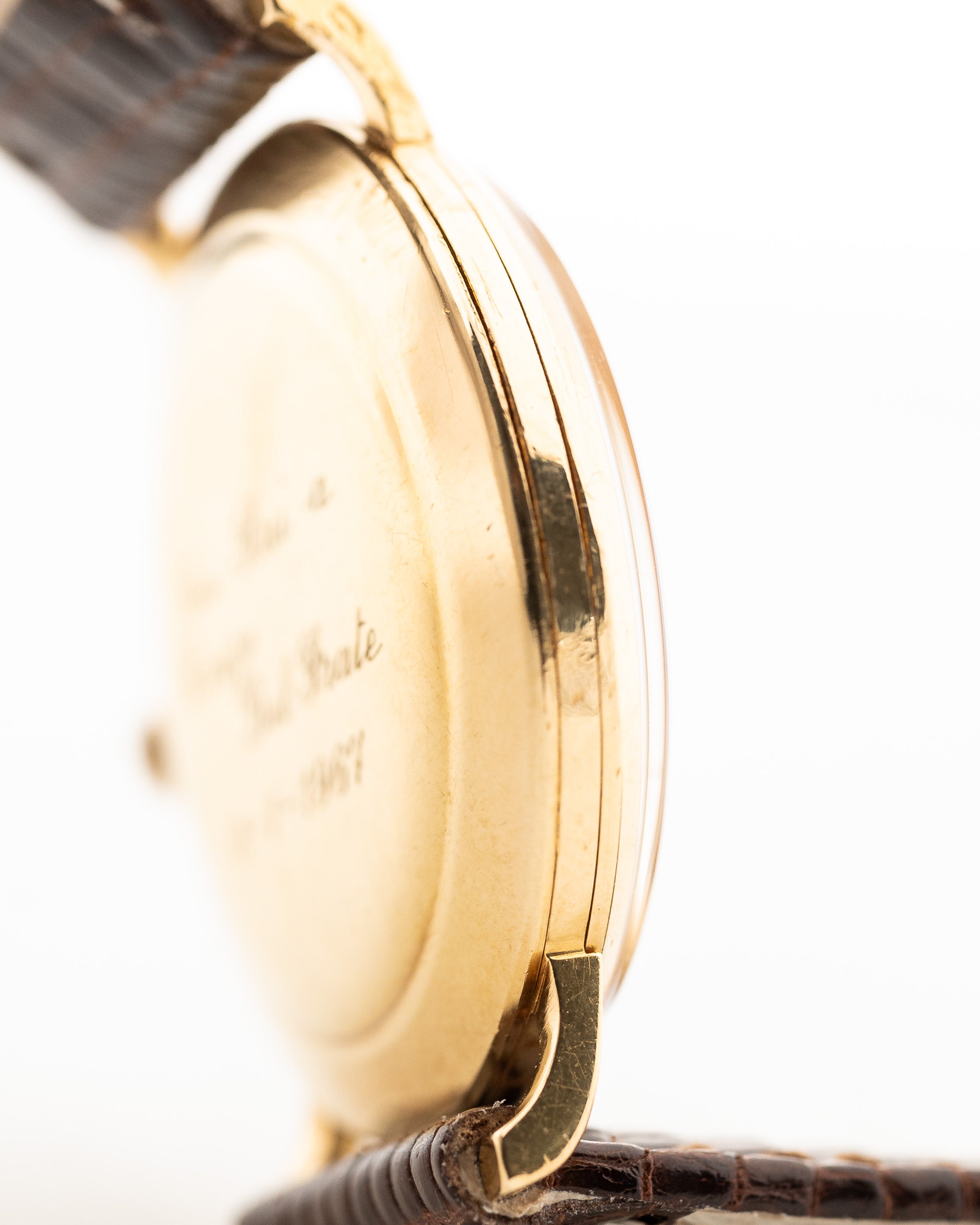This particular piece is carrying some extra history on the case back with the engraving "La Rai a Renzo Del Frate 8.-1-1967". Unfortunately we don't have any more information on this engraving, but is seems to be a name and can easily polished away, if wanted.