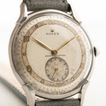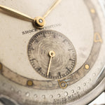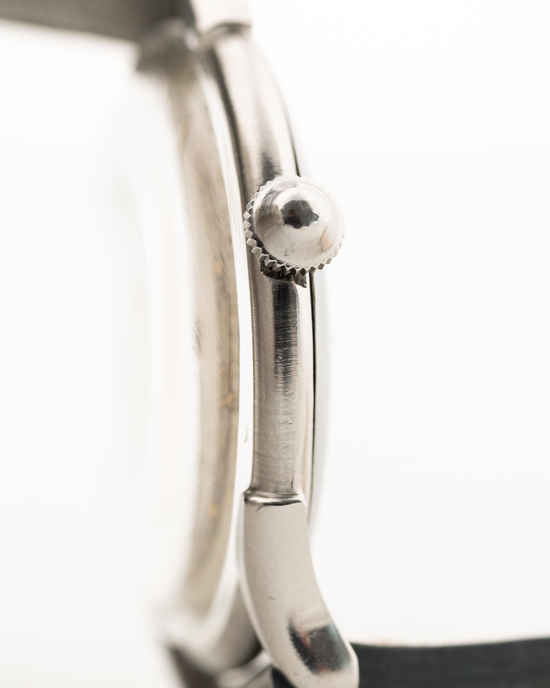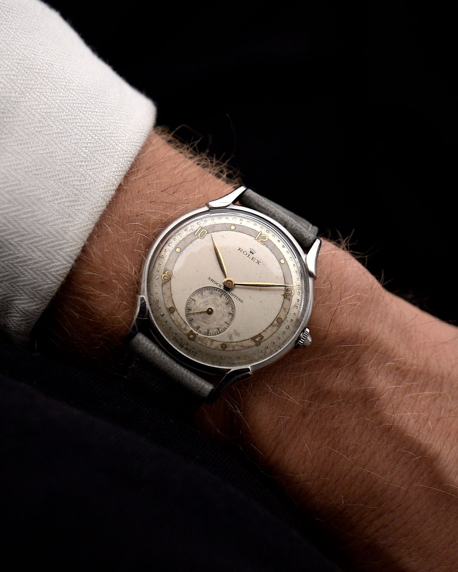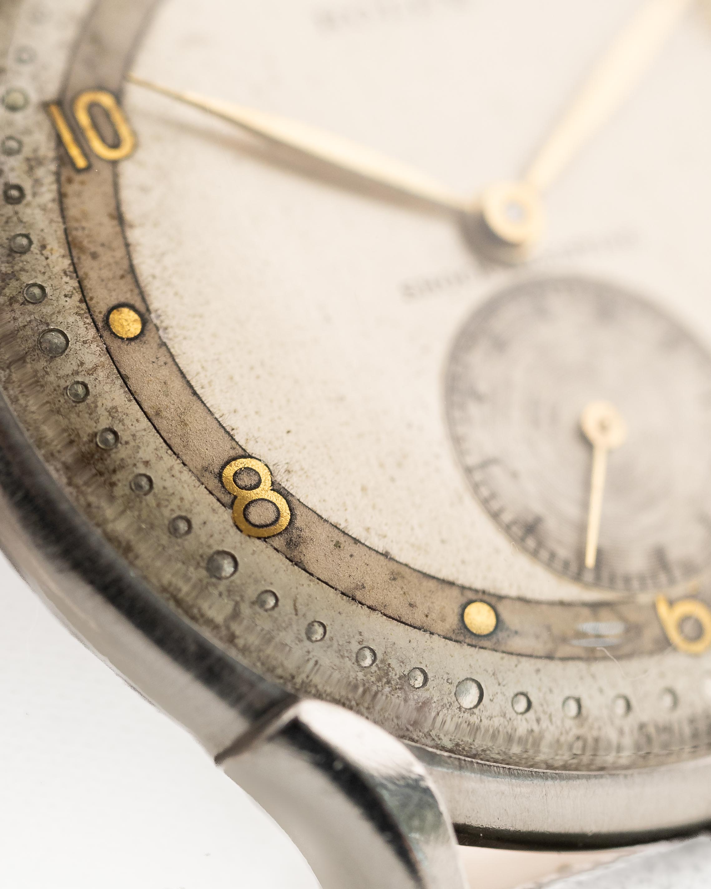 With the silver two tone sub second dial with art deco numerals, golden leaf hands, silver dot minute track this beauty is still striking a figure 80 years after production. The mushroom crown and curved lugs are the icing on the cake.