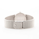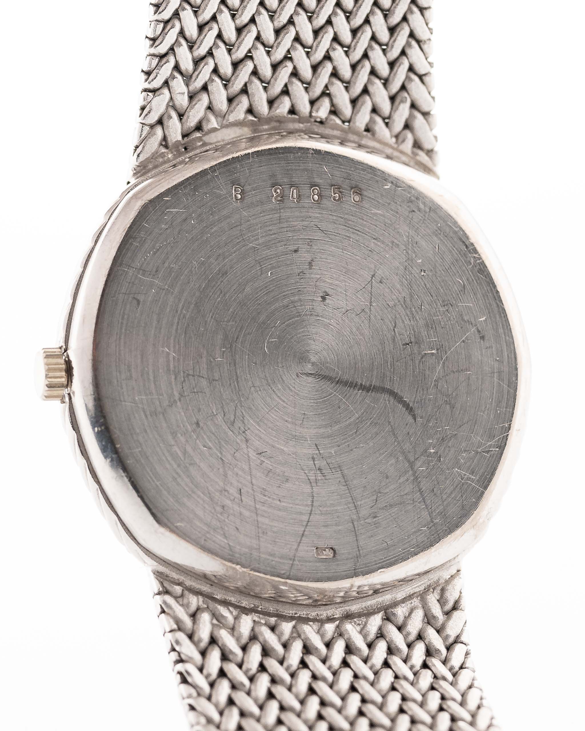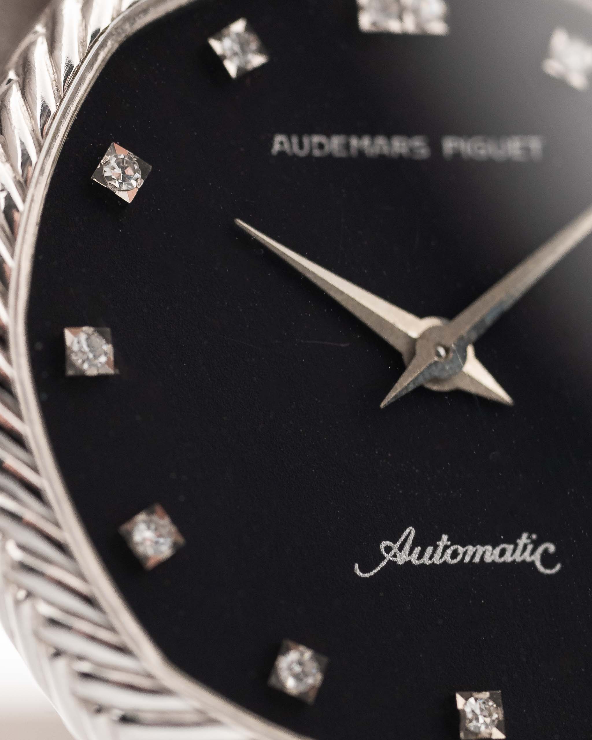 This rare Audemars Piguet from the late 1970s is an exercise in quiet opulence. Crafted entirely in 18k white gold, its unique octagonal-elliptical case houses a flawless black dial punctuated by twelve factory-set diamond hour markers — understated luxury at its finest.