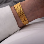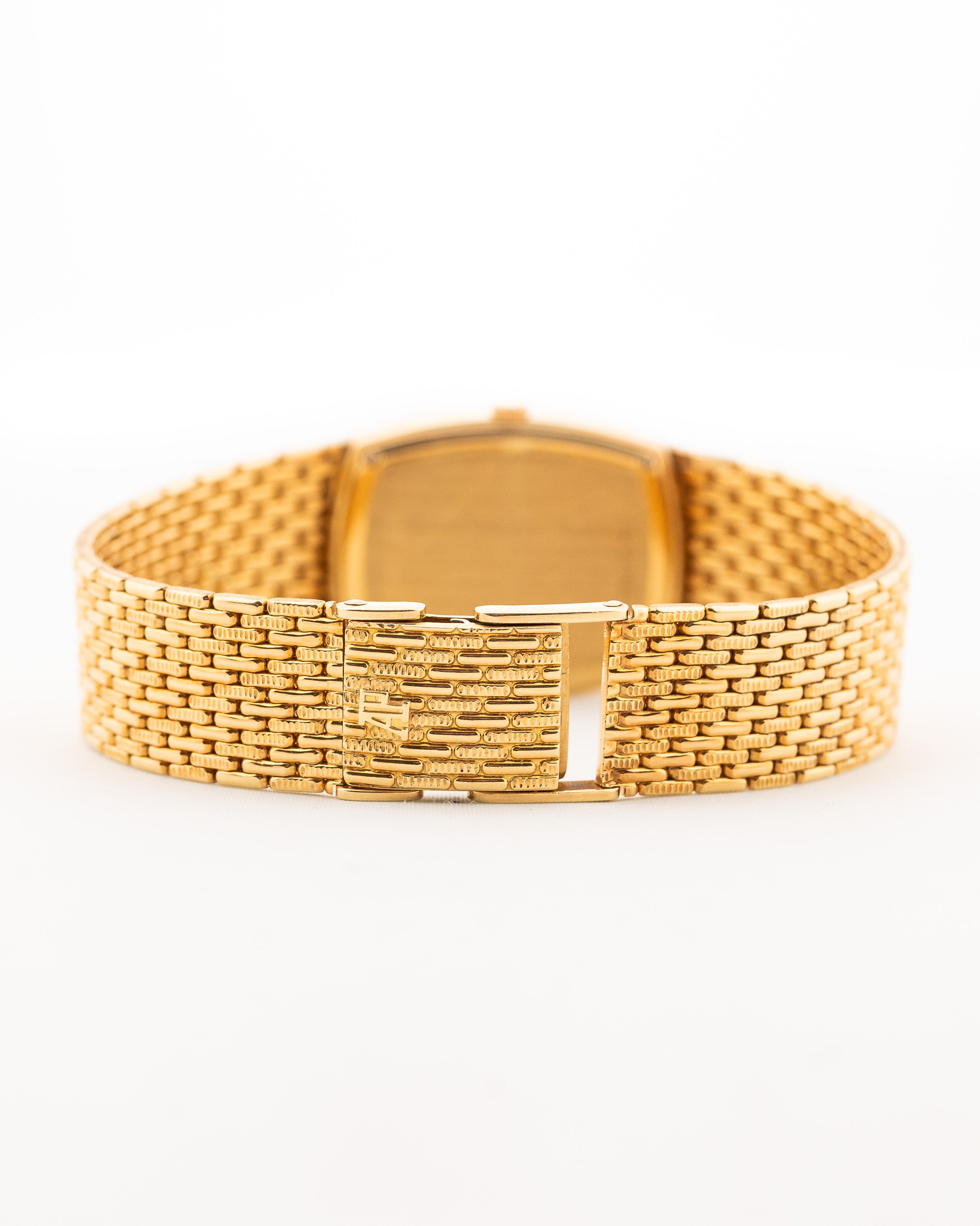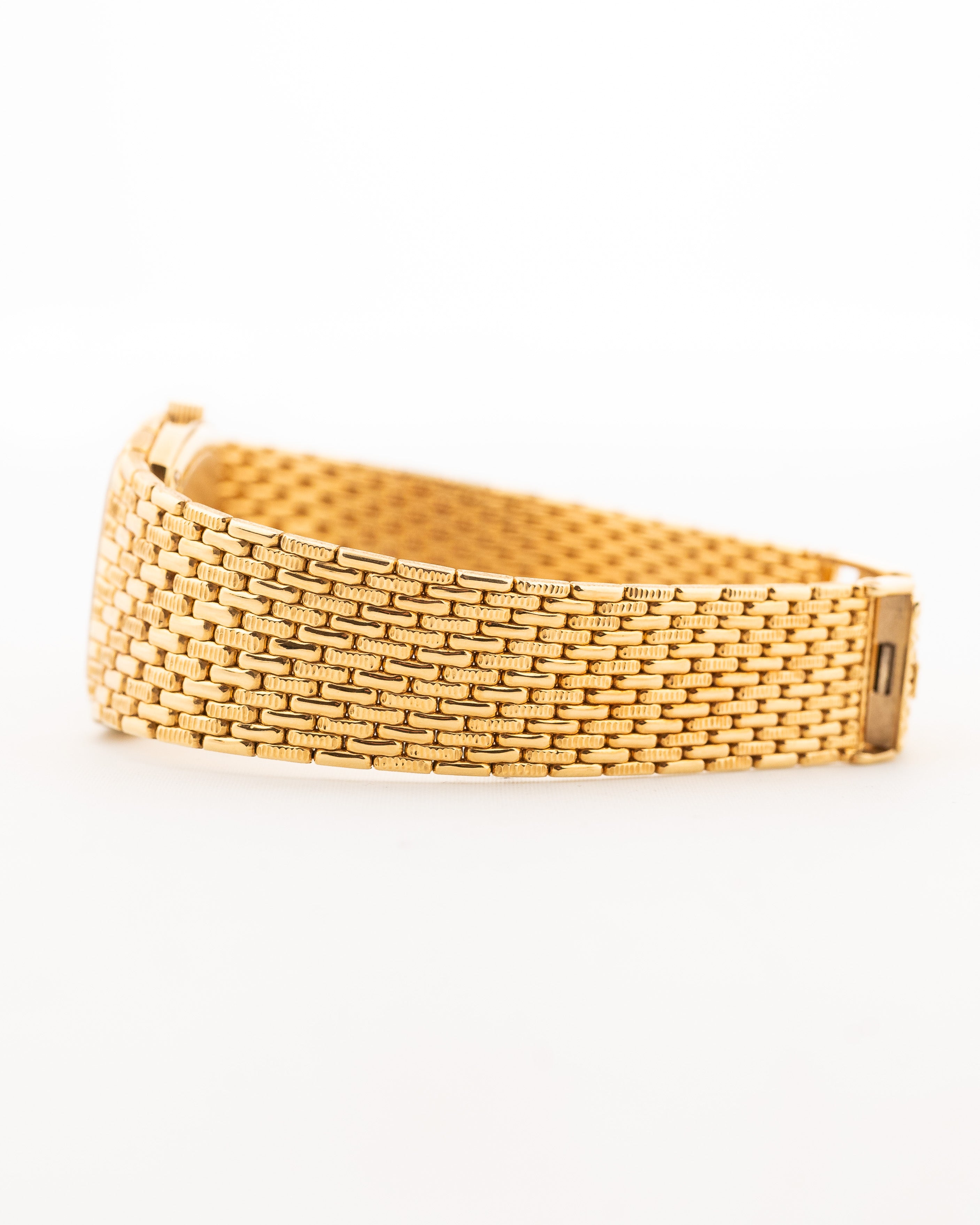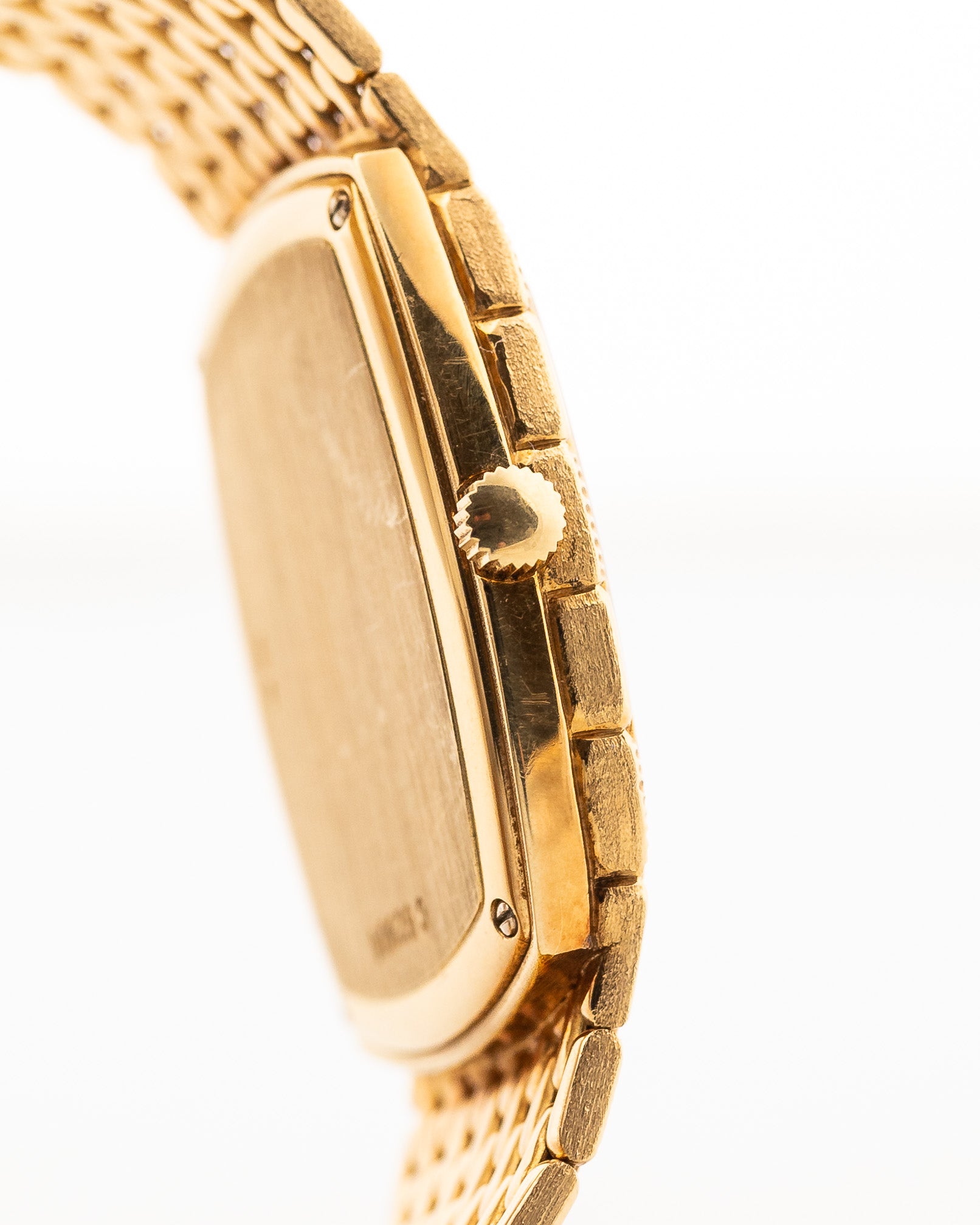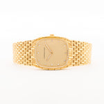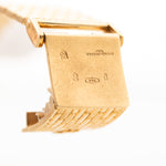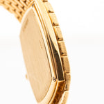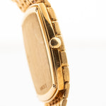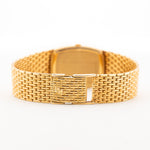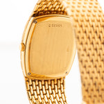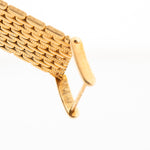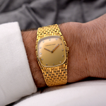 The 18k yellow gold case measuring 27 mm in diameter is in sharp condition and refined with a very unique 18k yellow gold beautifully finished bracelet. The icing on the cake are the diamond studded hands and hour markers.