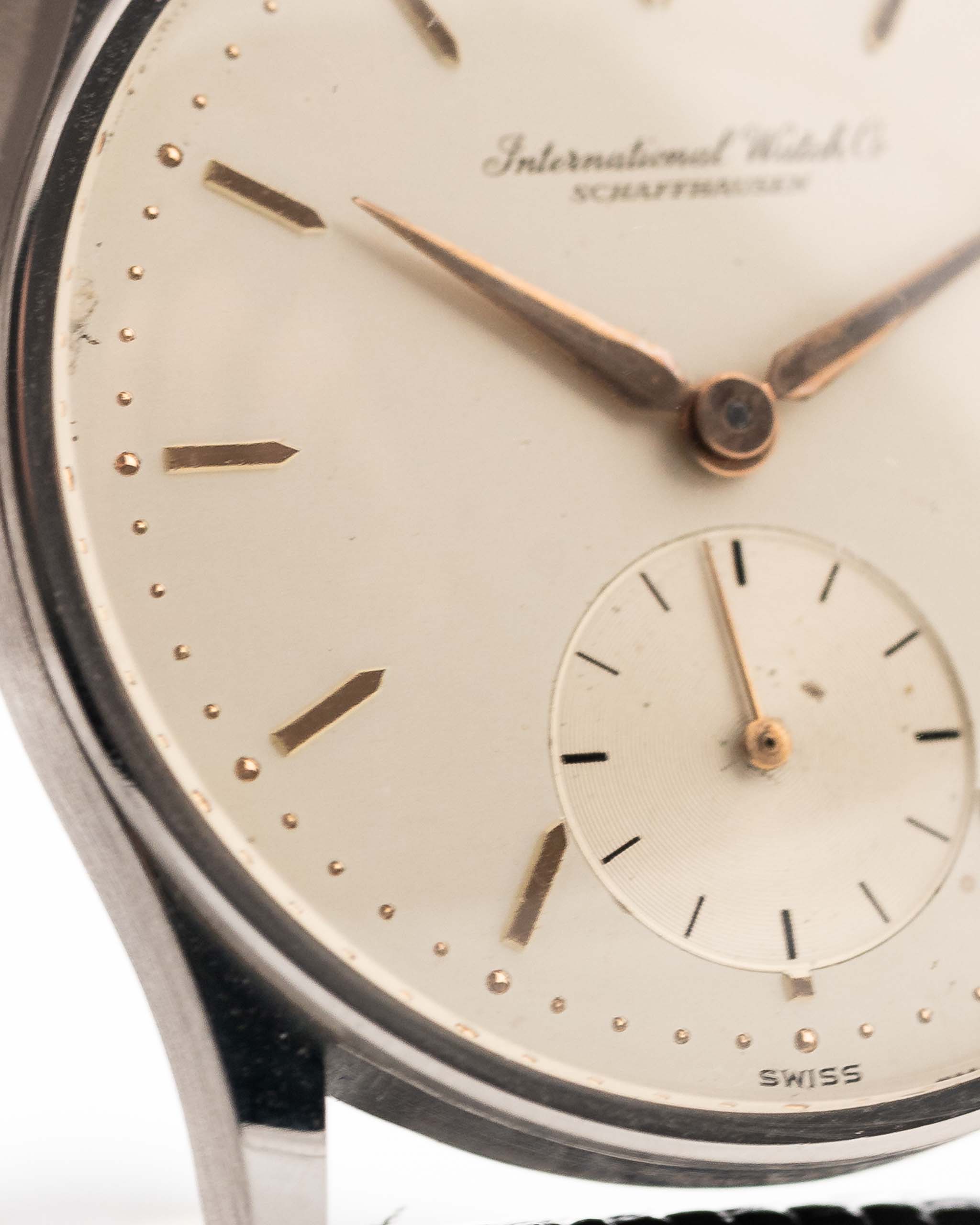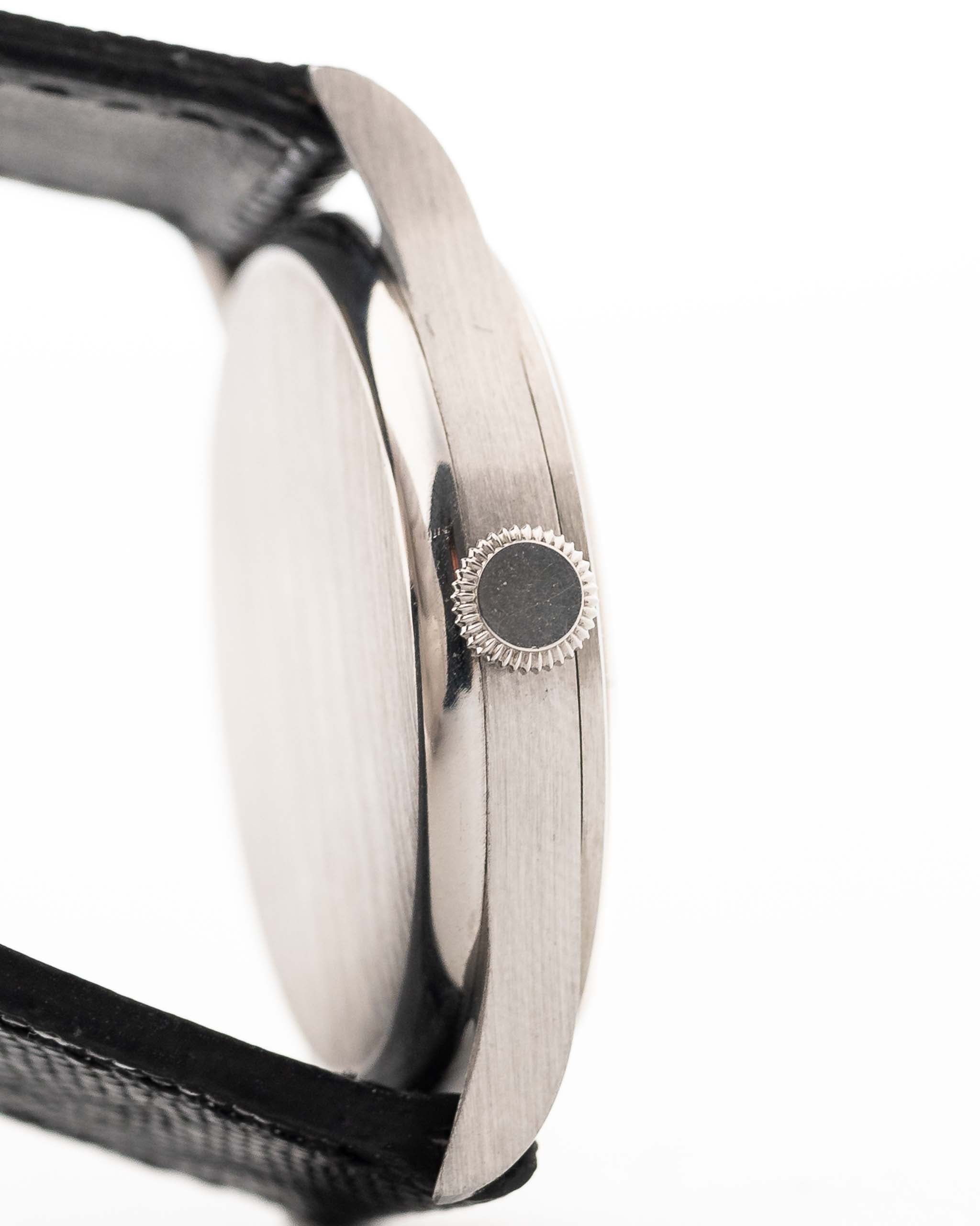 This early IWC dress watch from 1940 is a masterclass in Swiss understatement — where mechanical purity meets refined design. Its beautifully shaped downturned lugs give the stainless steel case a more sculptural presence on the wrist, and the original silver dial with sub seconds at six o’clock embodies a timeless sense of balance and symmetry.