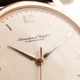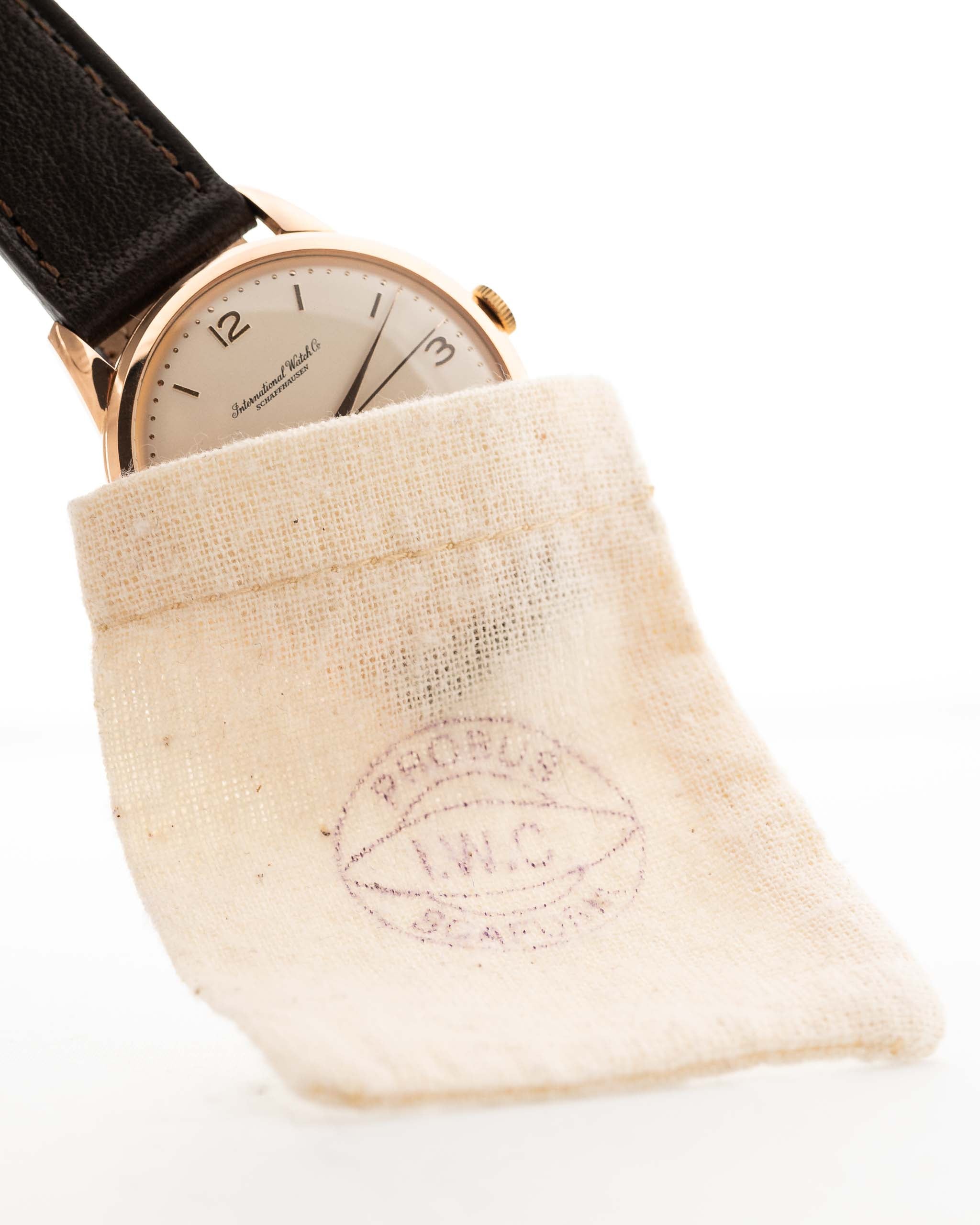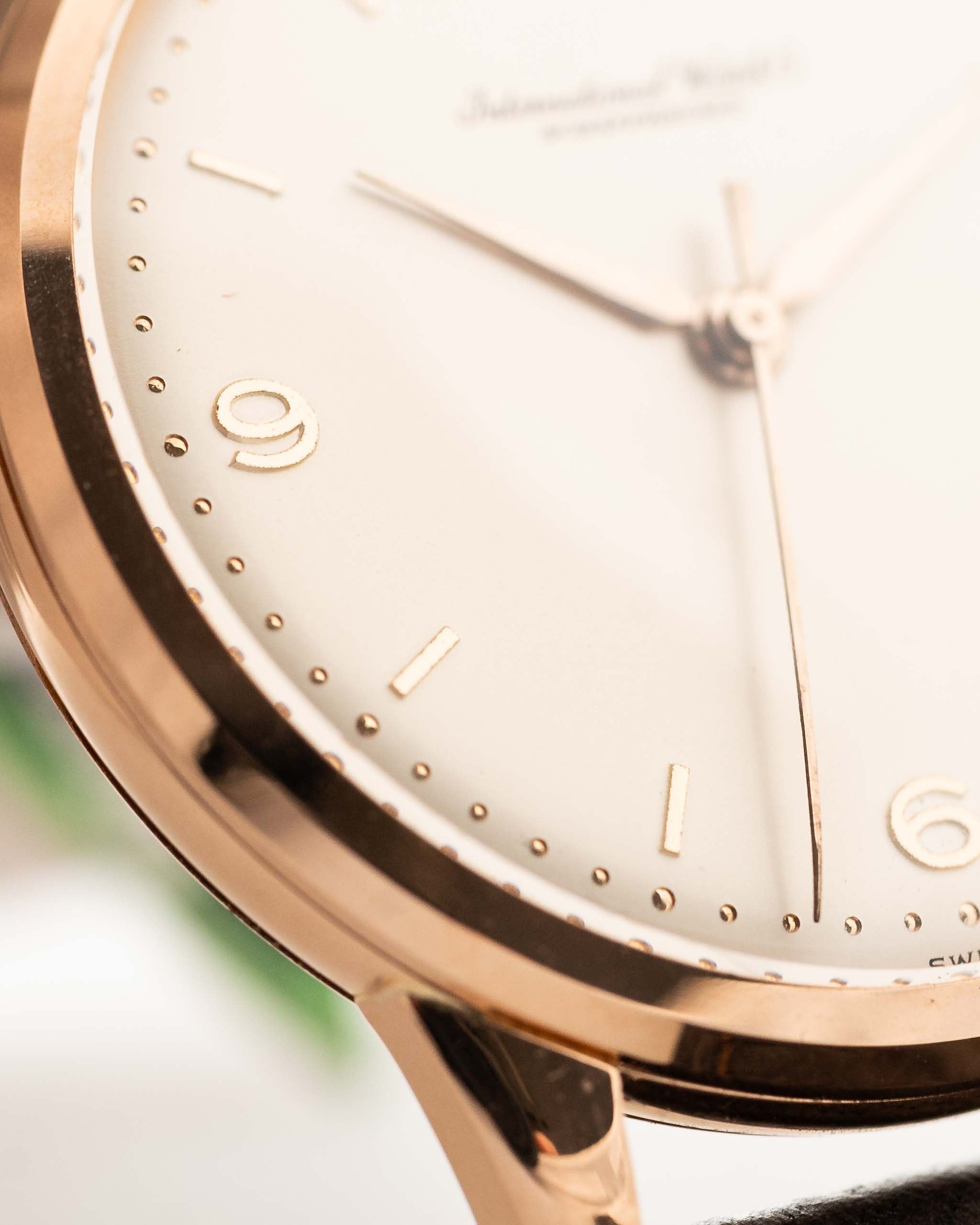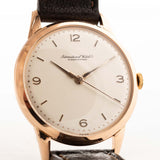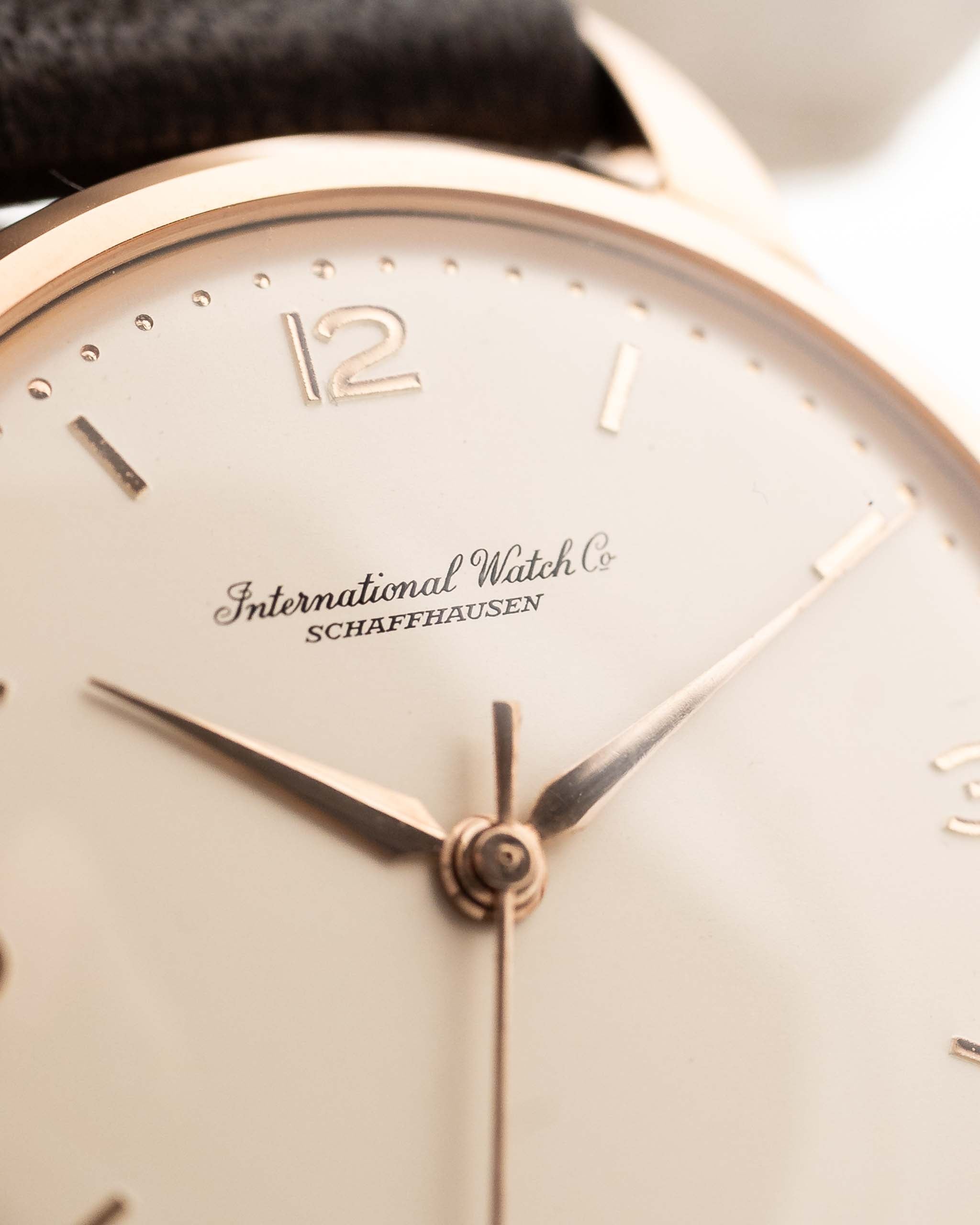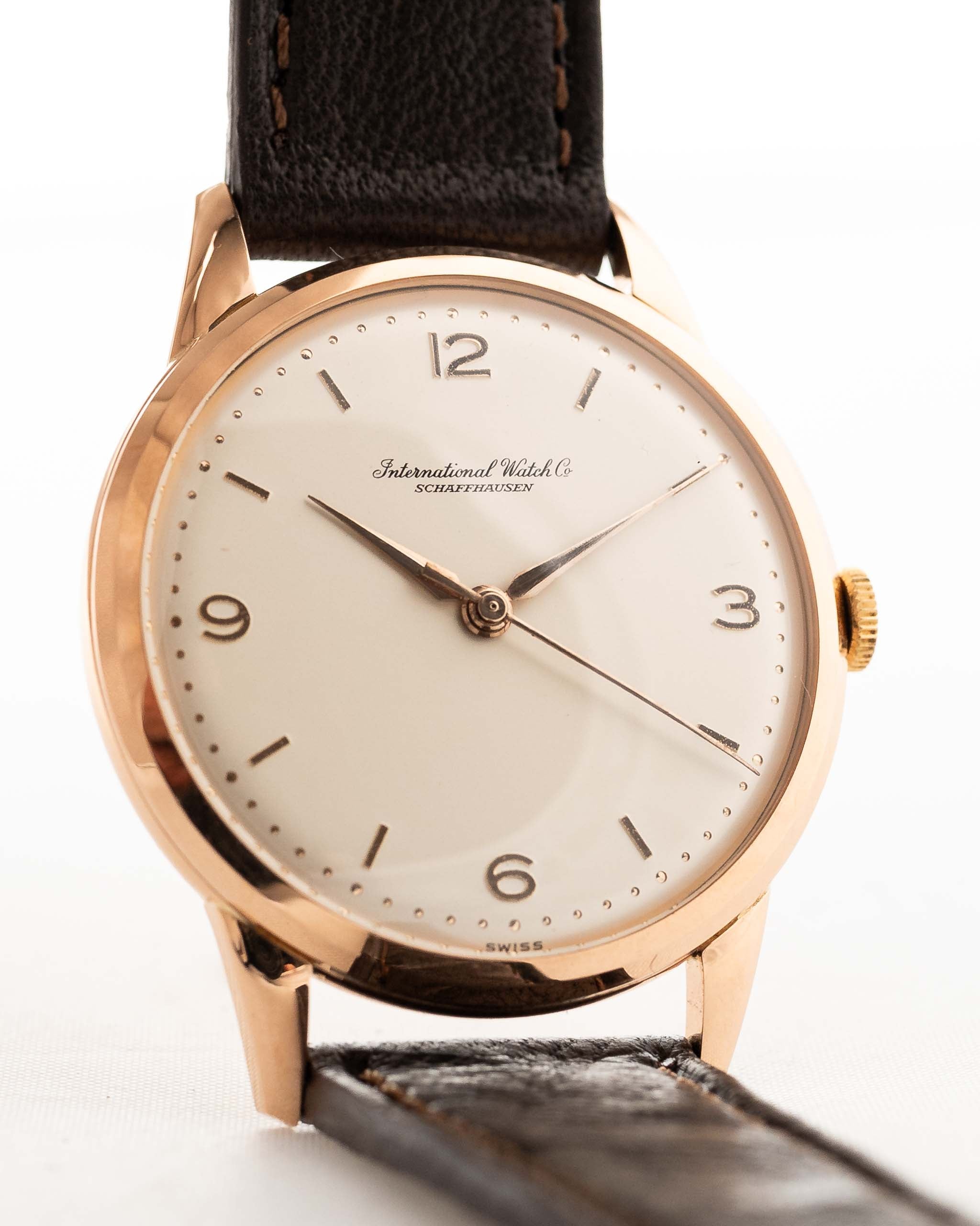 IWC has produced a very wide variety of wristwatches from an early time ranging from dress watches to aviation watches. This example, in 18k rose gold with it's white/silver dial with twelve, three, six nine layout would remain a constant in anyone's collections, especially as it comes with beautiful slight down turned lugs.