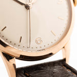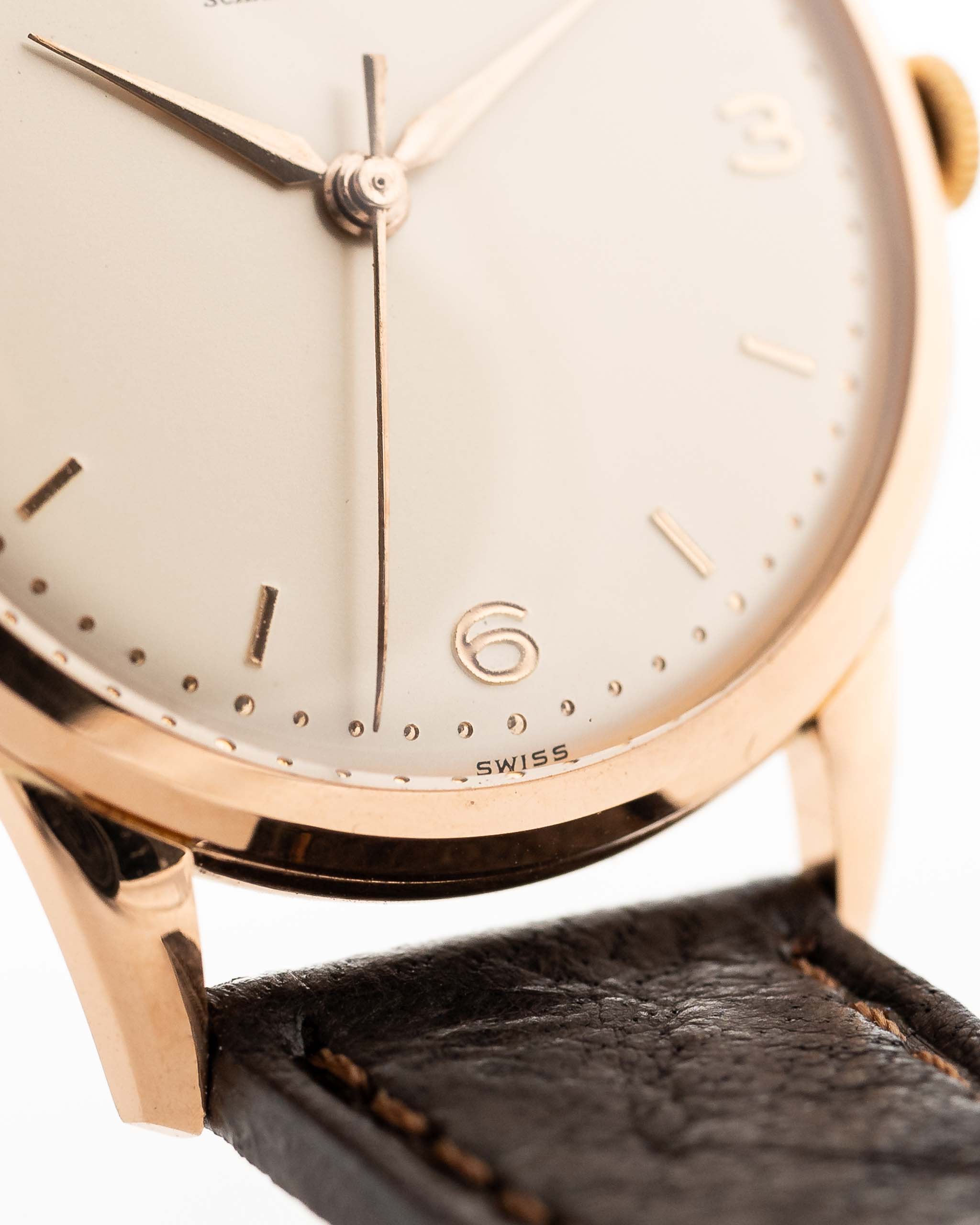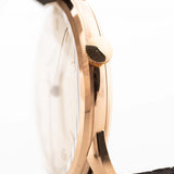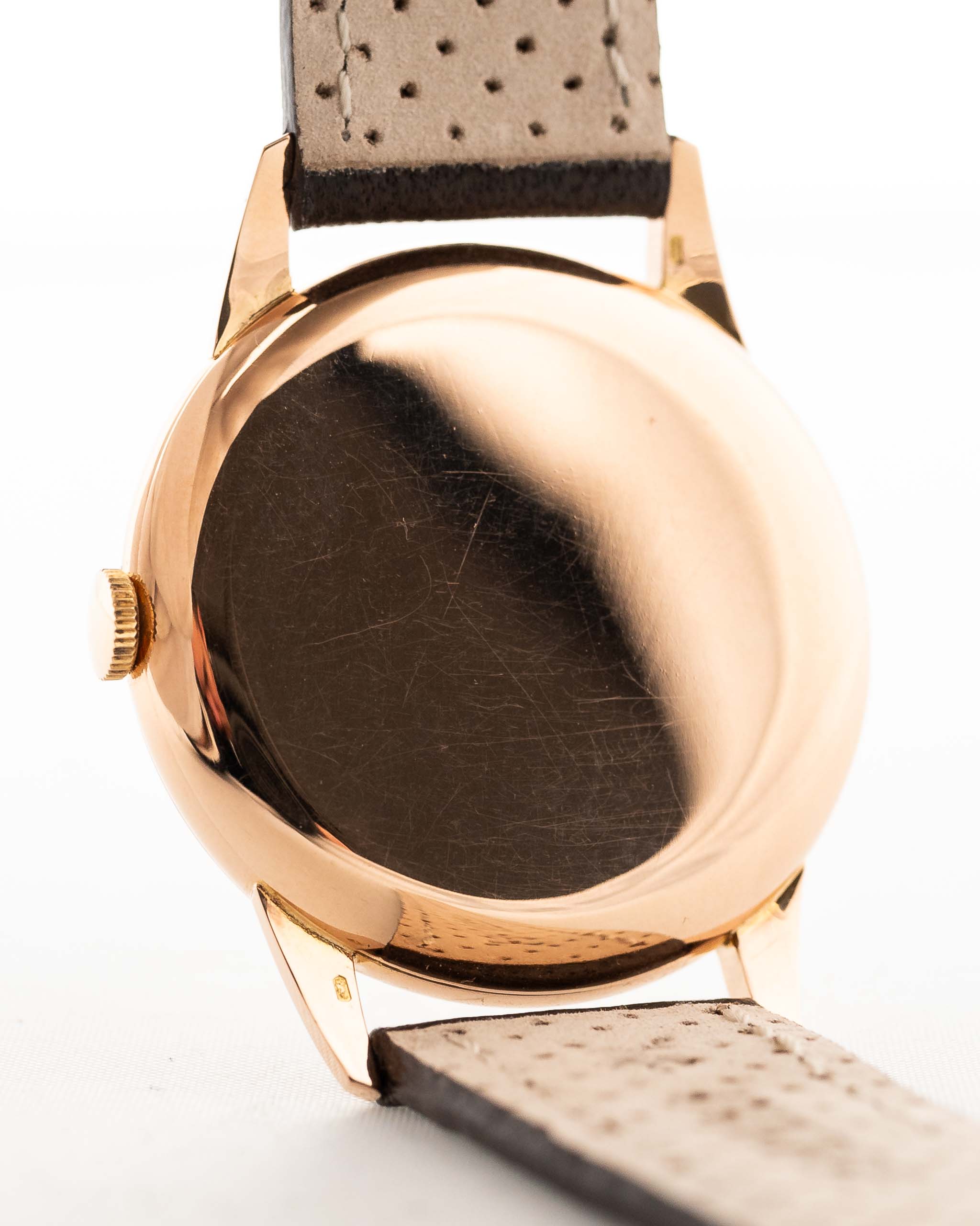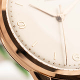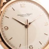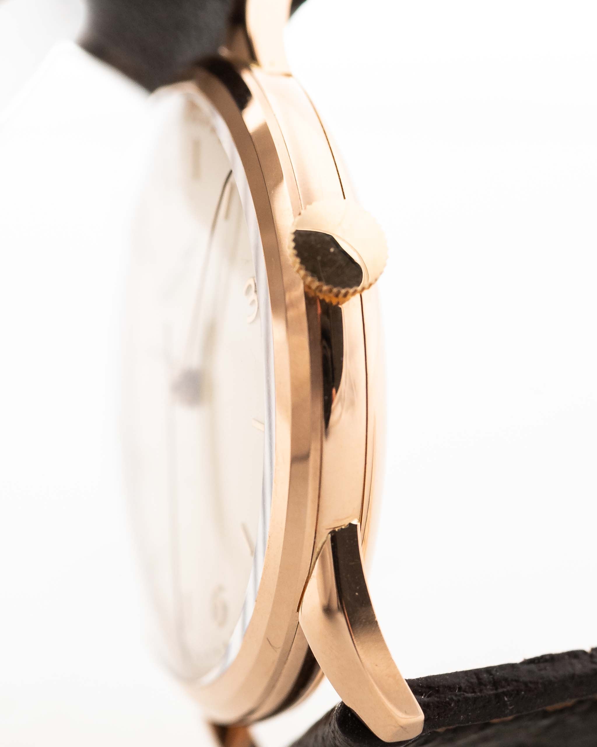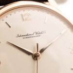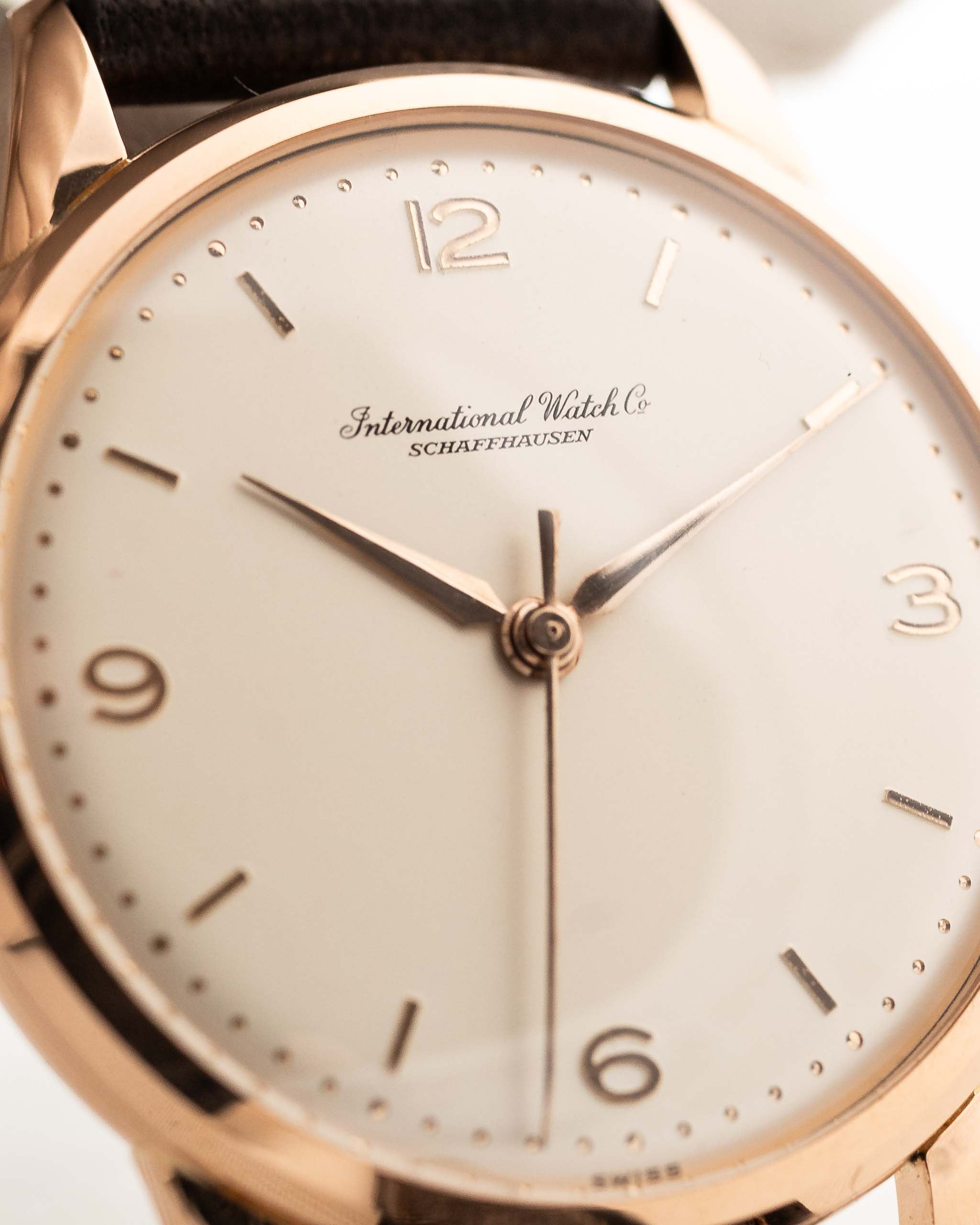 IWC has produced a very wide variety of wristwatches from an early time ranging from dress watches to aviation watches. This example, in 18k rose gold with it's white/silver dial with twelve, three, six nine layout would remain a constant in anyone's collections, especially as it comes with beautiful slight down turned lugs.