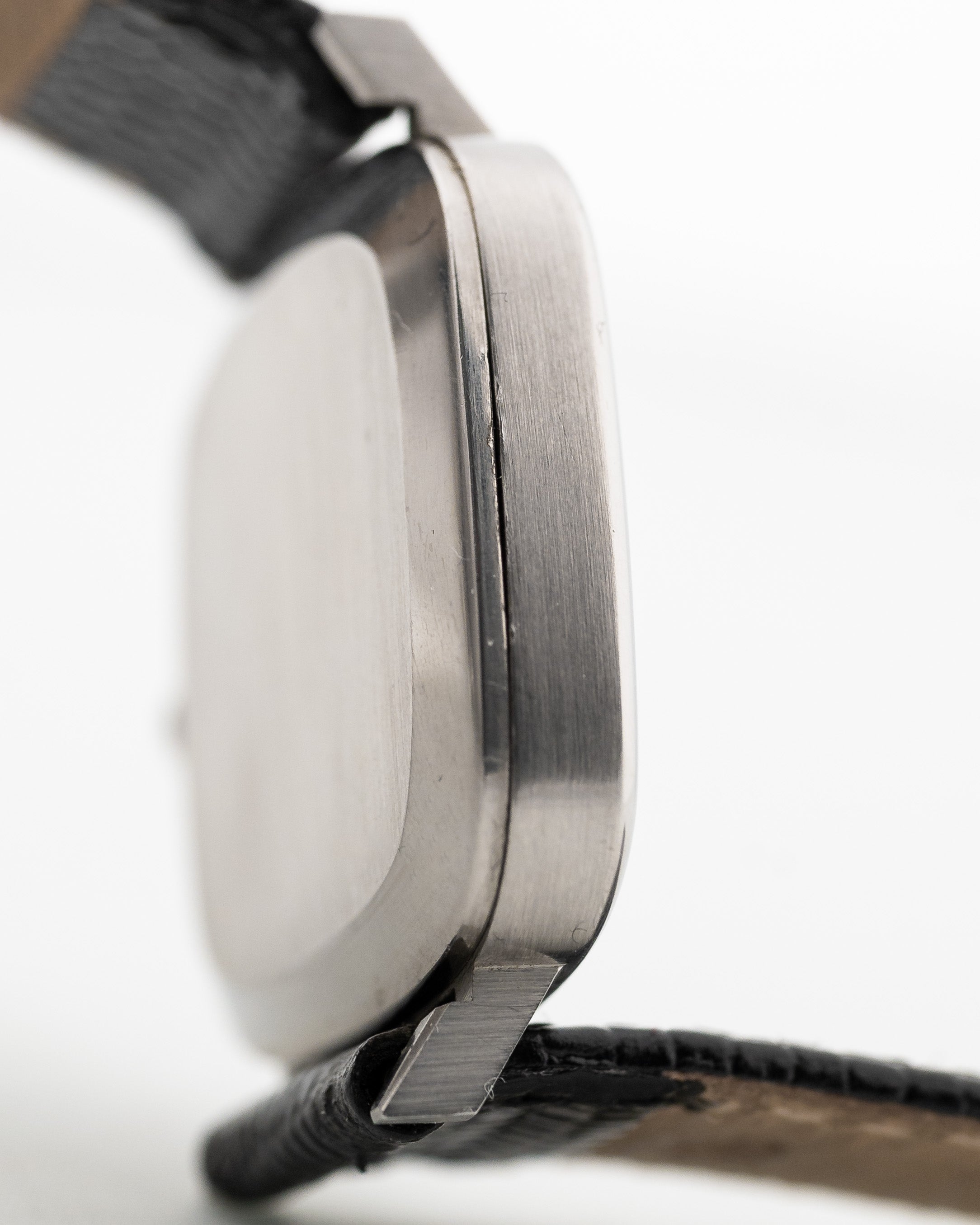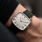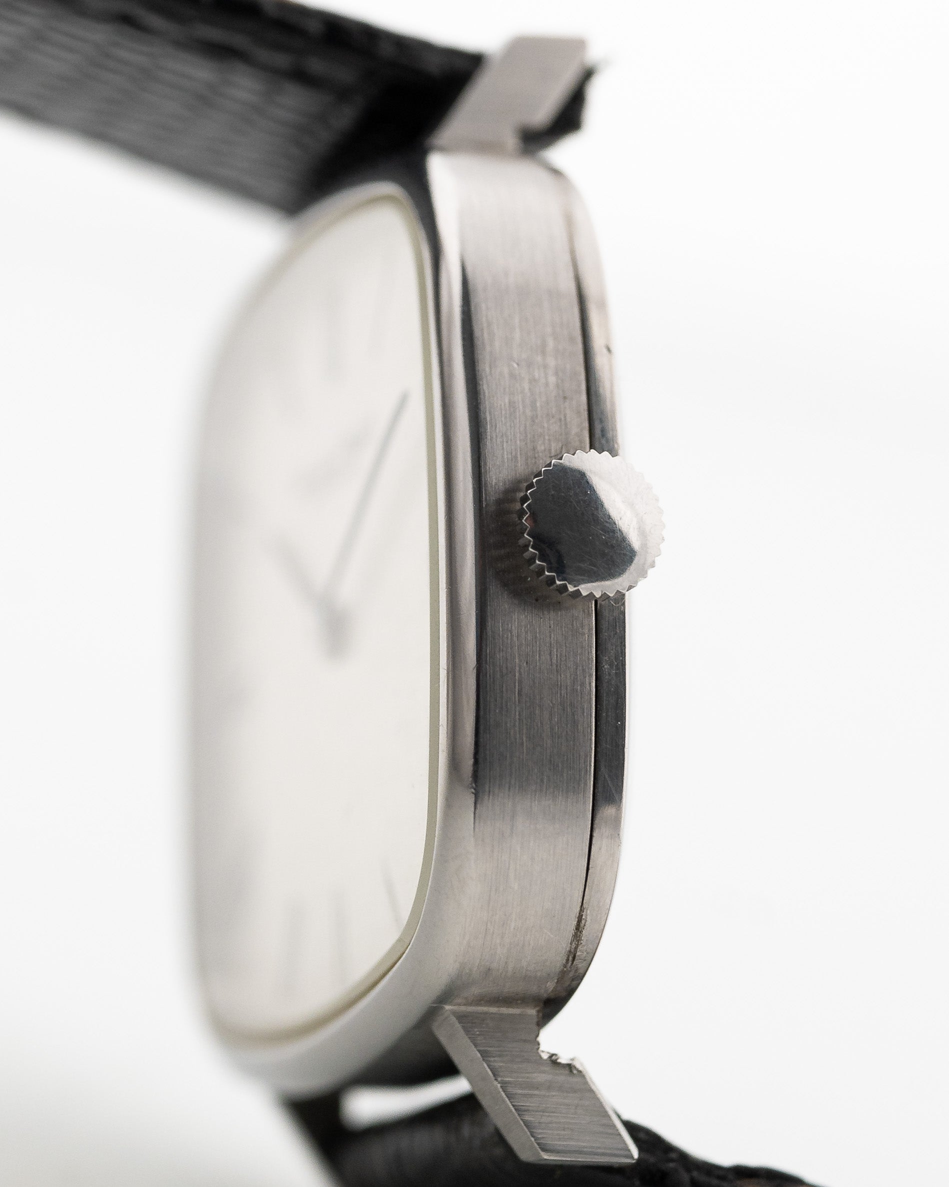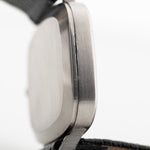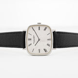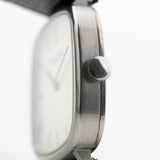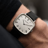 IWC has produced a very wide variety of wristwatches from an early time, ranging from dress watches to aviation watches. Our example, in stainless steel and Rectangular shape with and straight lugs, would remain a constant in anyone's collections, especially as it comes in an outstanding condition and a very rare silver linen dial with roman numerals.