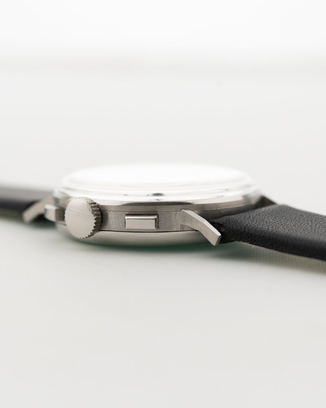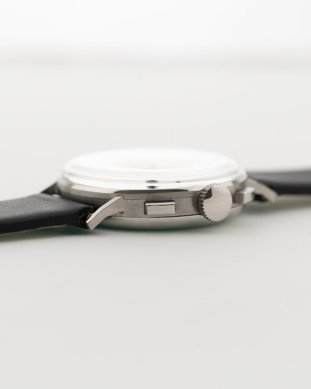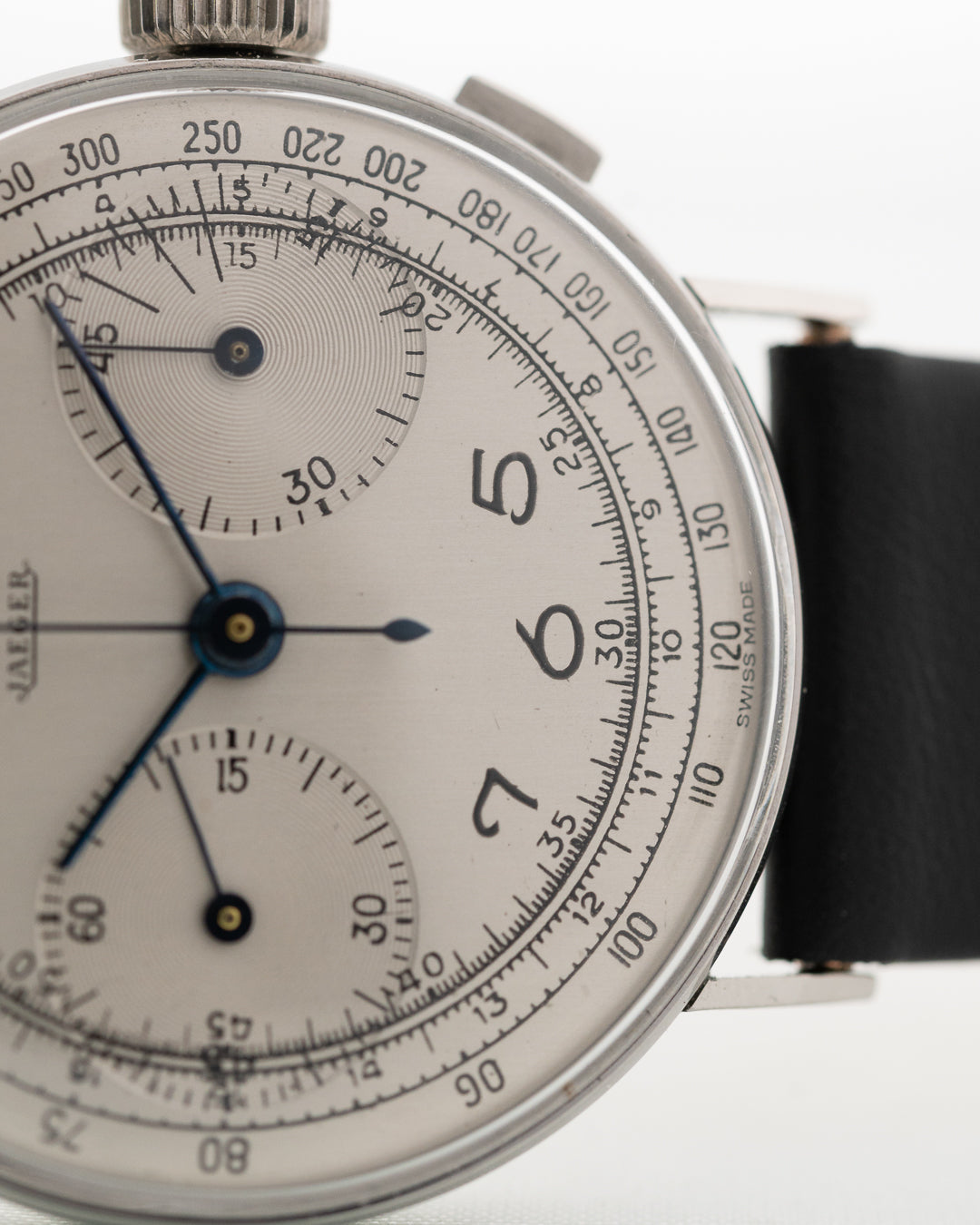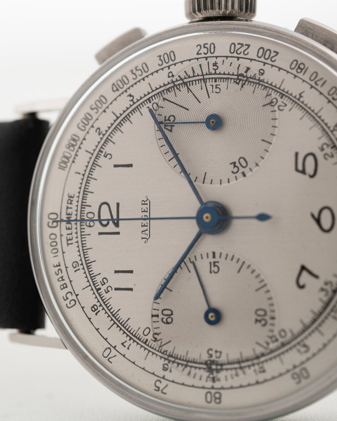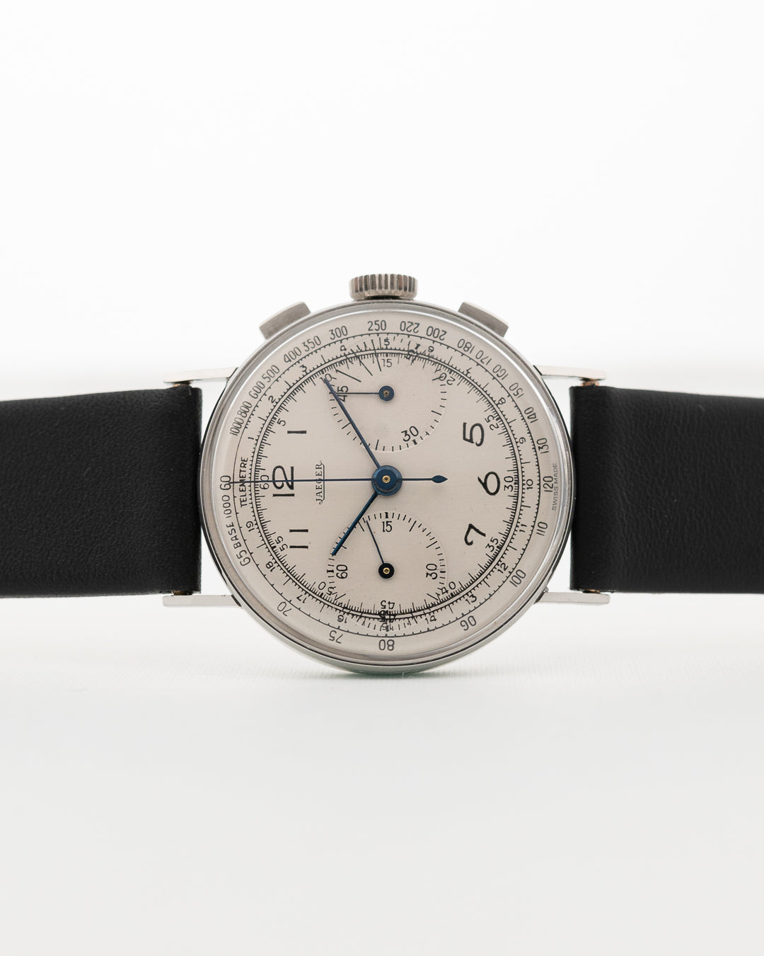 Here we have an exceptional Jaeger Chronograph from ca. 1952 featuring a stunning 35mm stainless steel case and a beautiful silver colored dial with a nice blue handset.