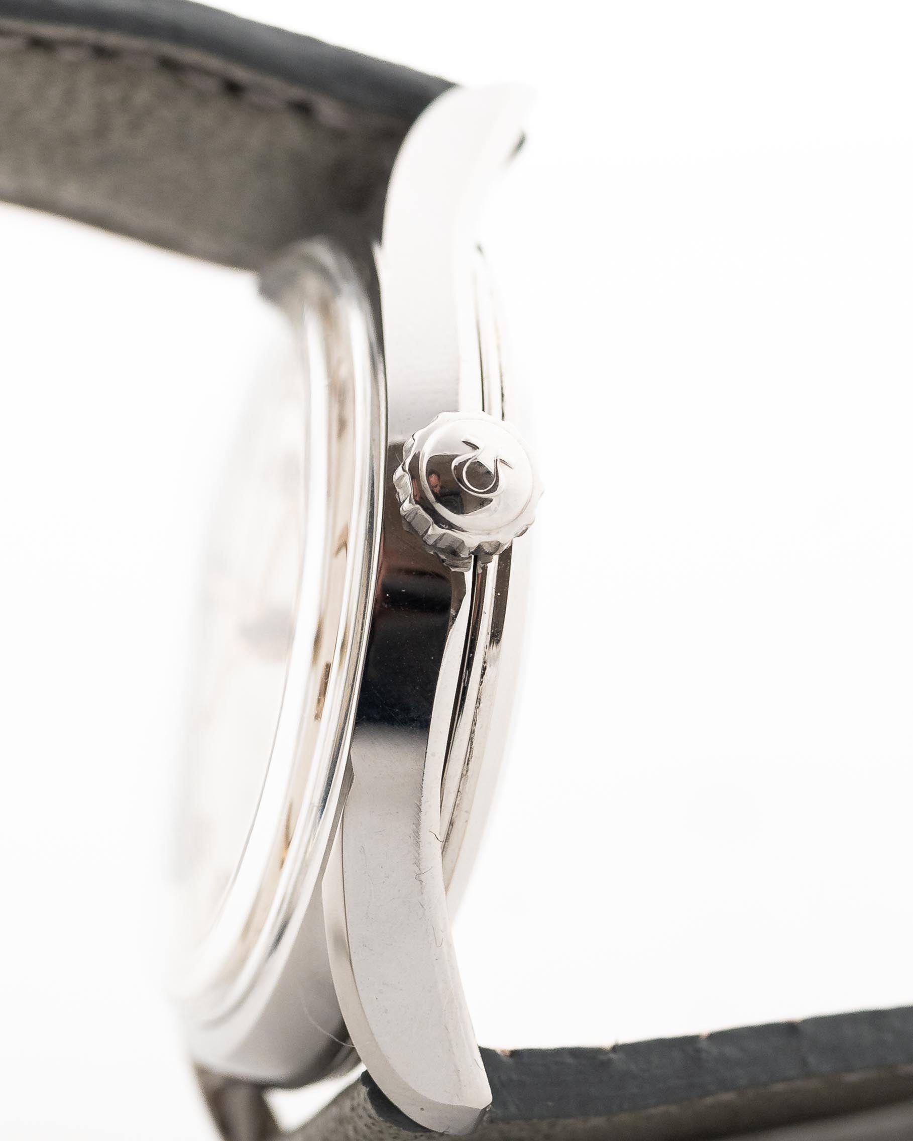 Here you can see a fascinating Seamaster made by Omega in 1954. It features a huge 36 mm stainless steel case with slightly down turned lugs and comes with a beautiful clean cream dial, beautiful golden hour markers and dauphine hands.