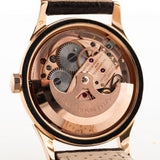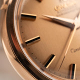 This compact and beautiful Omega Constellation automatic chronometer has everything you want in a dress watch: 34 mm 18k rose gold case, center seconds, a very beautiful rose gold colored dial and rare slim baton hour markers with onyx inlay. First released in 1952, the Constellation was Omega's answer to the Rolex Datejust.