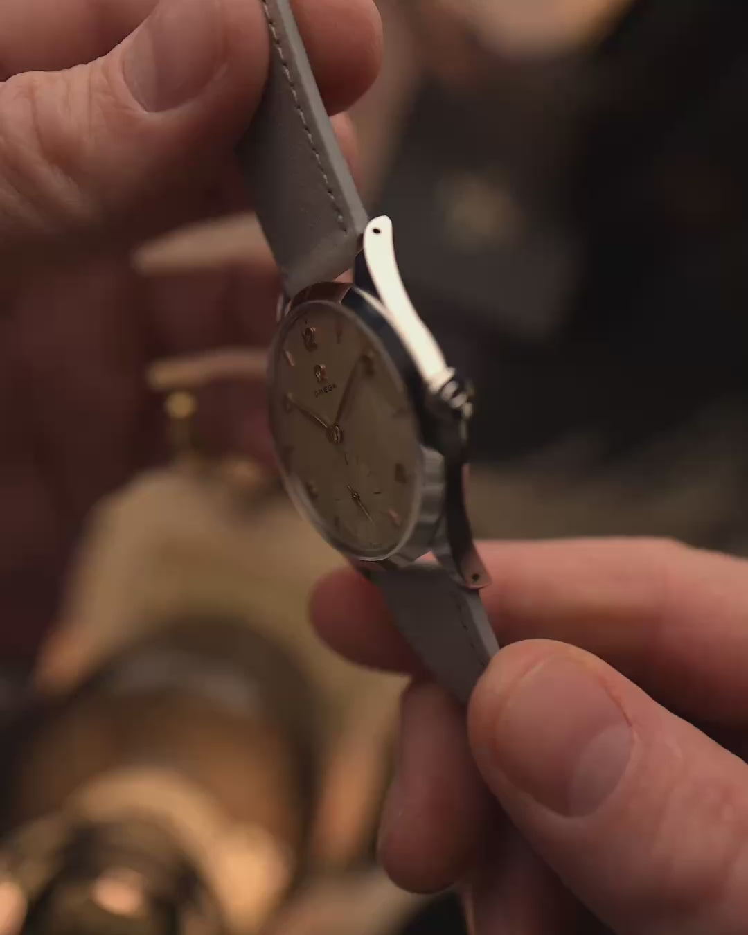 Classic vintage watch worn on a wrist above vintage watches and luxury watches on a desk.