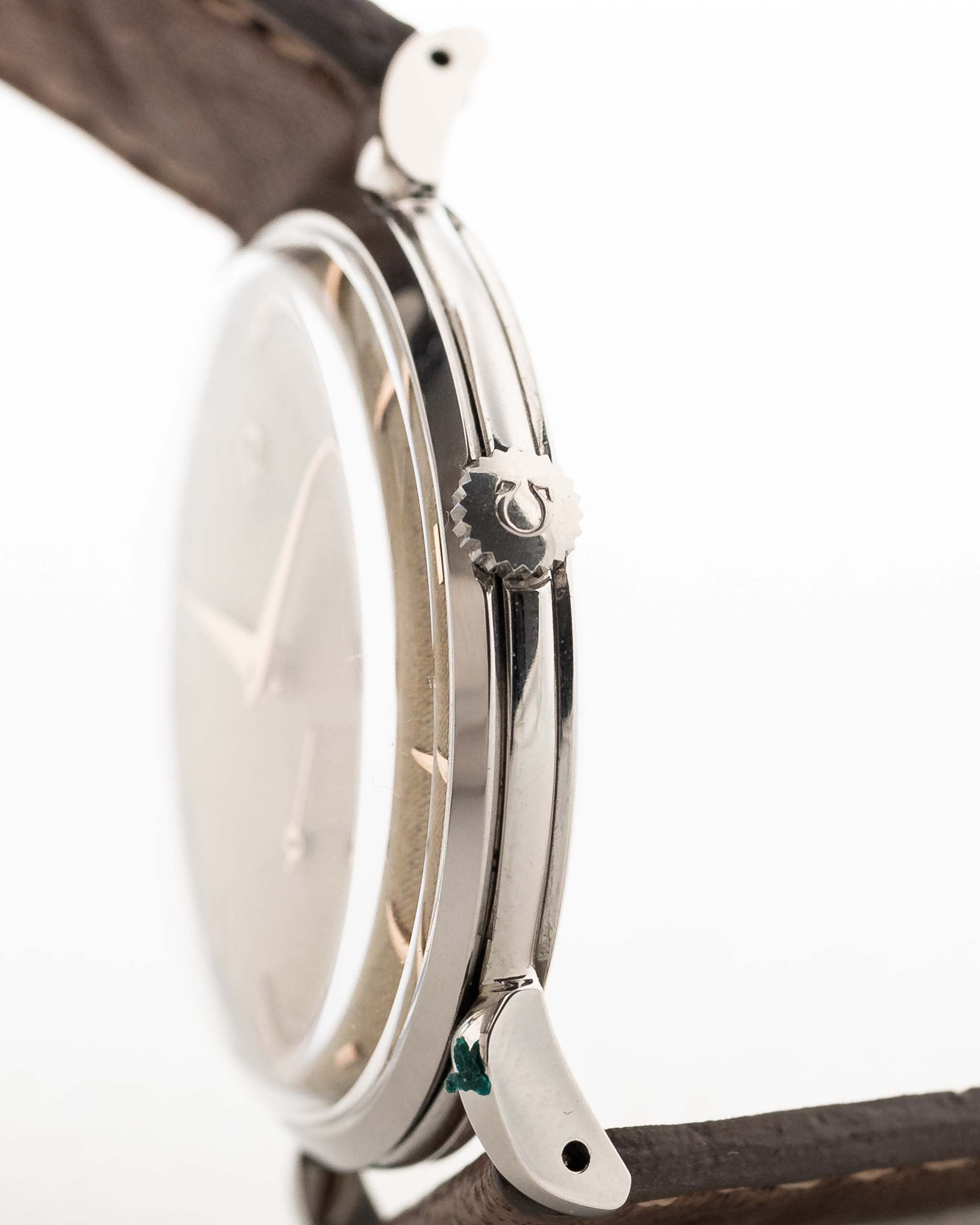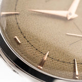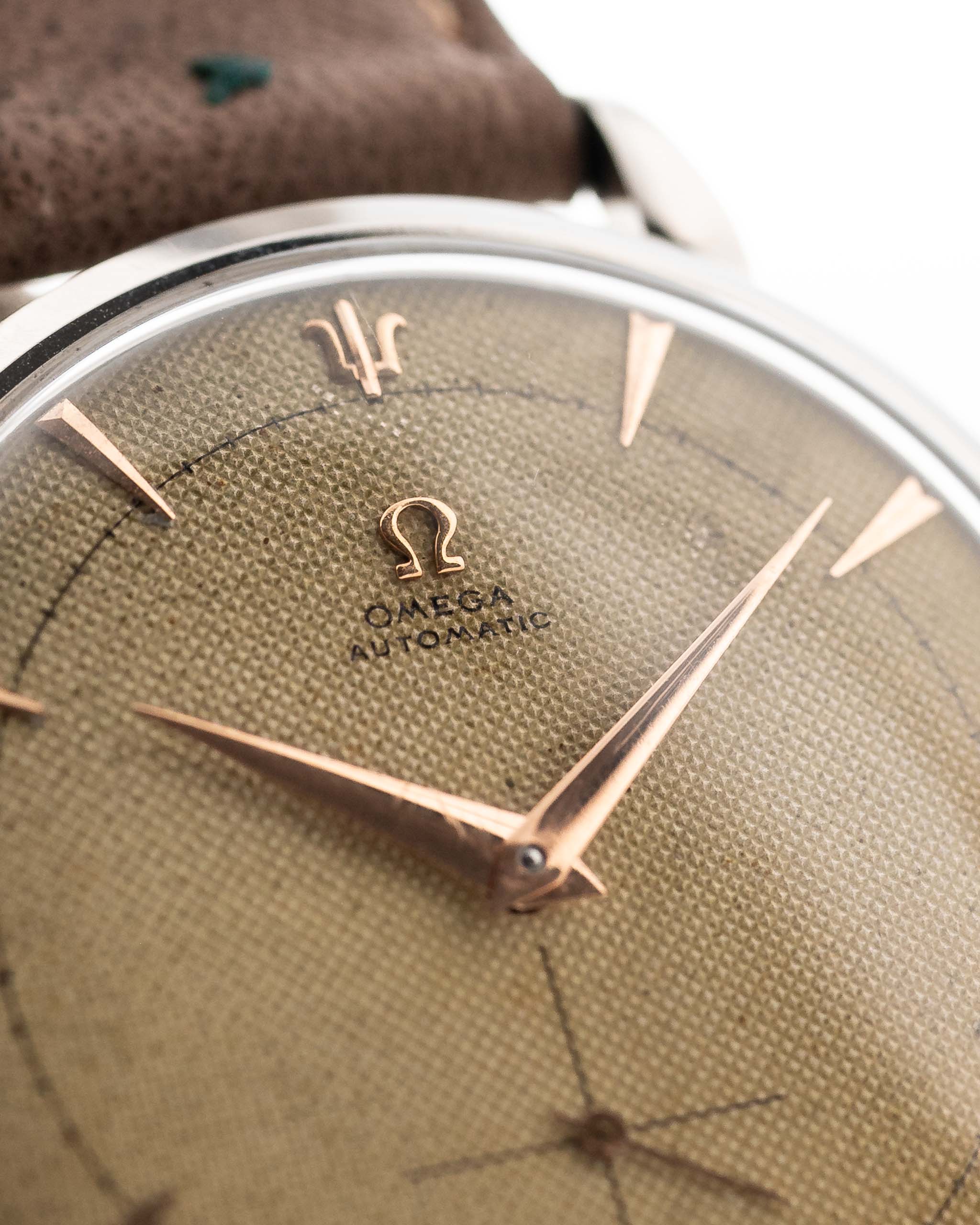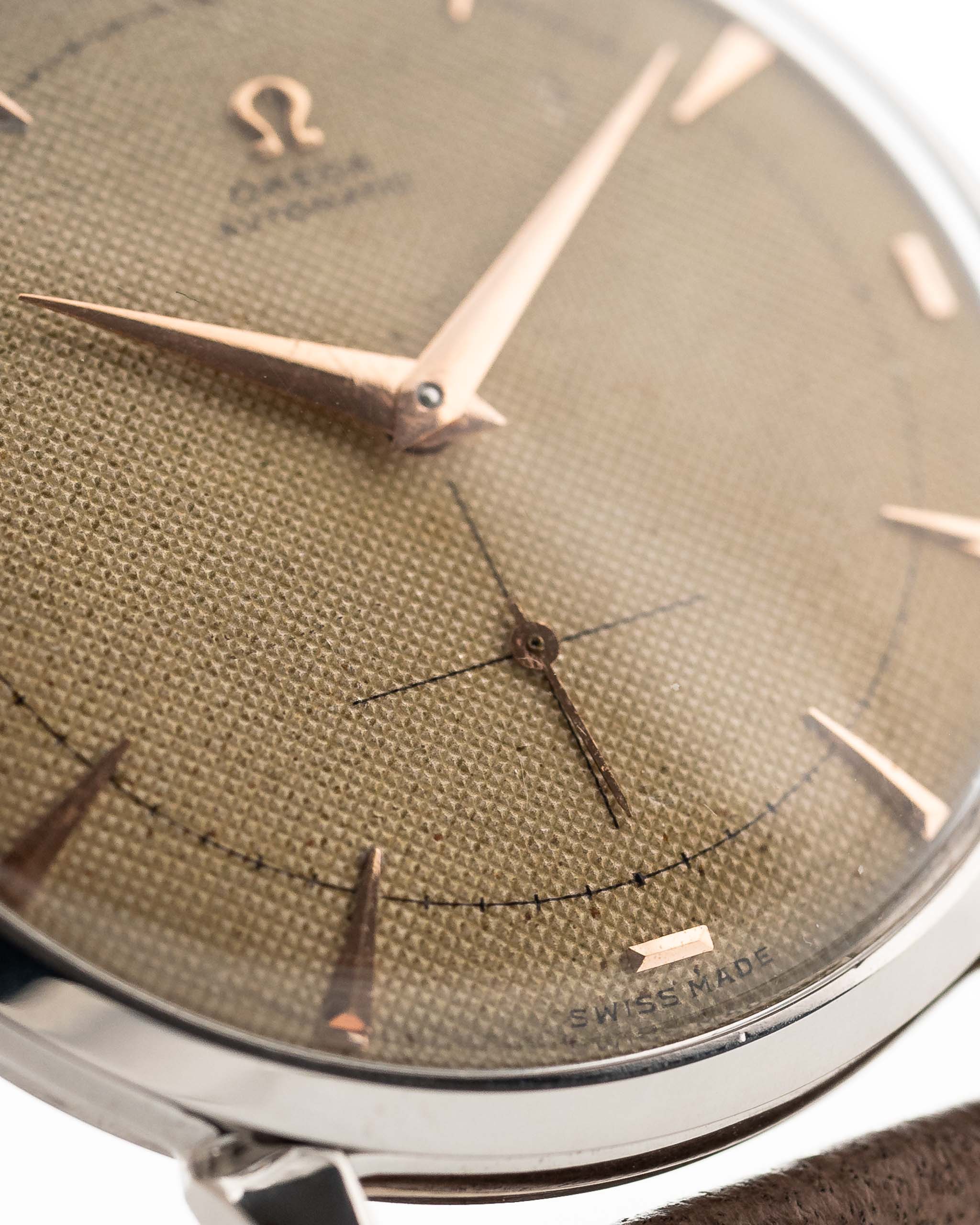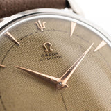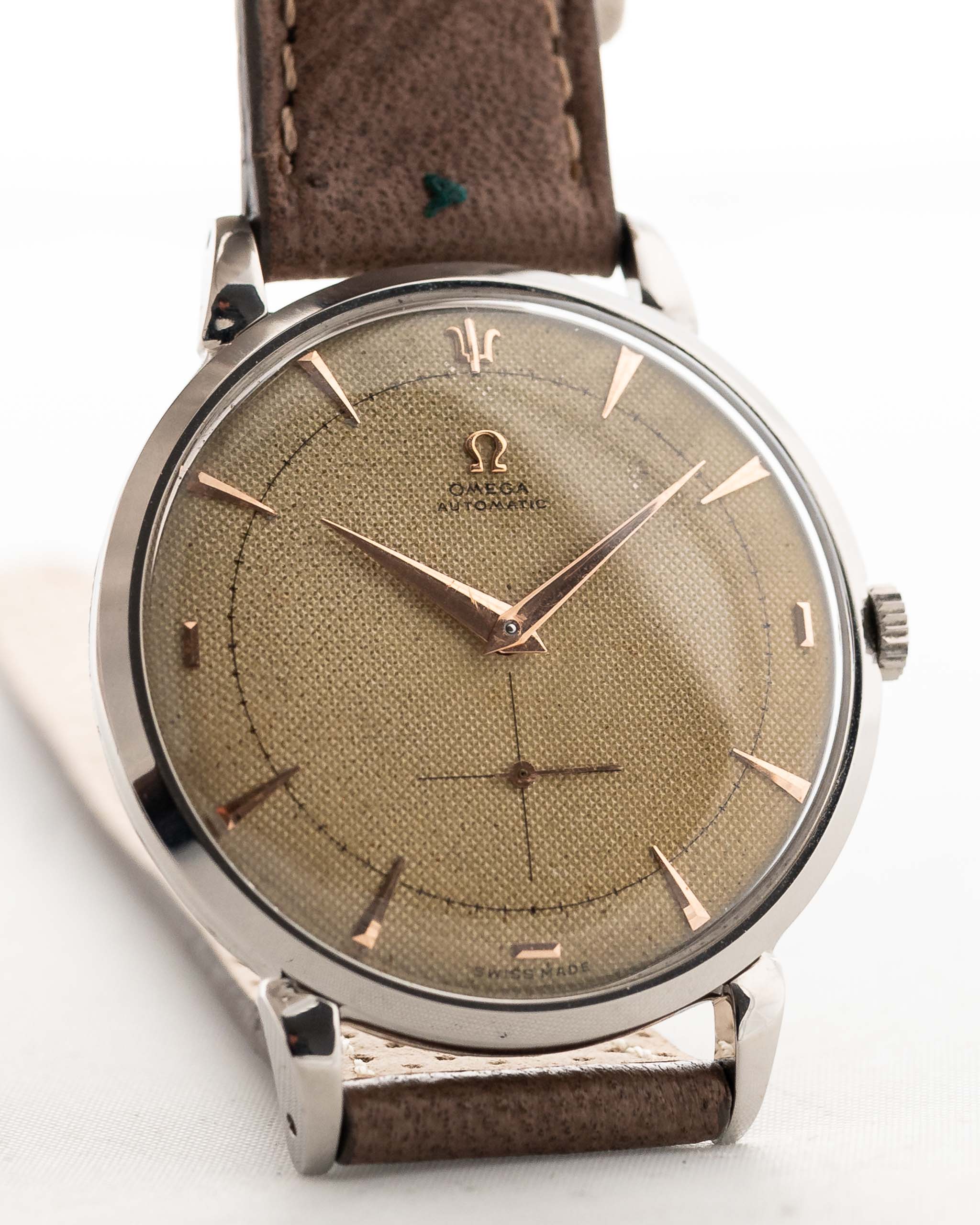 This 1950 Omega has everything you want in a dress watch - a well balanced 37 mm case, a great honeycomb dial with subsidiary second and beautiful rose gold hands, applied Omega logo and very elegant overlaid rose gold indexes. Even more unique - we never saw before -  is the trident hour marker at twelve o'clock.