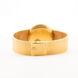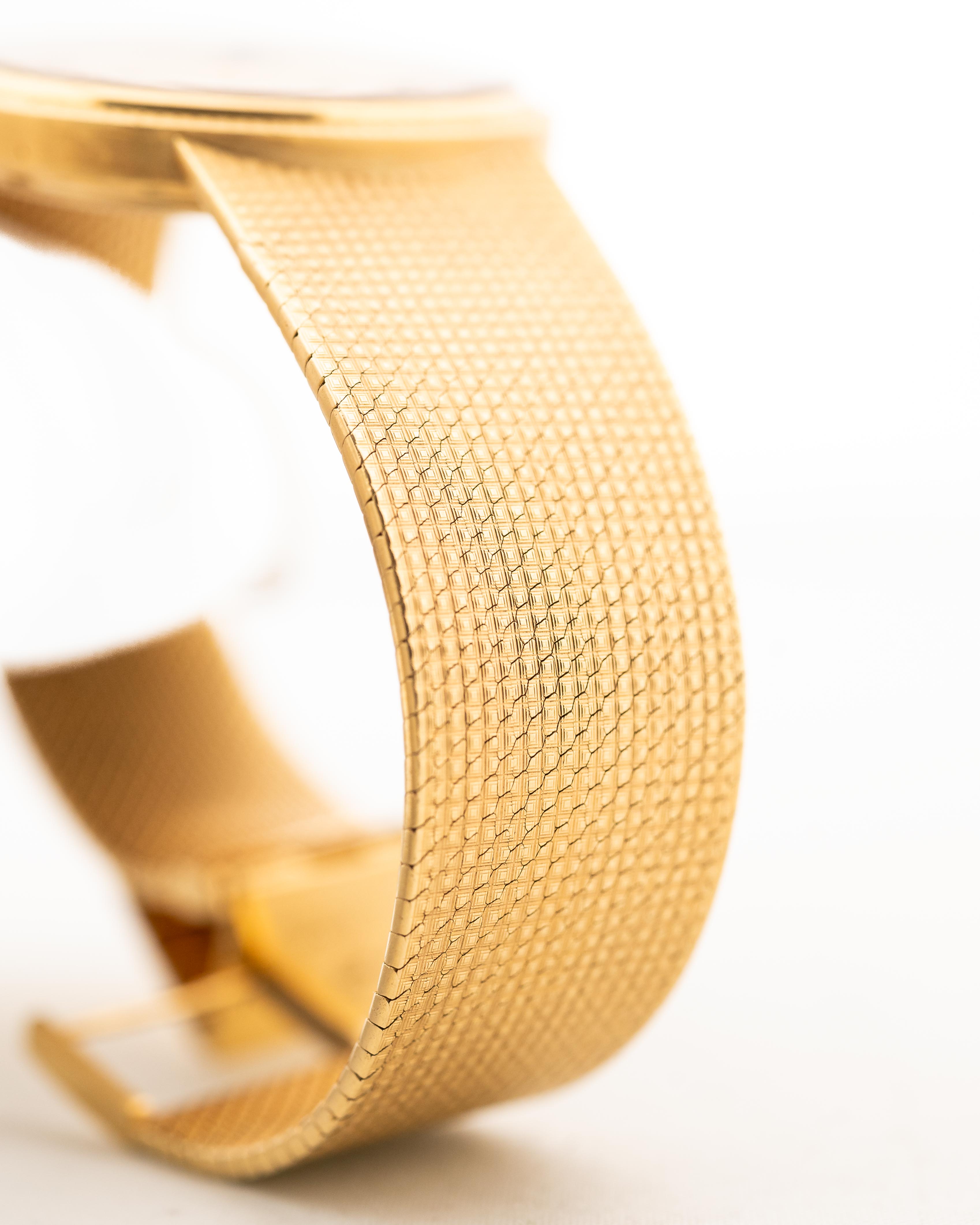 Our model features a 34.5 mm yellow gold case with no lugs, a stunning 18k Clous de Paris dial and an amazingly integrated 18k yellow gold bracelet with Patek Philippe clasp. Special on this one is that it has the crown on the case back for an even more elegant and symmetrical look on the wrist.