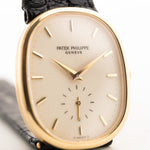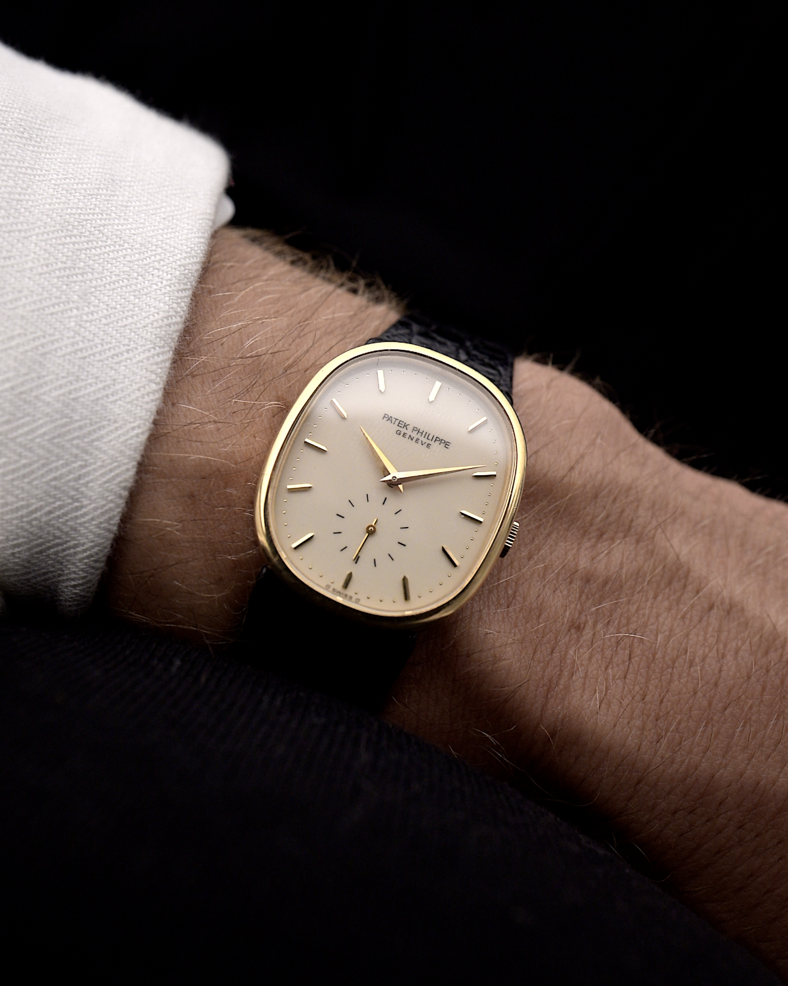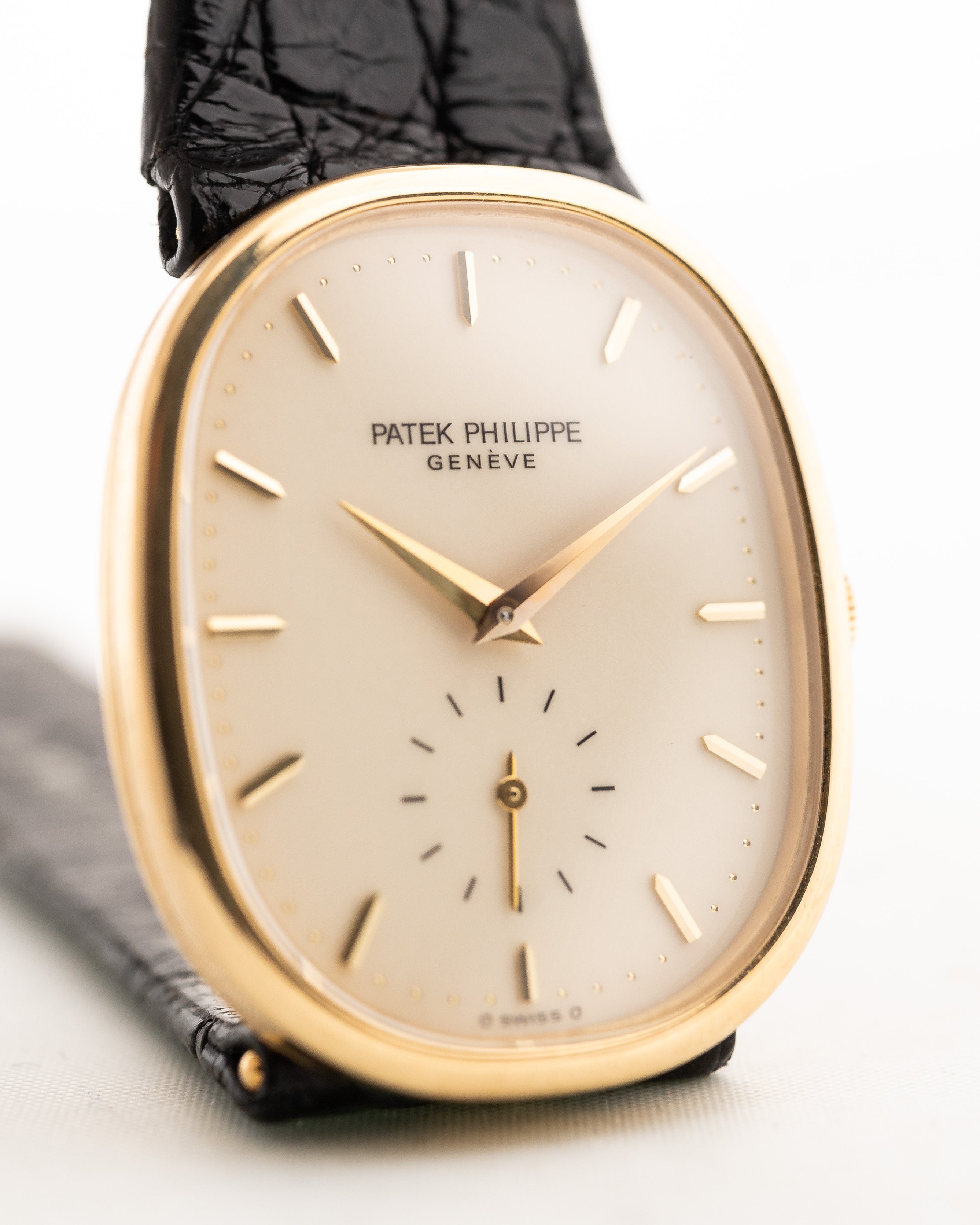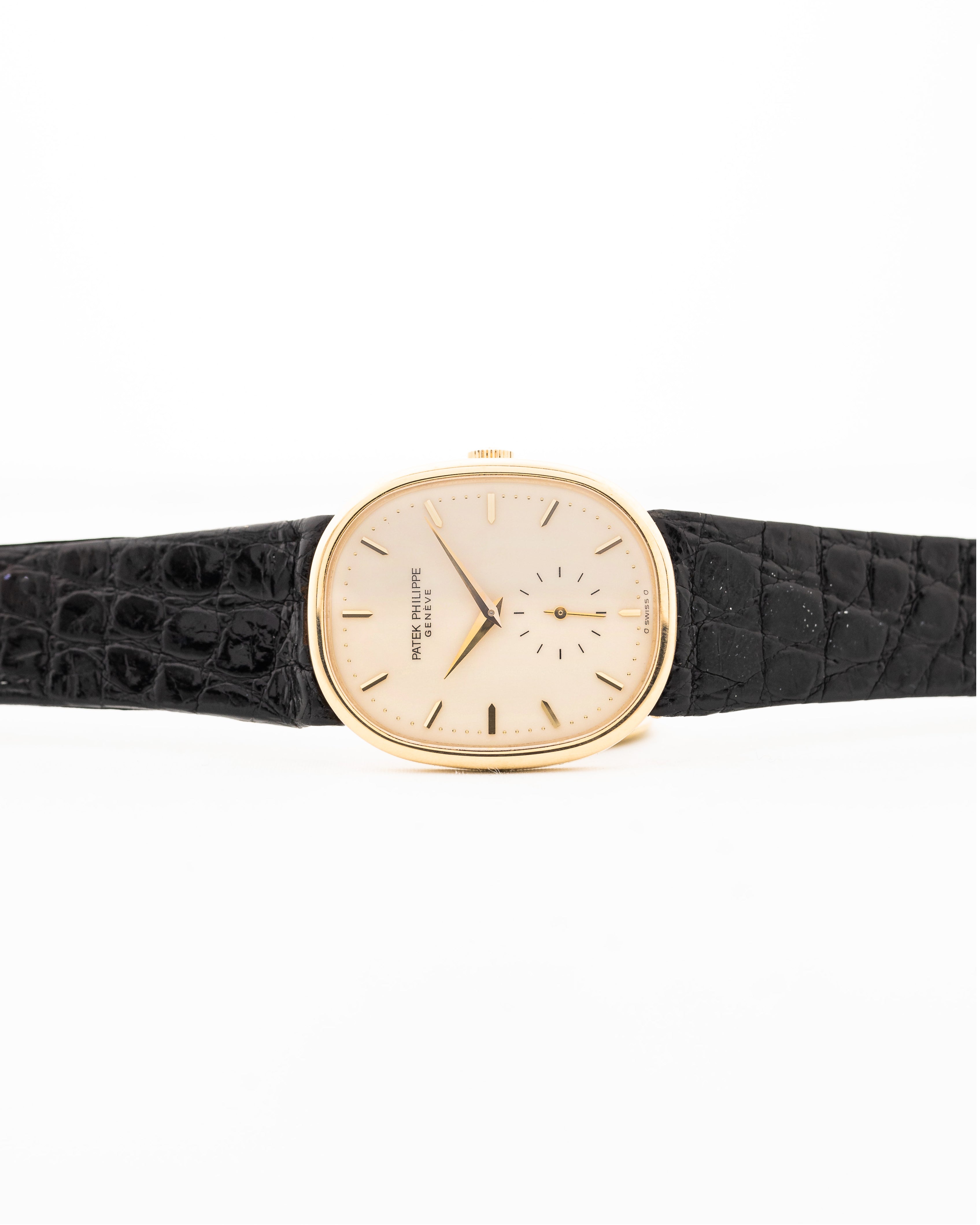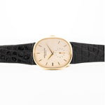 Here we have an excellent representation of Patek Philippes Ellipse dress watches, this ref. 3948 hit all the high notes with an 18k yellow gold case, a wonderful rare enamel dial in flawless condition with golden stick hour markers and alpha handset. Our model is very rare because of the sub second, the most Ellipse models come without it.