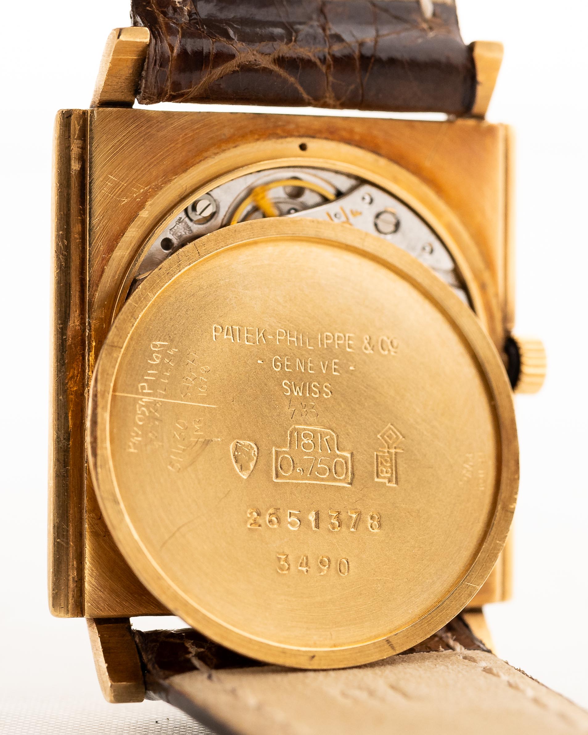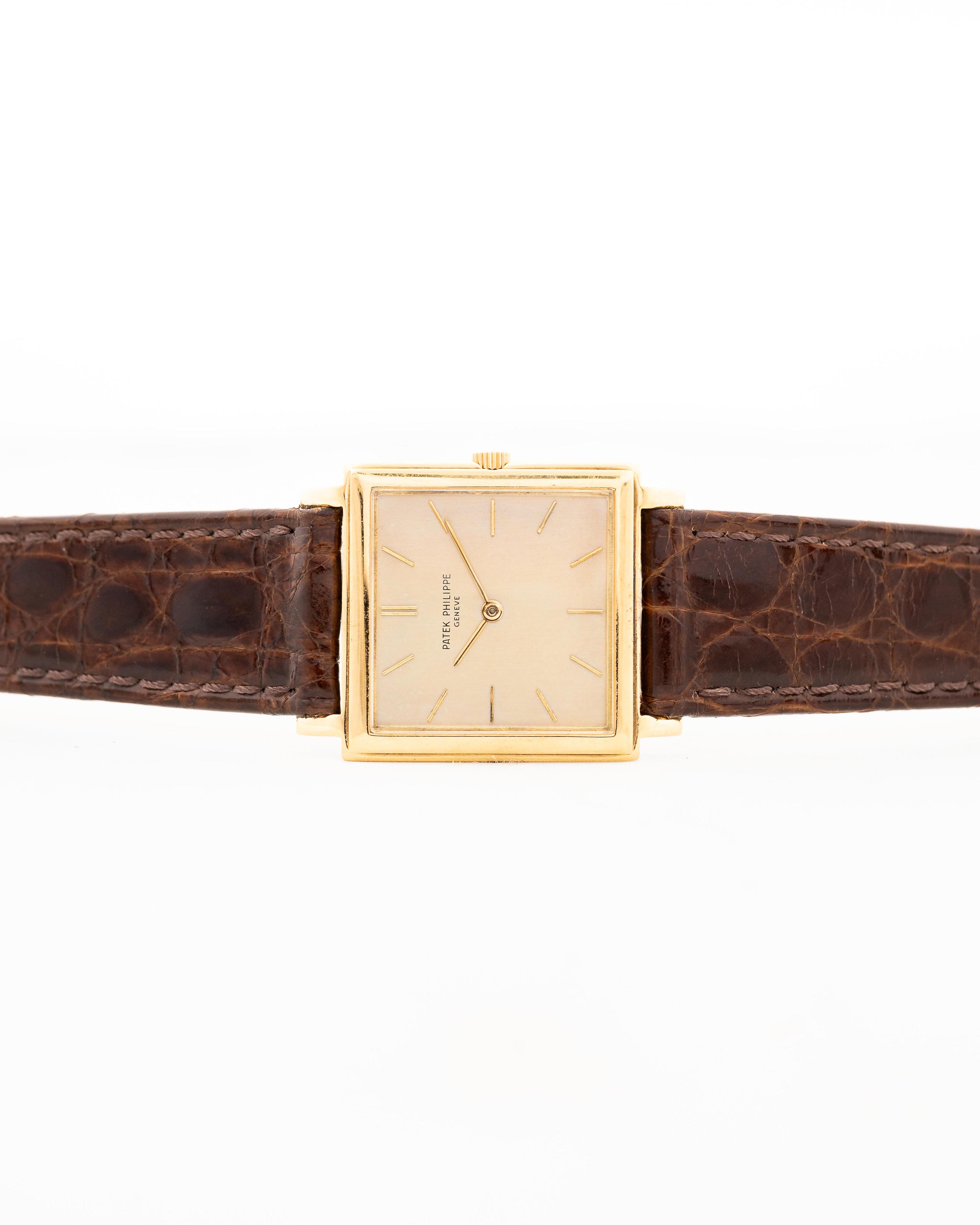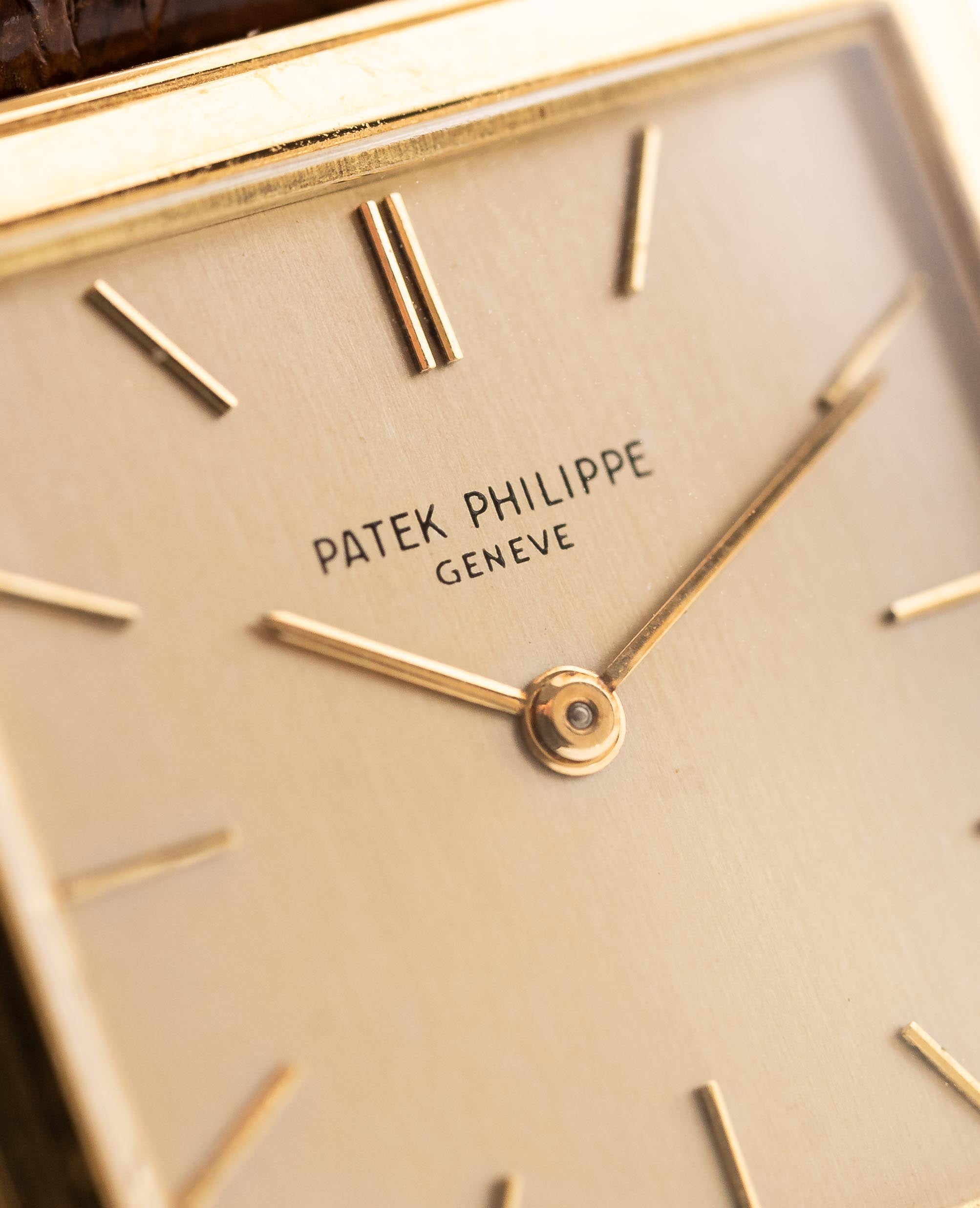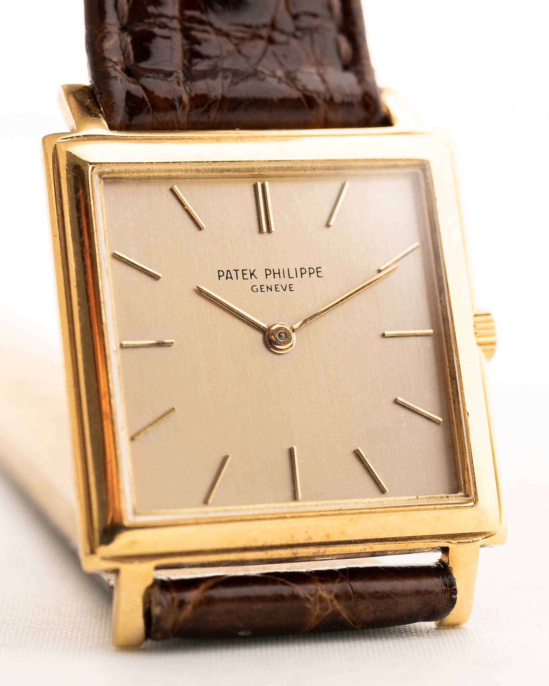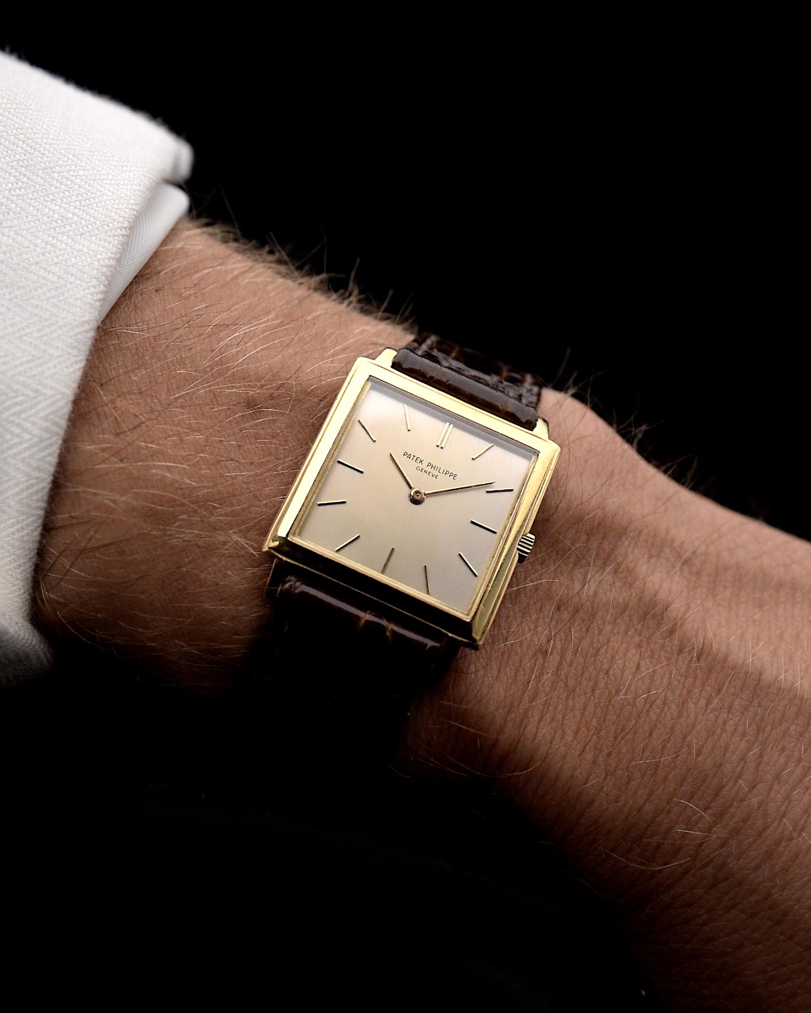 Here we have an excellent representation of Patek Philippes's dress watches, this ref. 3490 hit all the high notes with an 18k yellow gold Square case, short angled lugs, a wonderful clean colored dial with vertical brush, stick hour markers and hands.