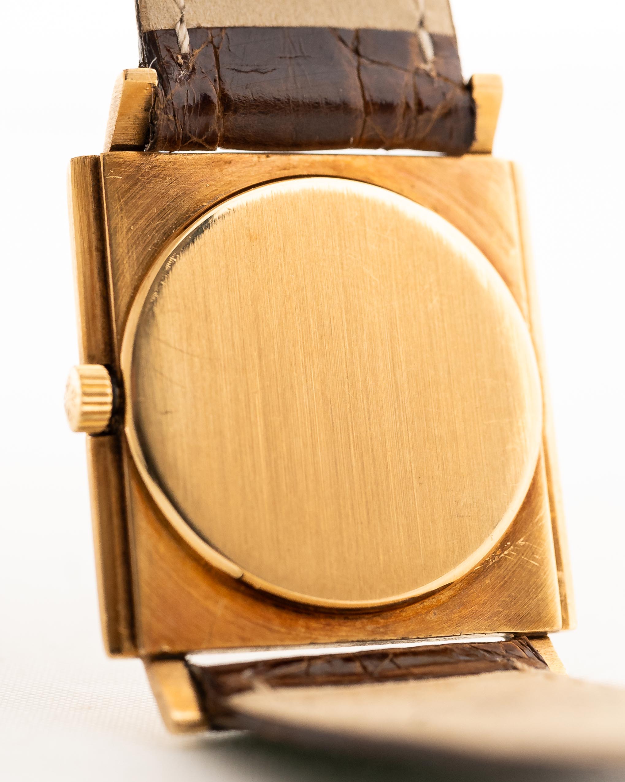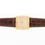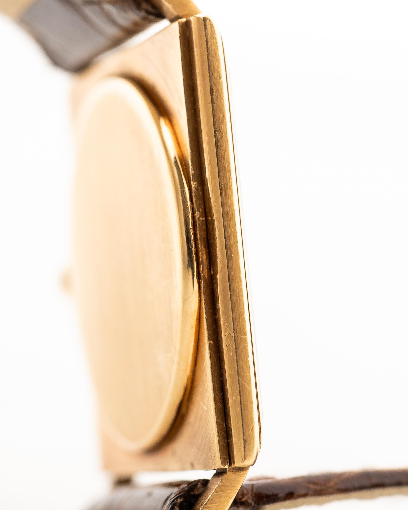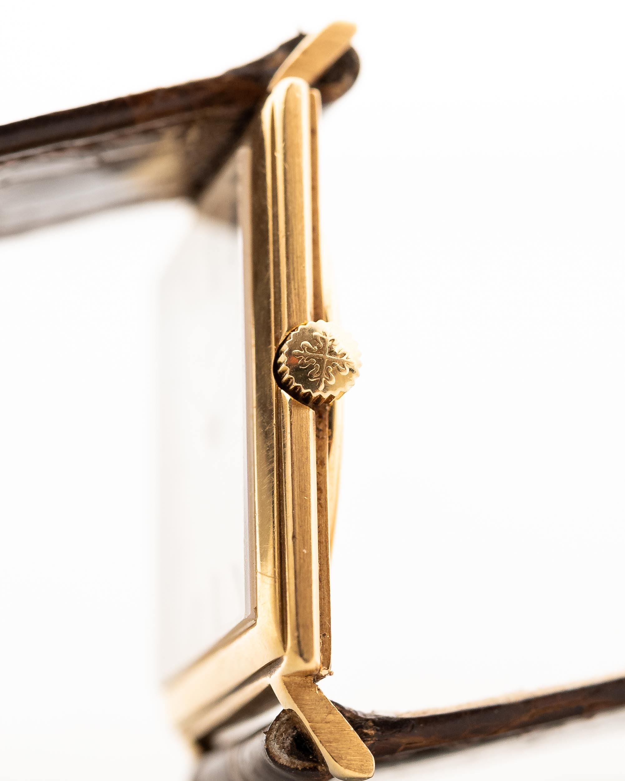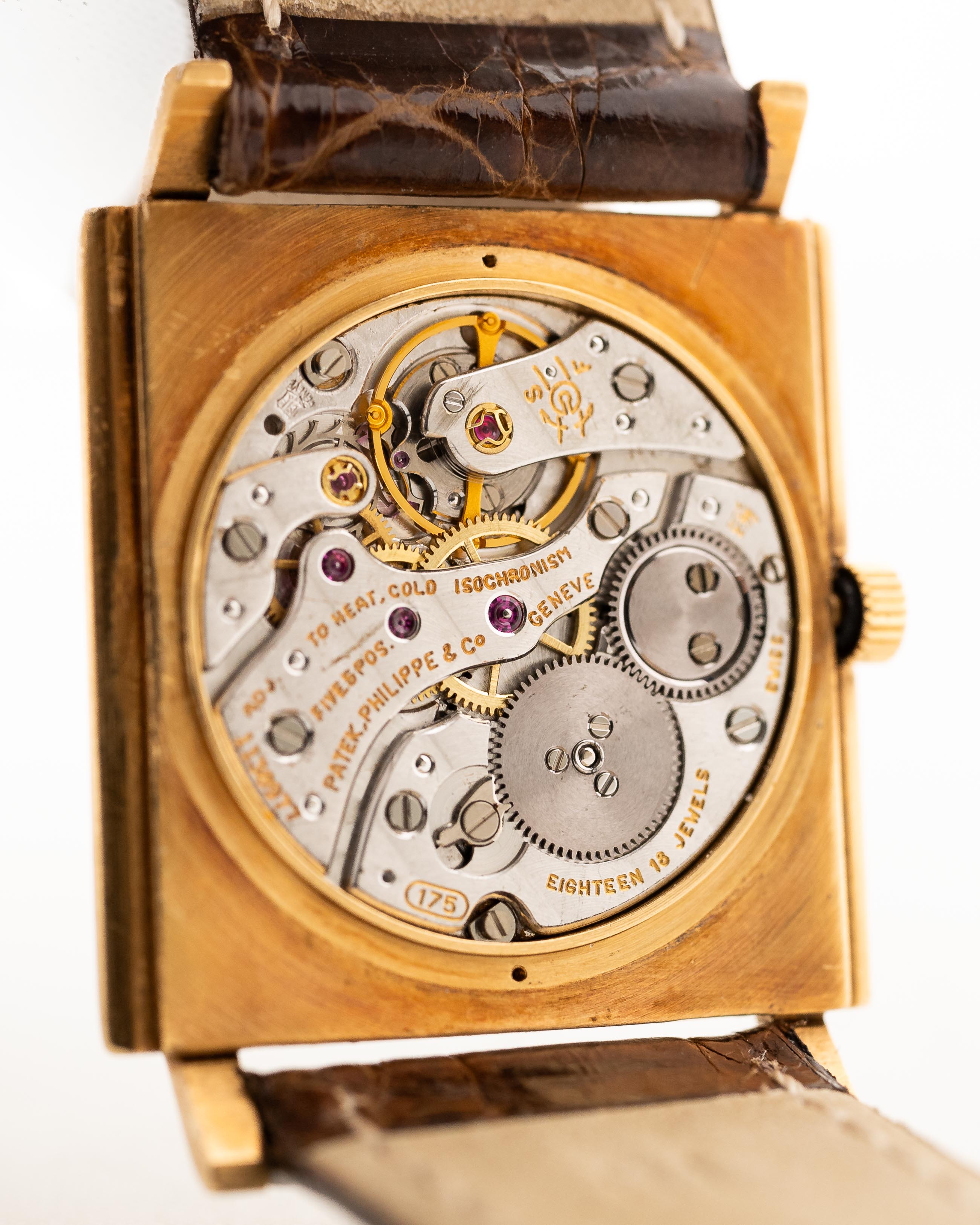 Here we have an excellent representation of Patek Philippes's dress watches, this ref. 3490 hit all the high notes with an 18k yellow gold Square case, short angled lugs, a wonderful clean colored dial with vertical brush, stick hour markers and hands.