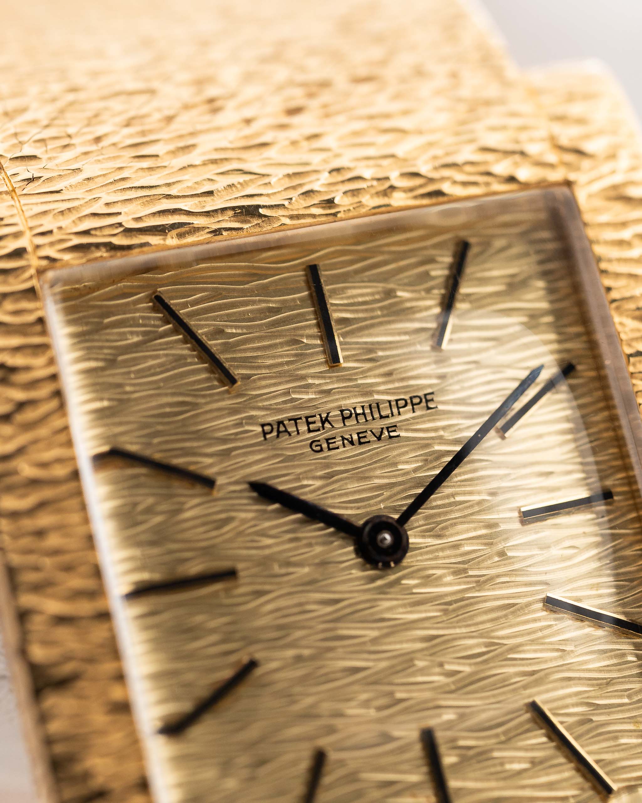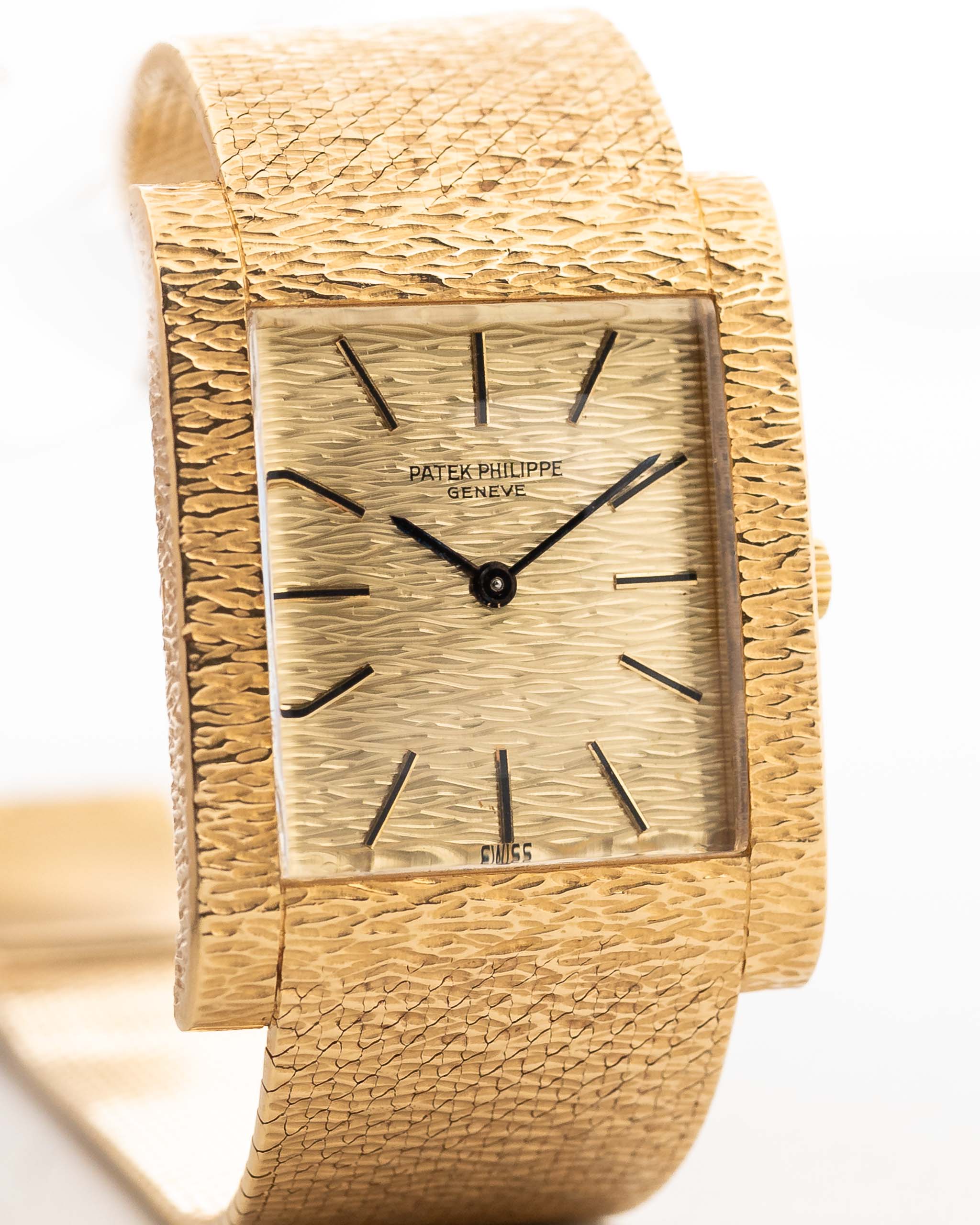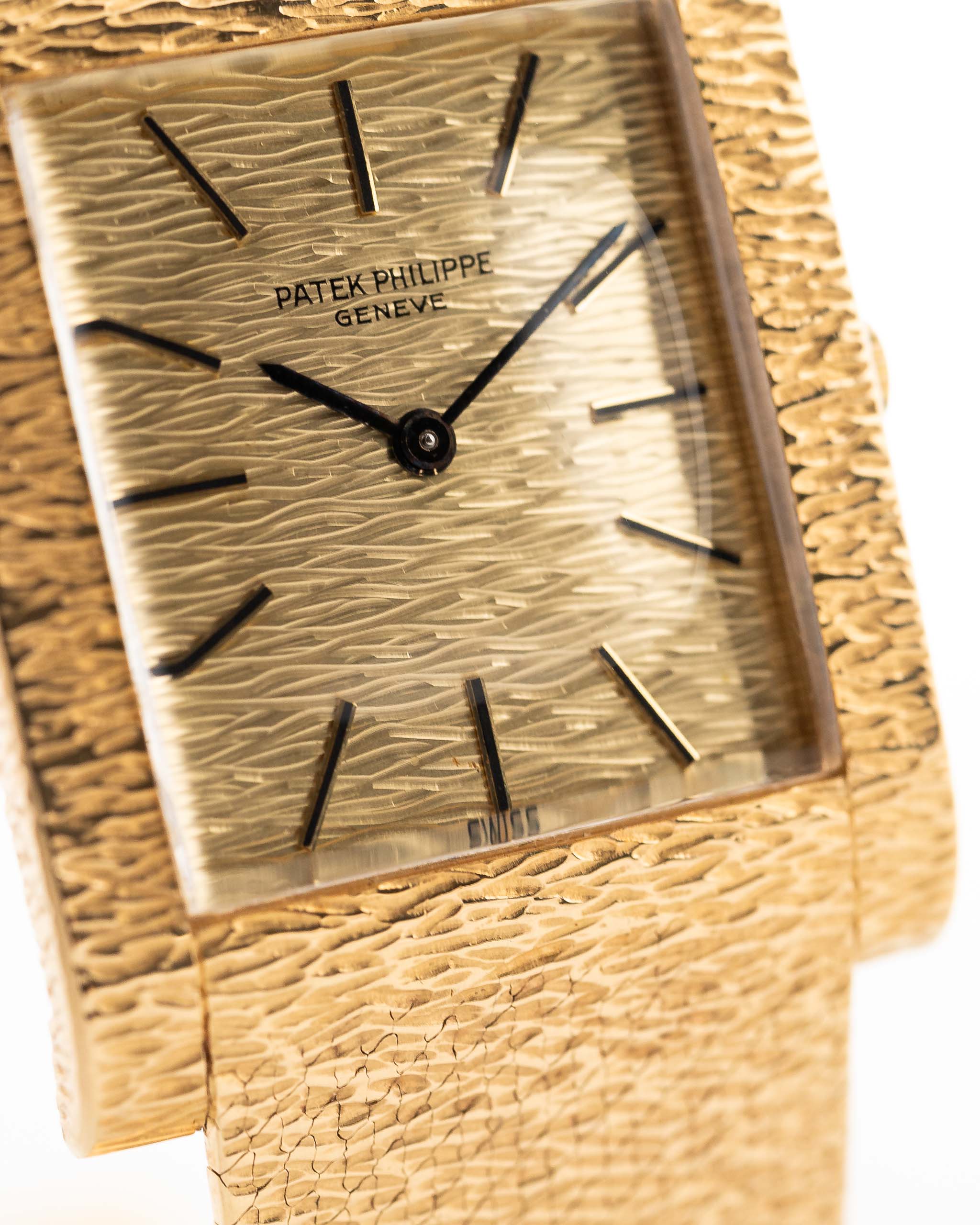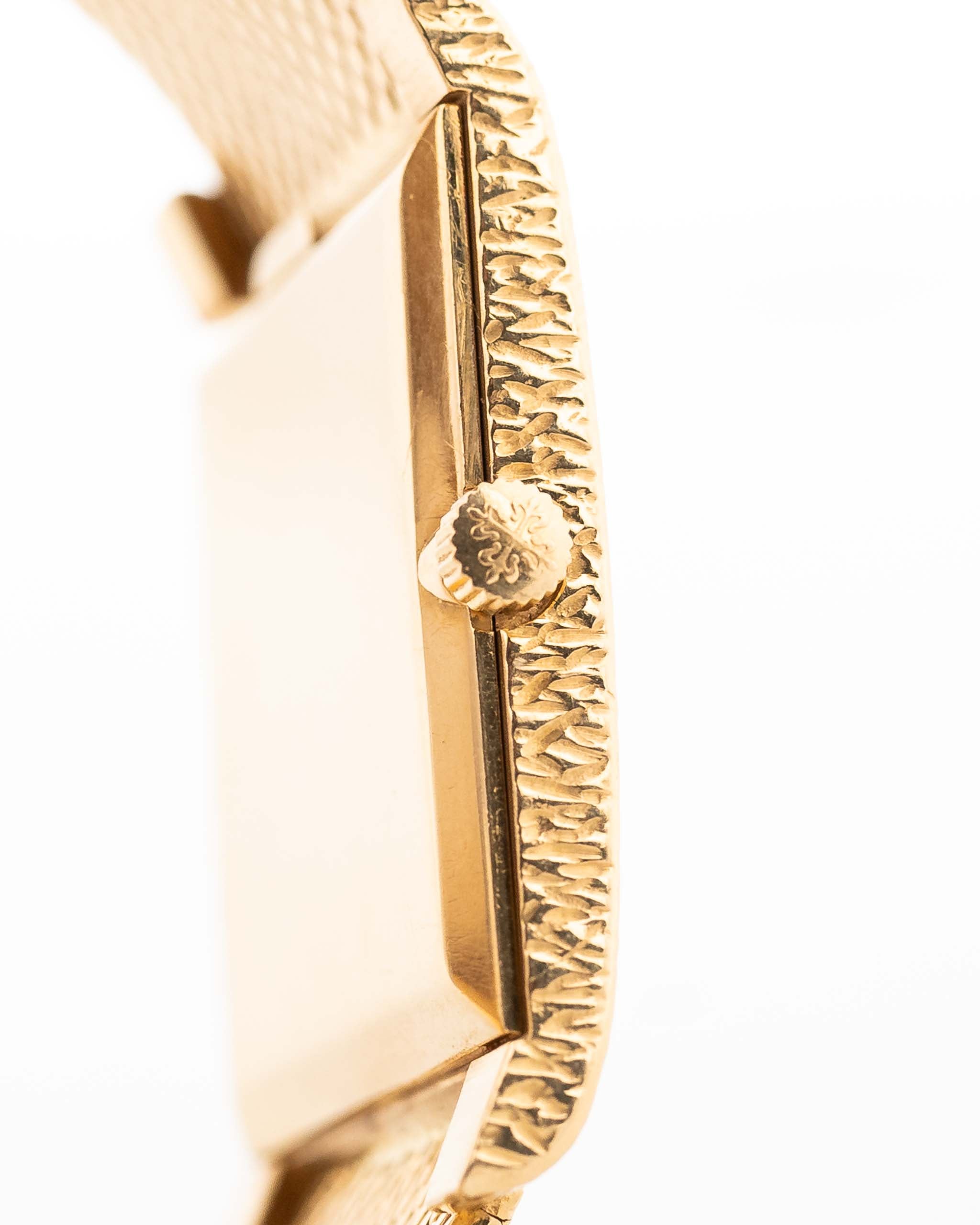 Patek Philippe has made many different models with integrated gold bracelets over the years, each standing out in their own unique way. This one comes in a (for Patek Philippe) more rare rectangular case shape and all over bark finishing.