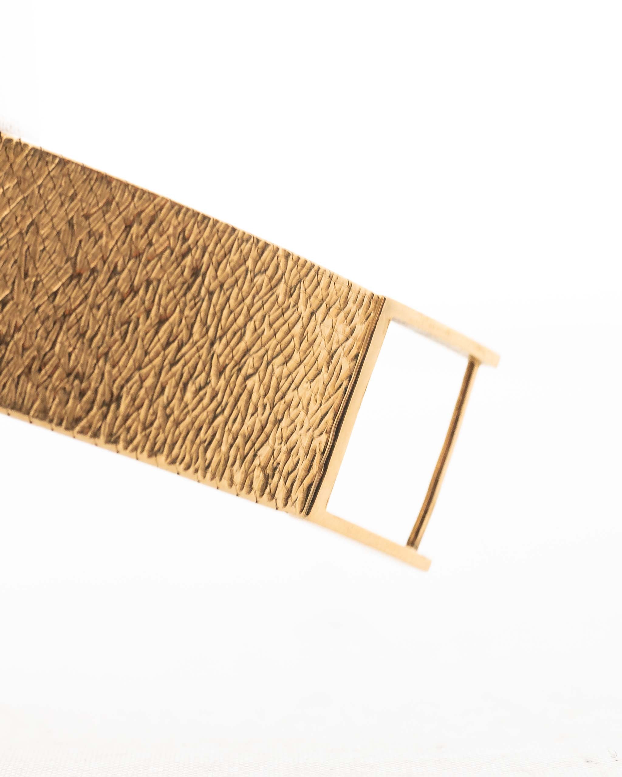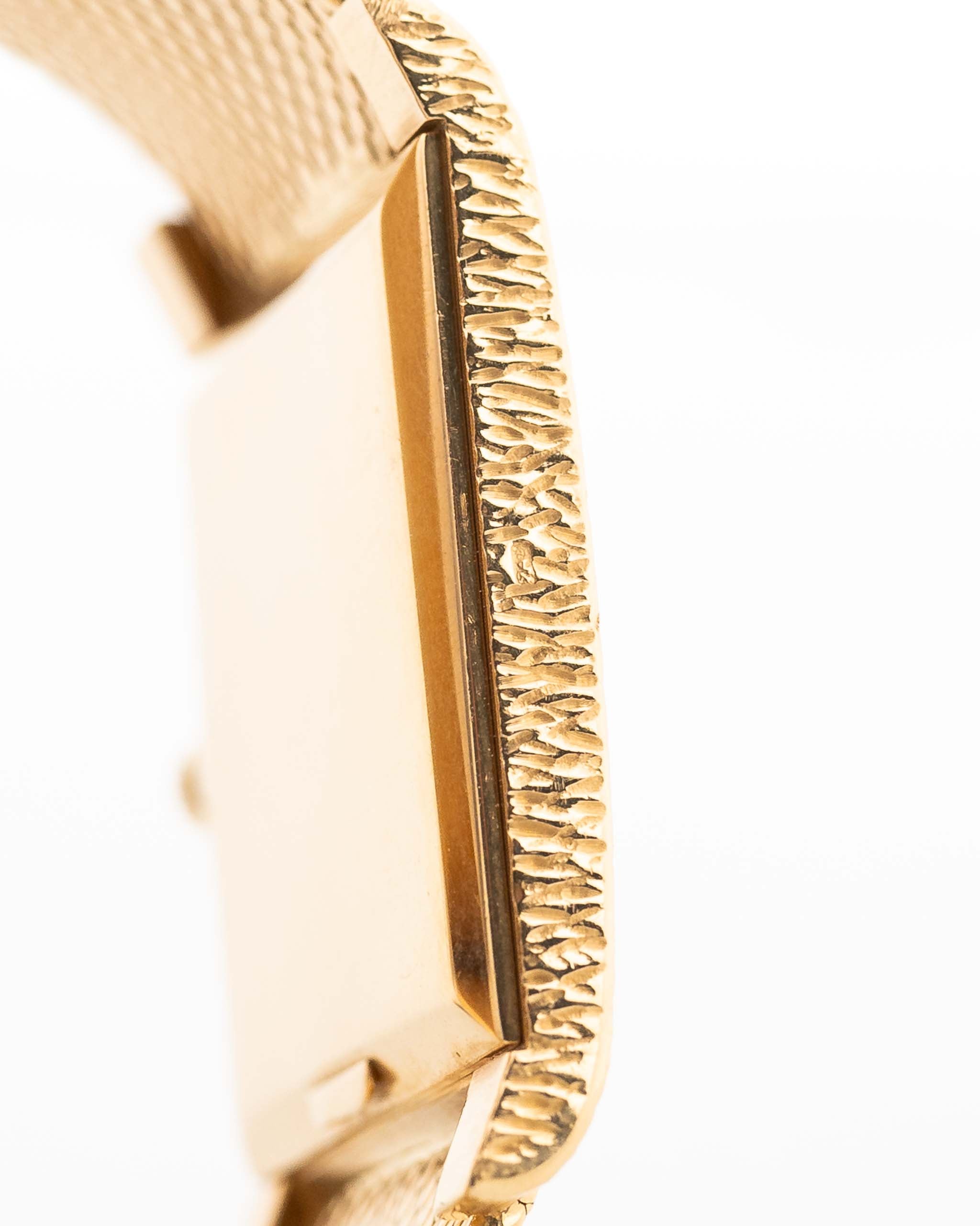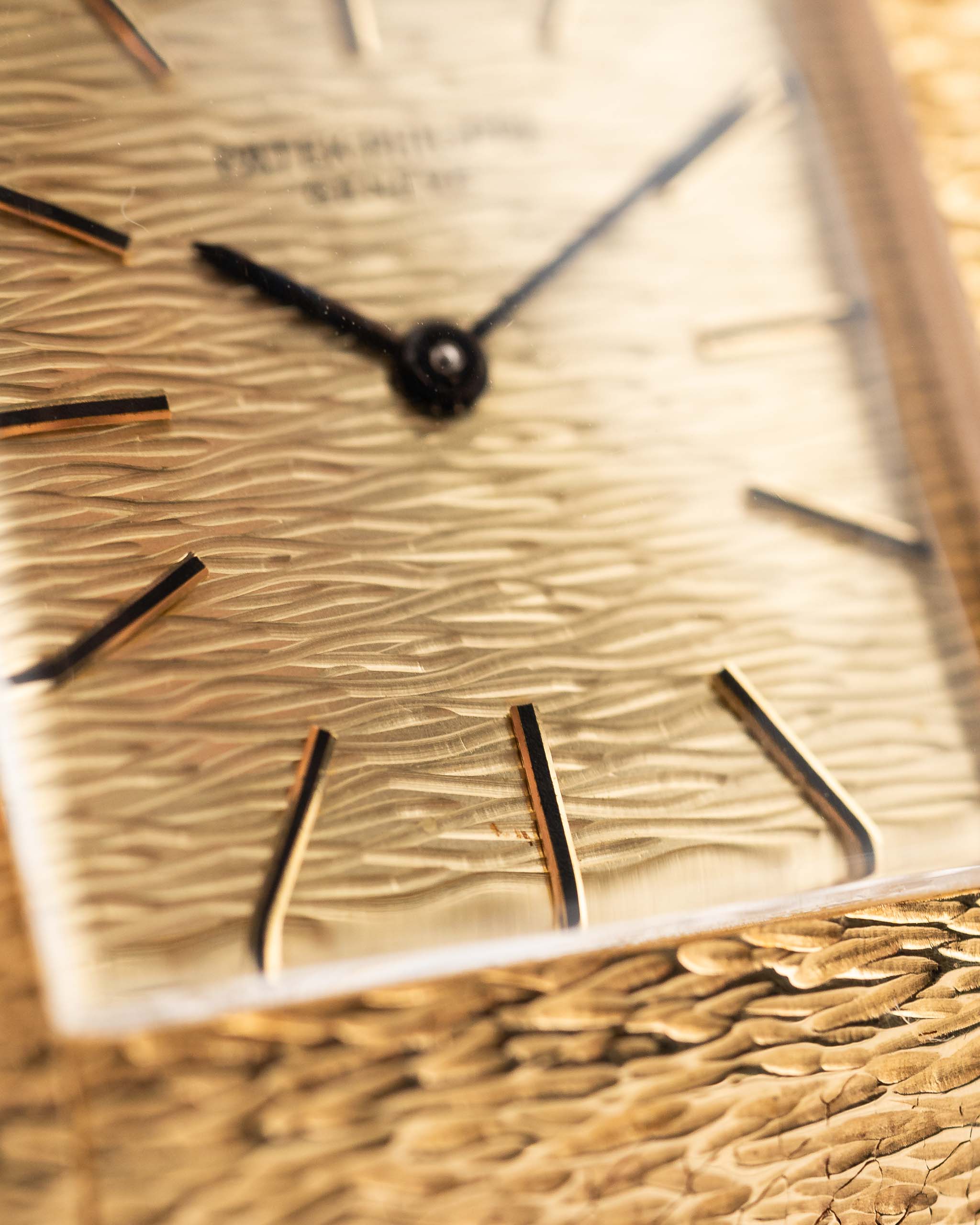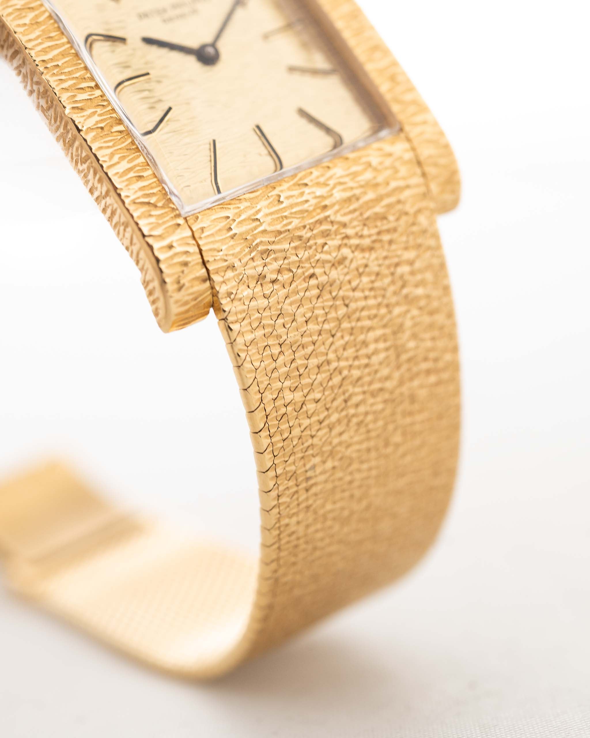 Patek Philippe has made many different models with integrated gold bracelets over the years, each standing out in their own unique way. This one comes in a (for Patek Philippe) more rare rectangular case shape and all over bark finishing.