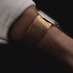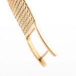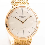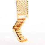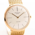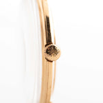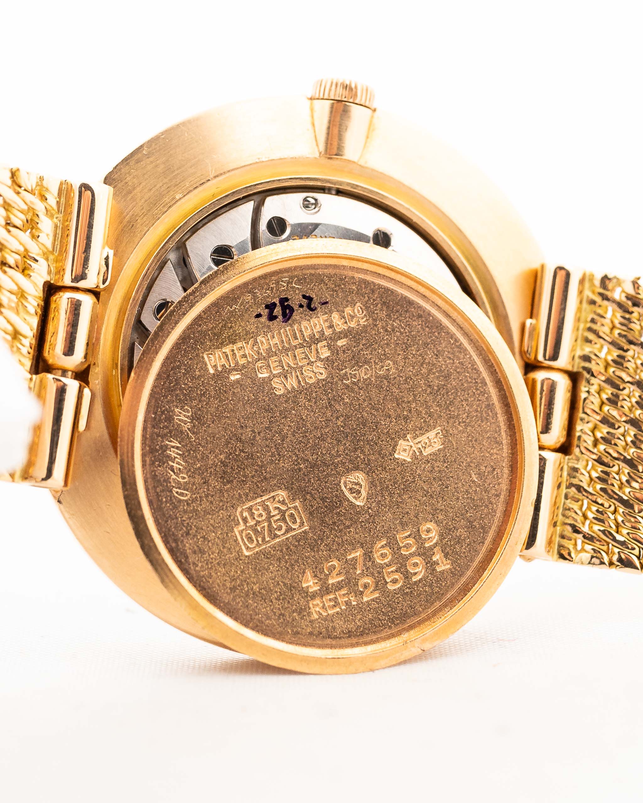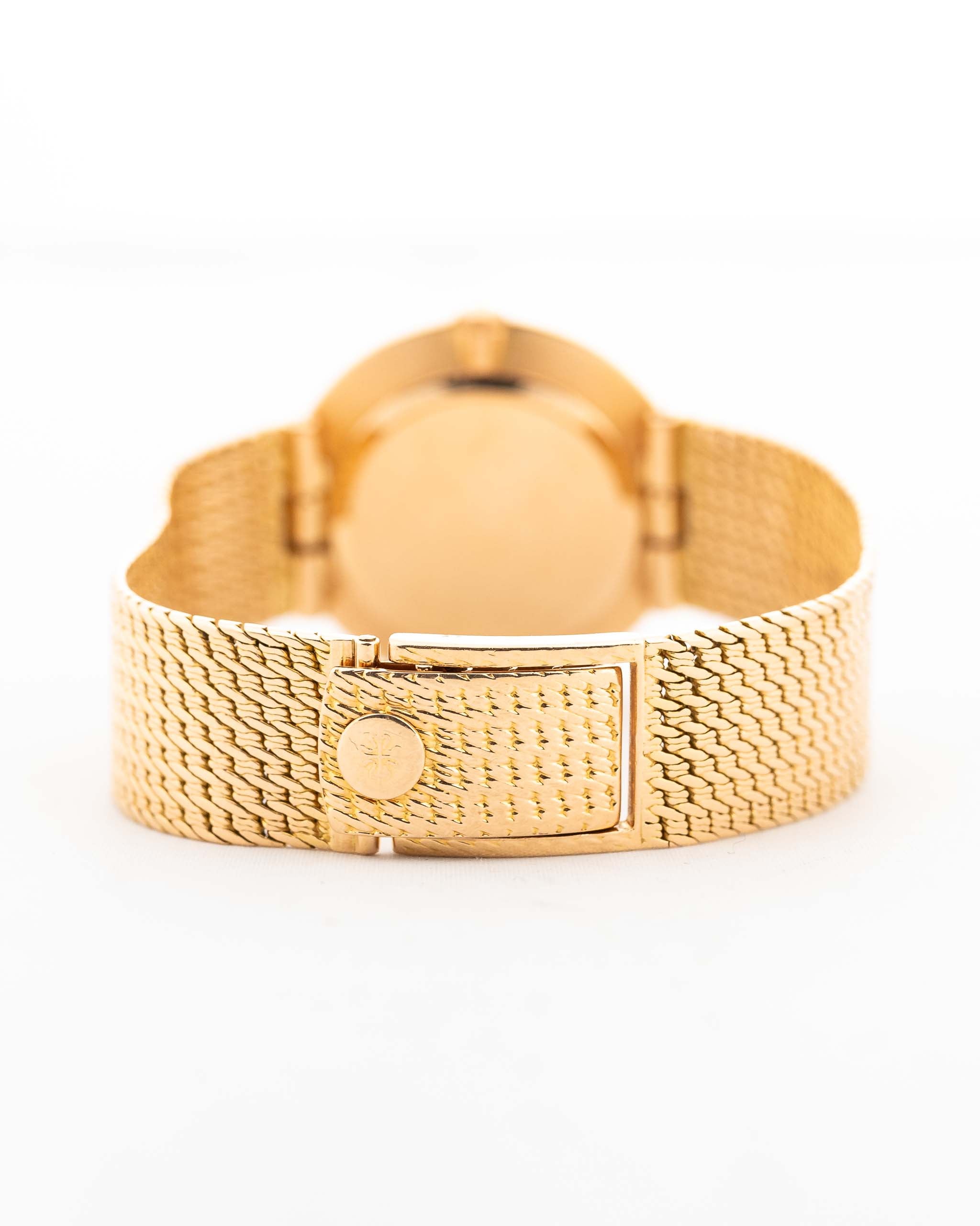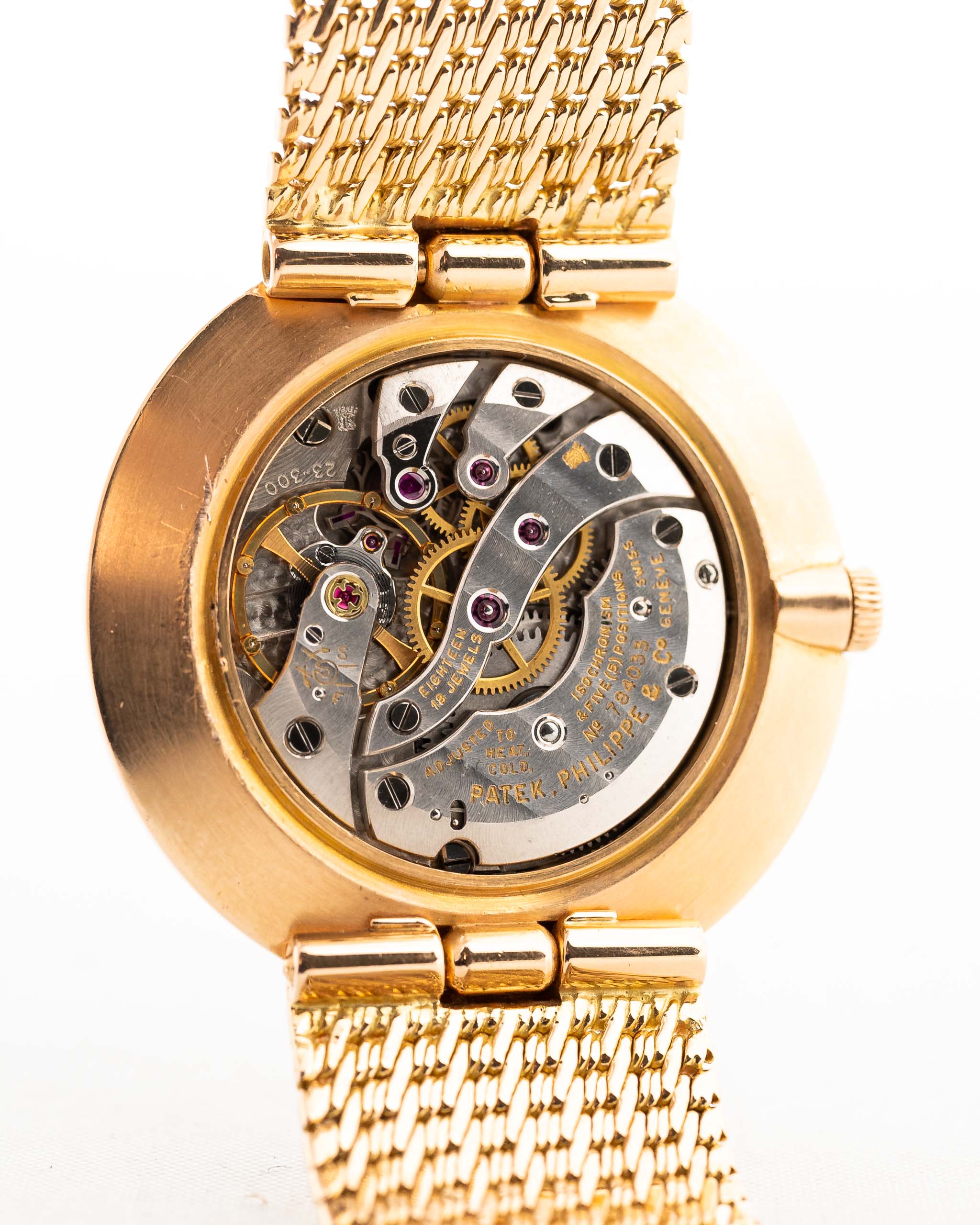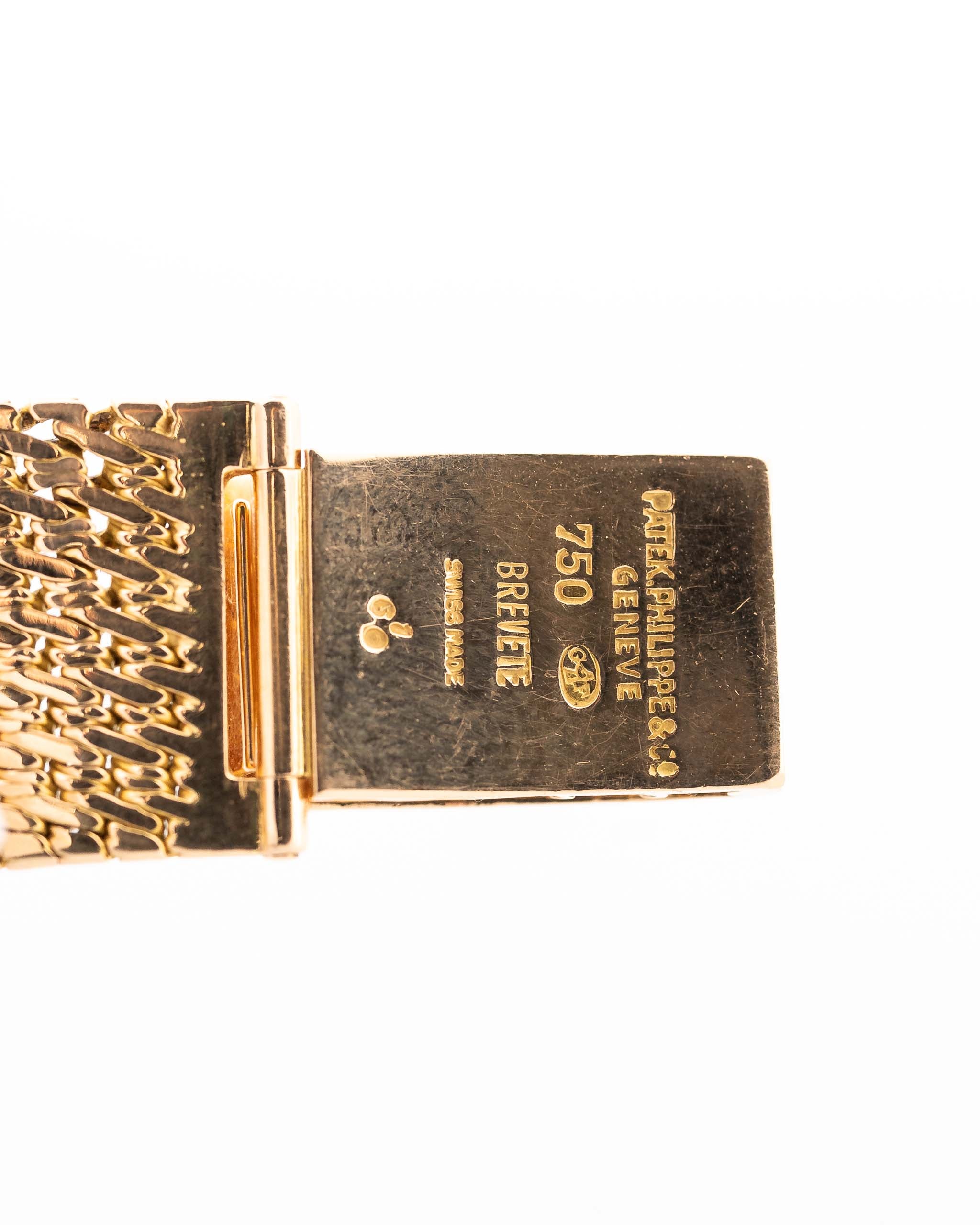 Our model features a 34.5 mm rose gold case with no lugs, 18k rose gold soft mesh bracelet with Patek Philippe clasp.