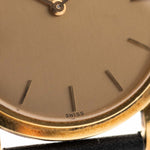 Our model features a 32 mm yellow gold case with down turned lug design, a golden colored vertical brushed dial, understatement at its best!