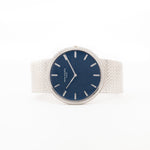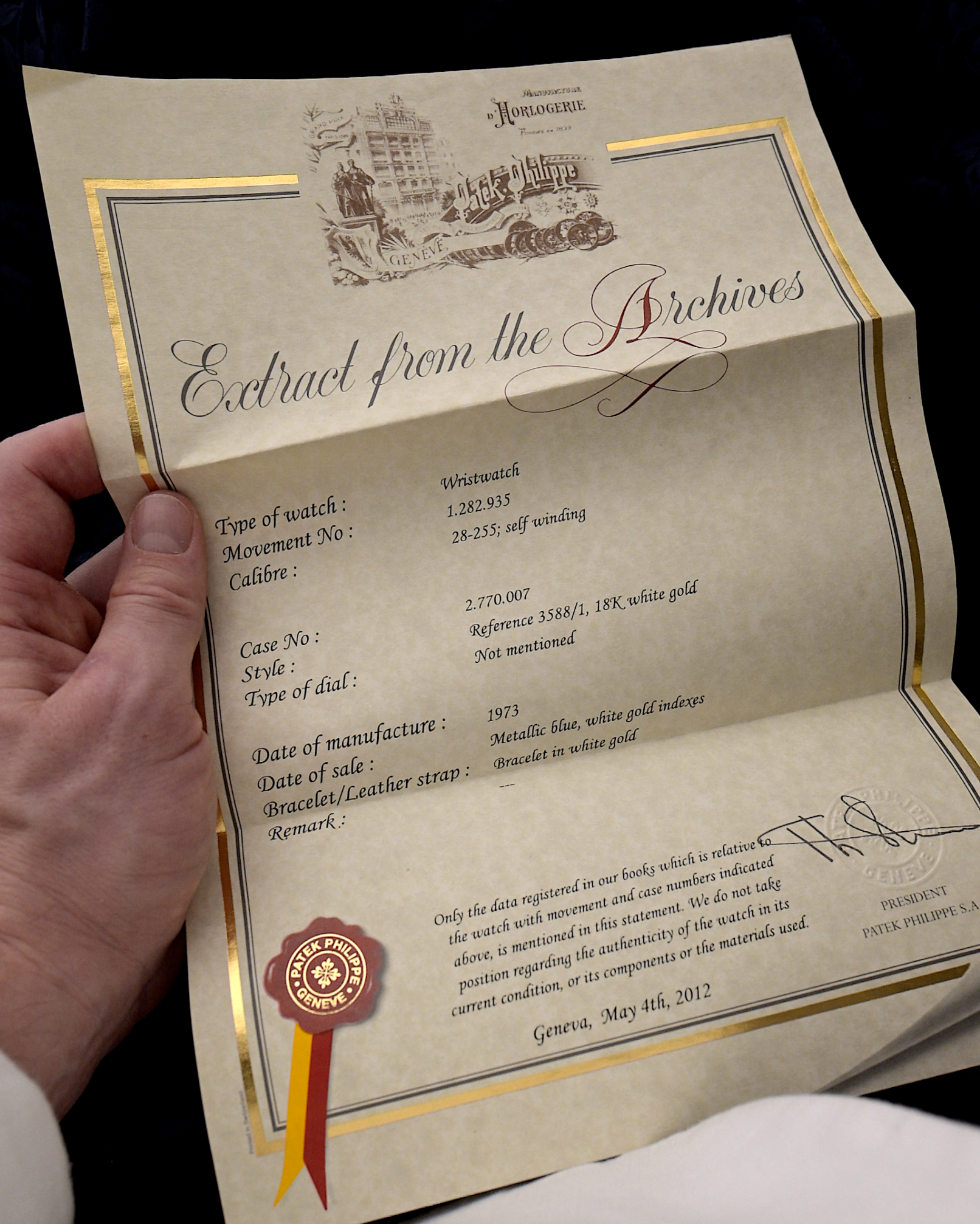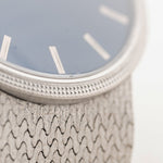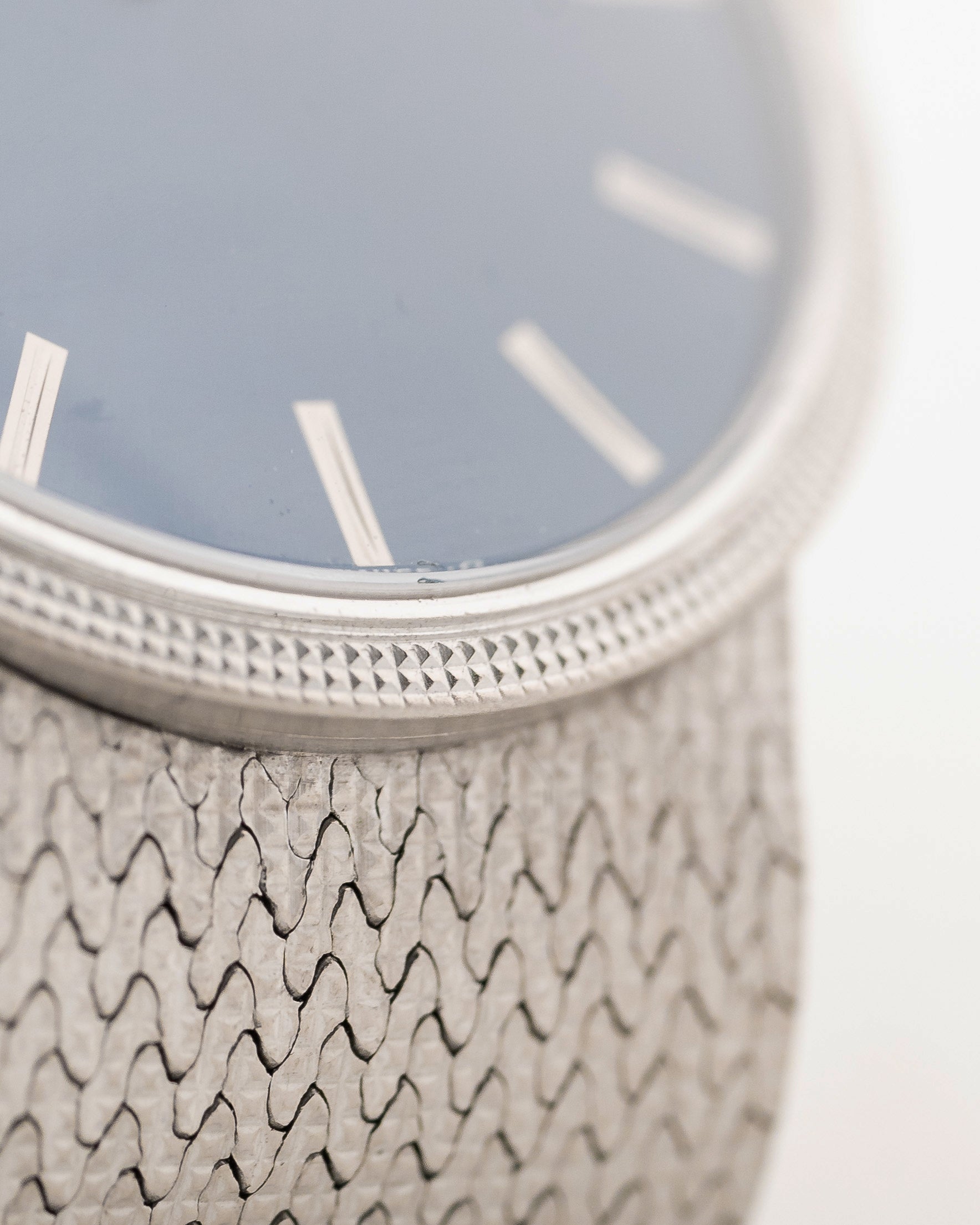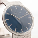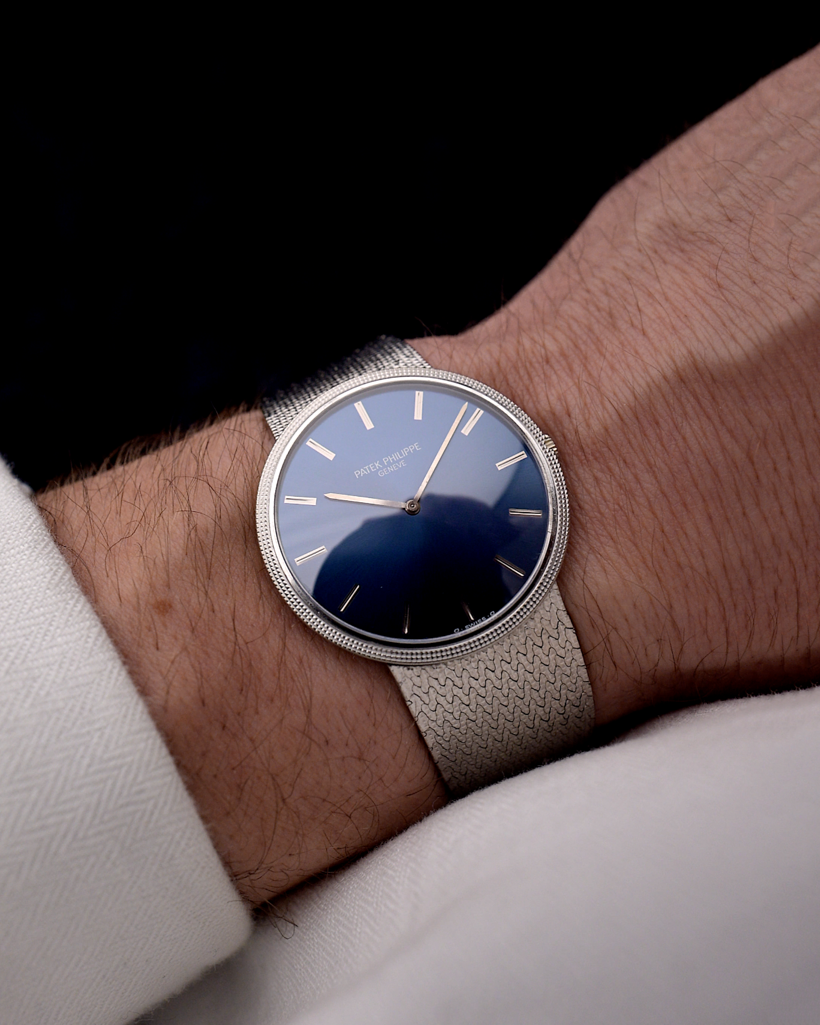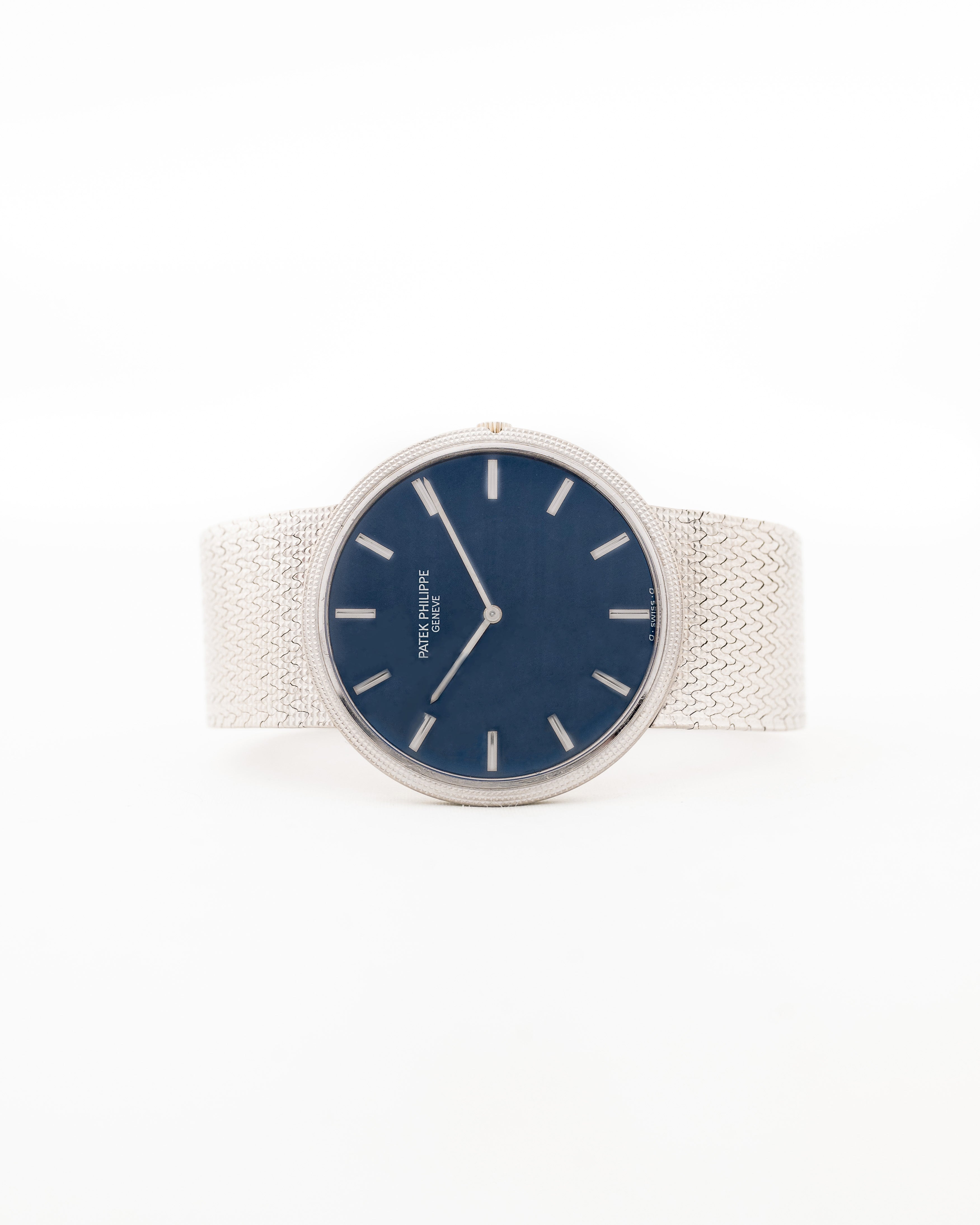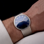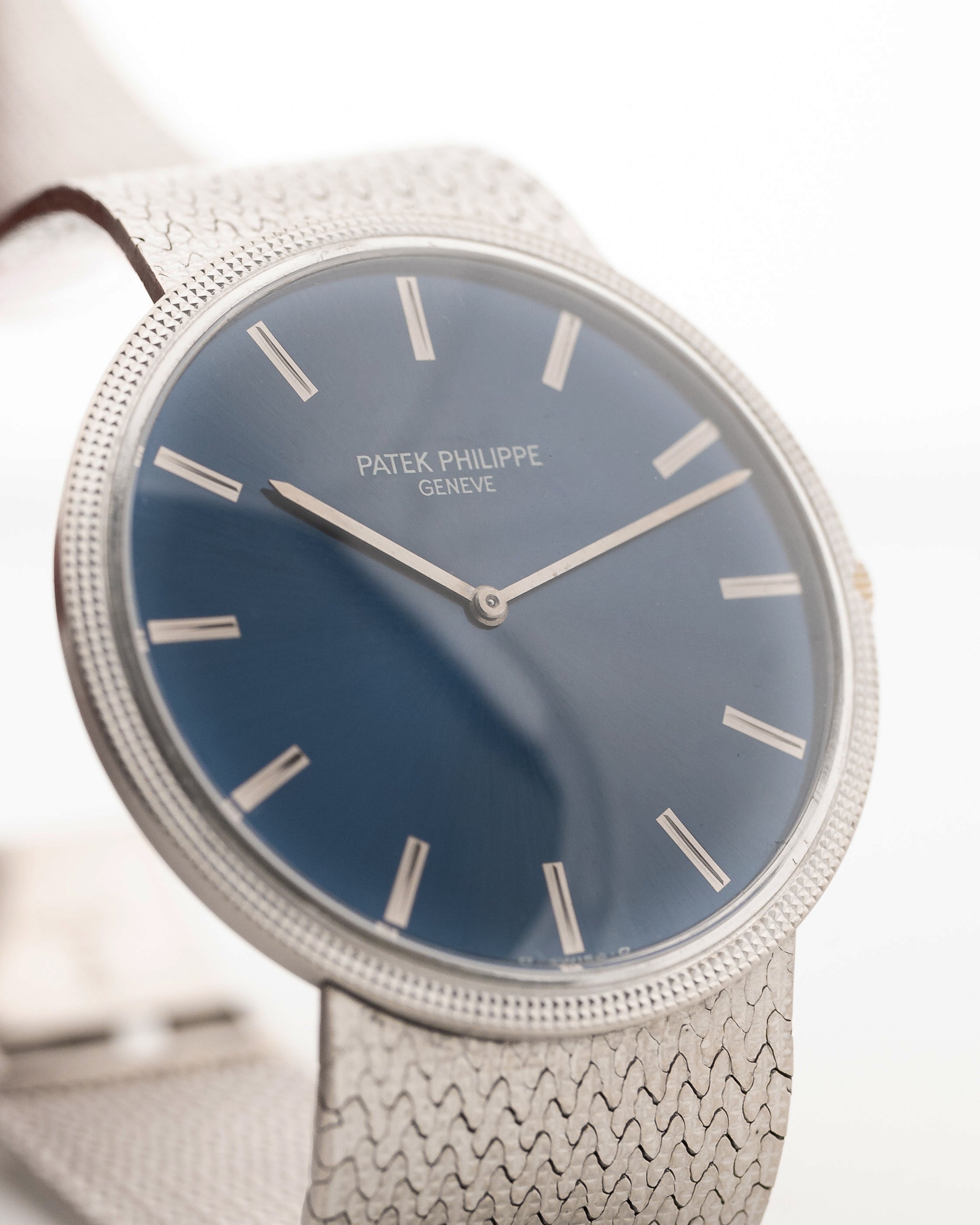 Our model features a 35 mm white gold case with no lugs, a stunning 18k blue sigma dial and an amazingly integrated 18k white gold bracelet with Patek Philippe clasp and comes with a extract of archives from Patek.