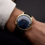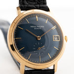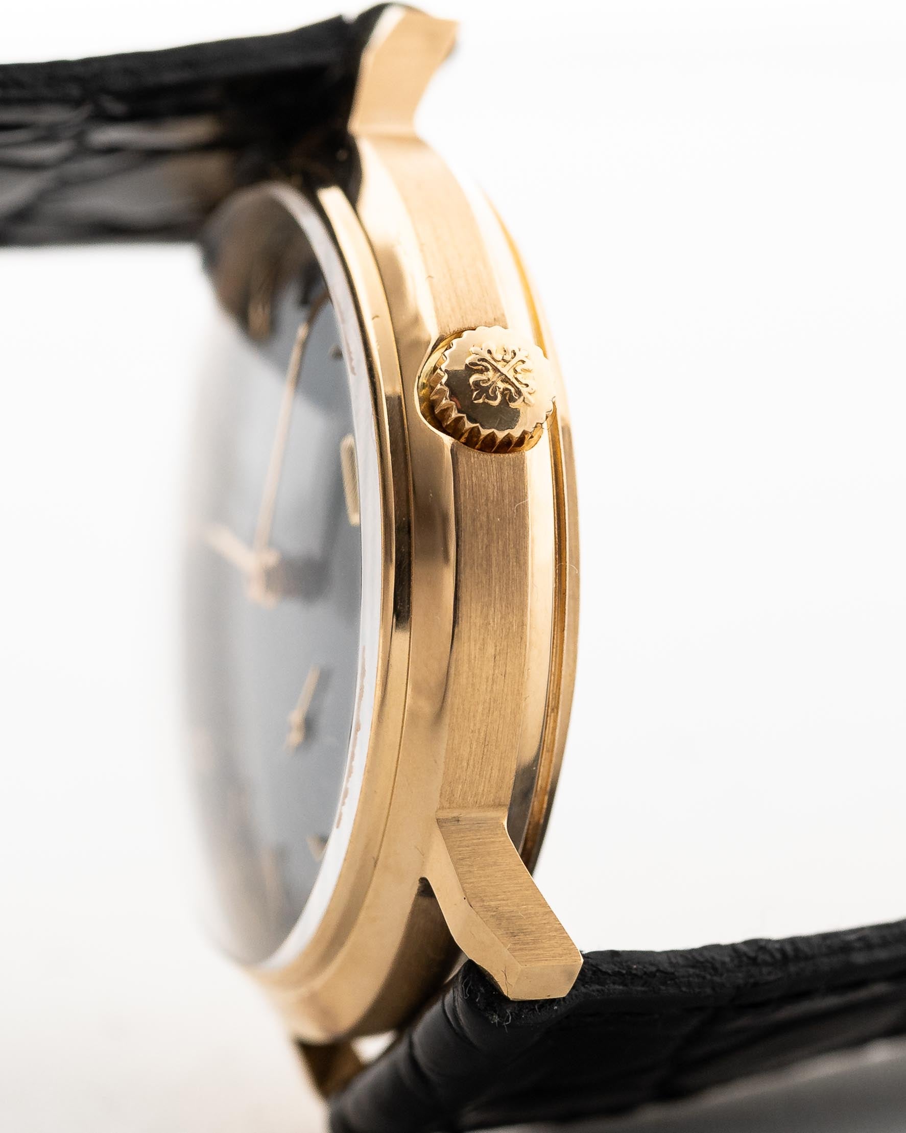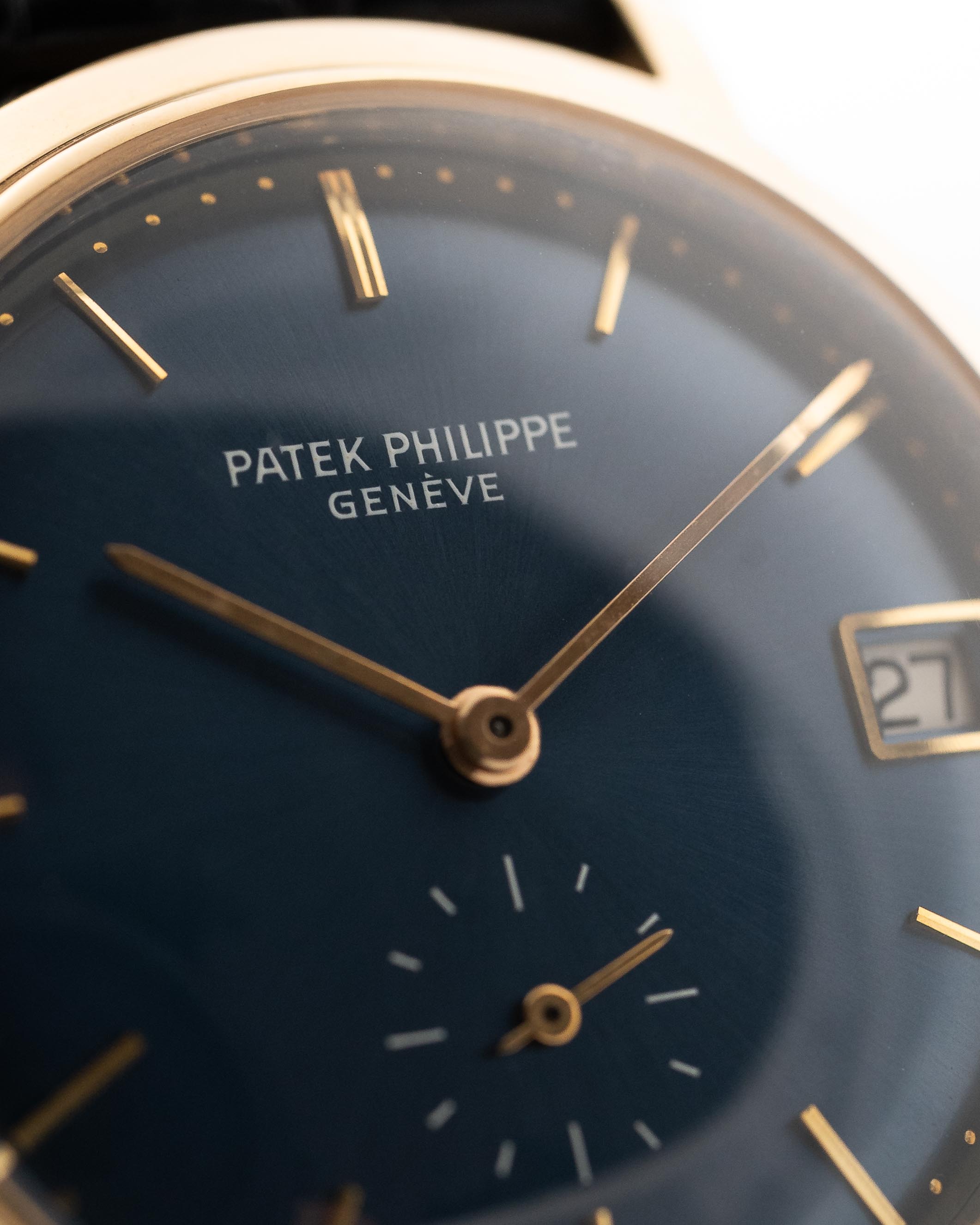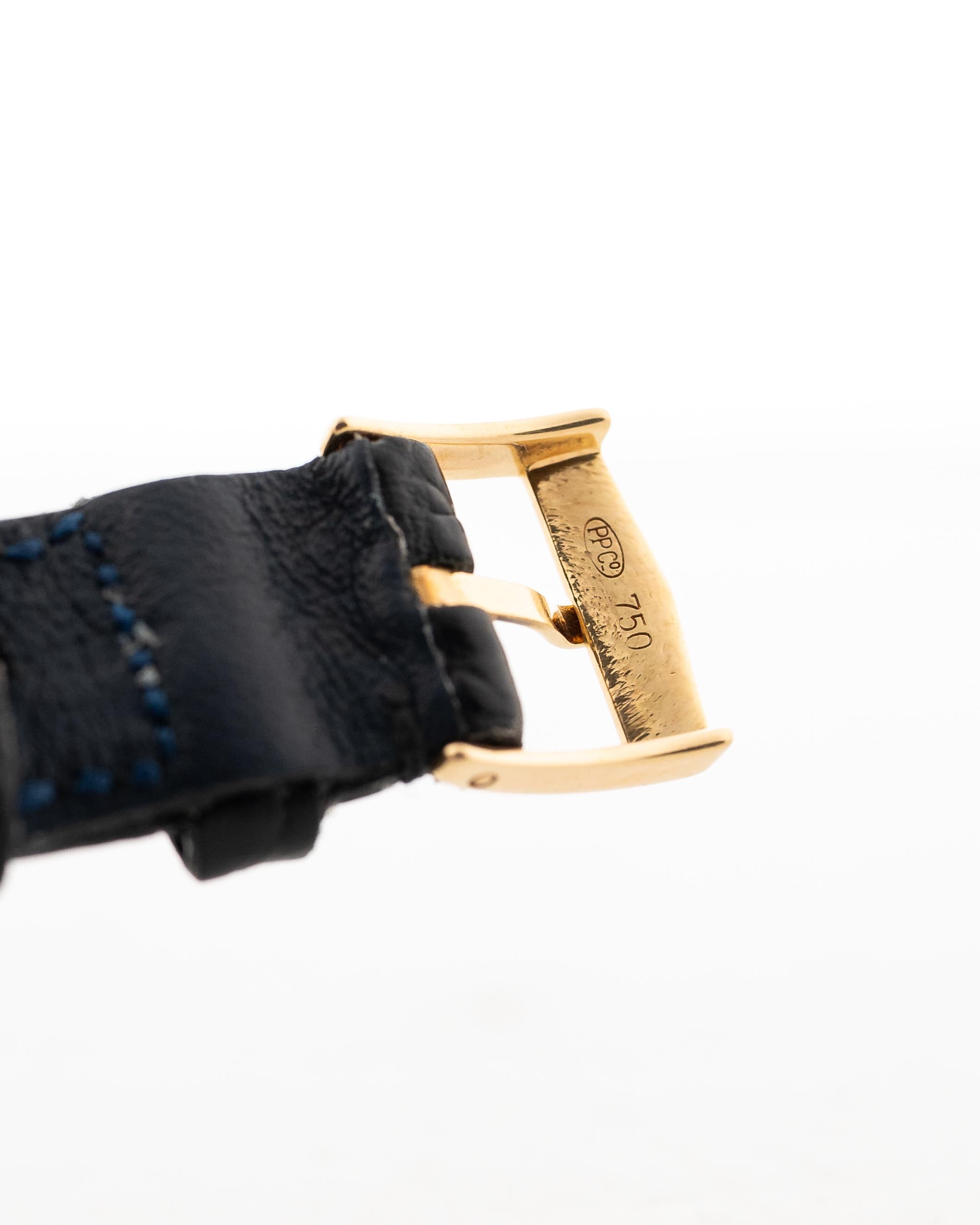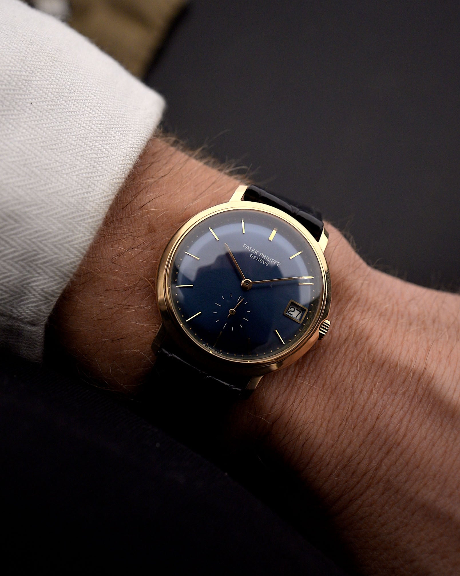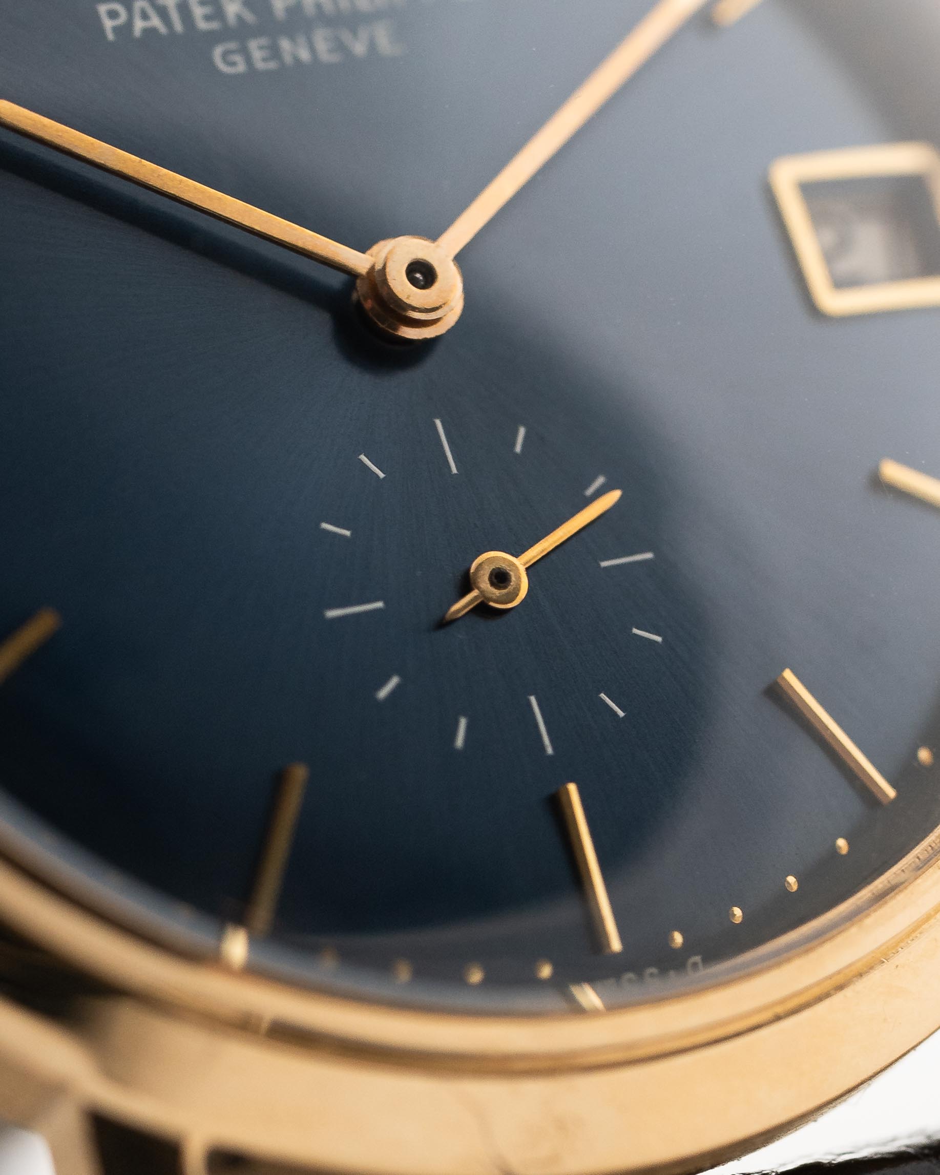 Patek kept all of the stylistic characteristics of a dress watch, which explains the elegant look of the 3445. With this reference, the crown is recessed into the yellow-gold case, further adding to the elegance of the watch. Similarly, the thin and long indexes bring an outstanding balance to the deep blue sigma sunburst dial.