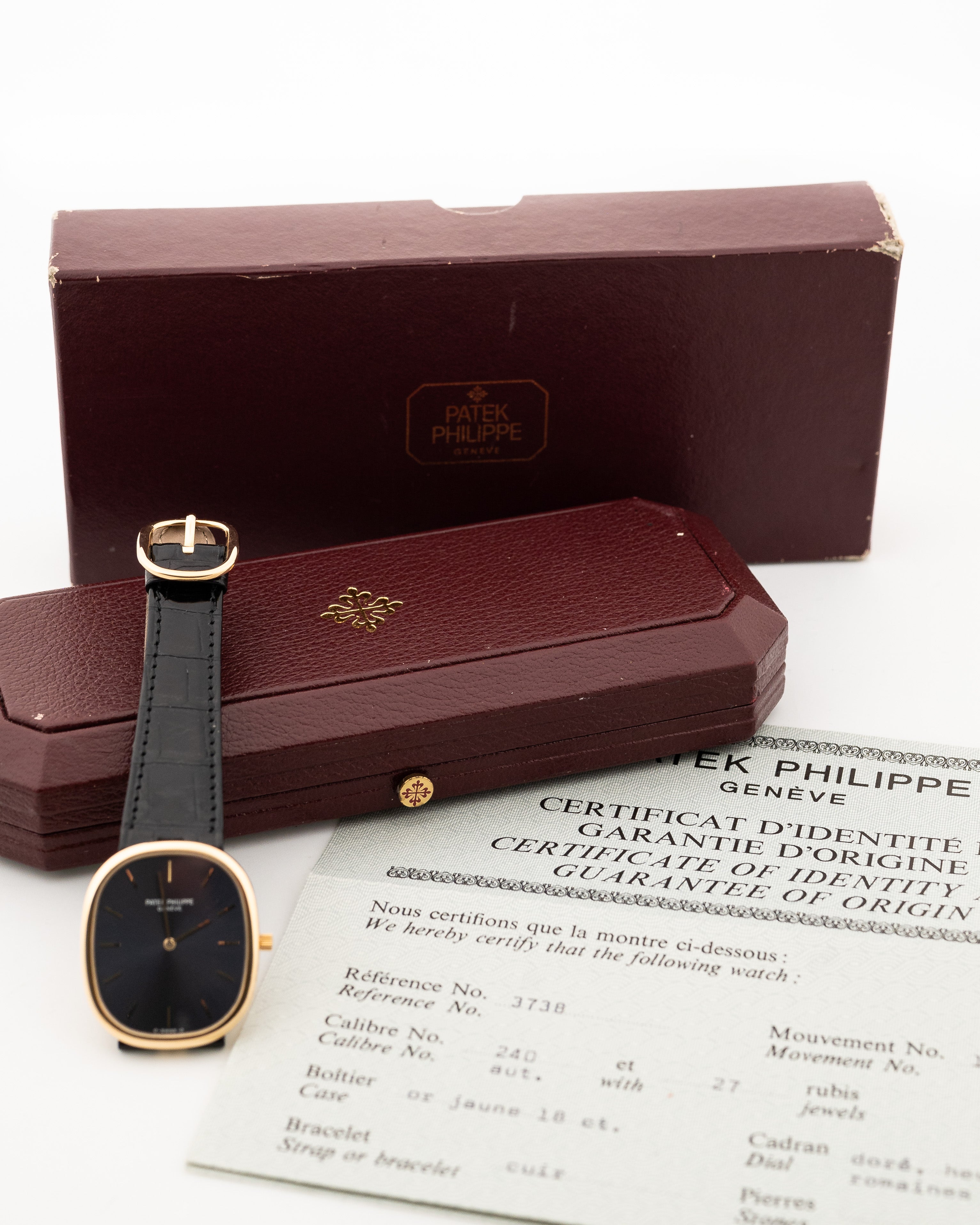 Our reference 3738, also known as the Jumbo model comes in outstanding nos condition and a stunning blue sigma sunburst dial with the Patek Philippe automatic Cal. 240 including the original box and papers.