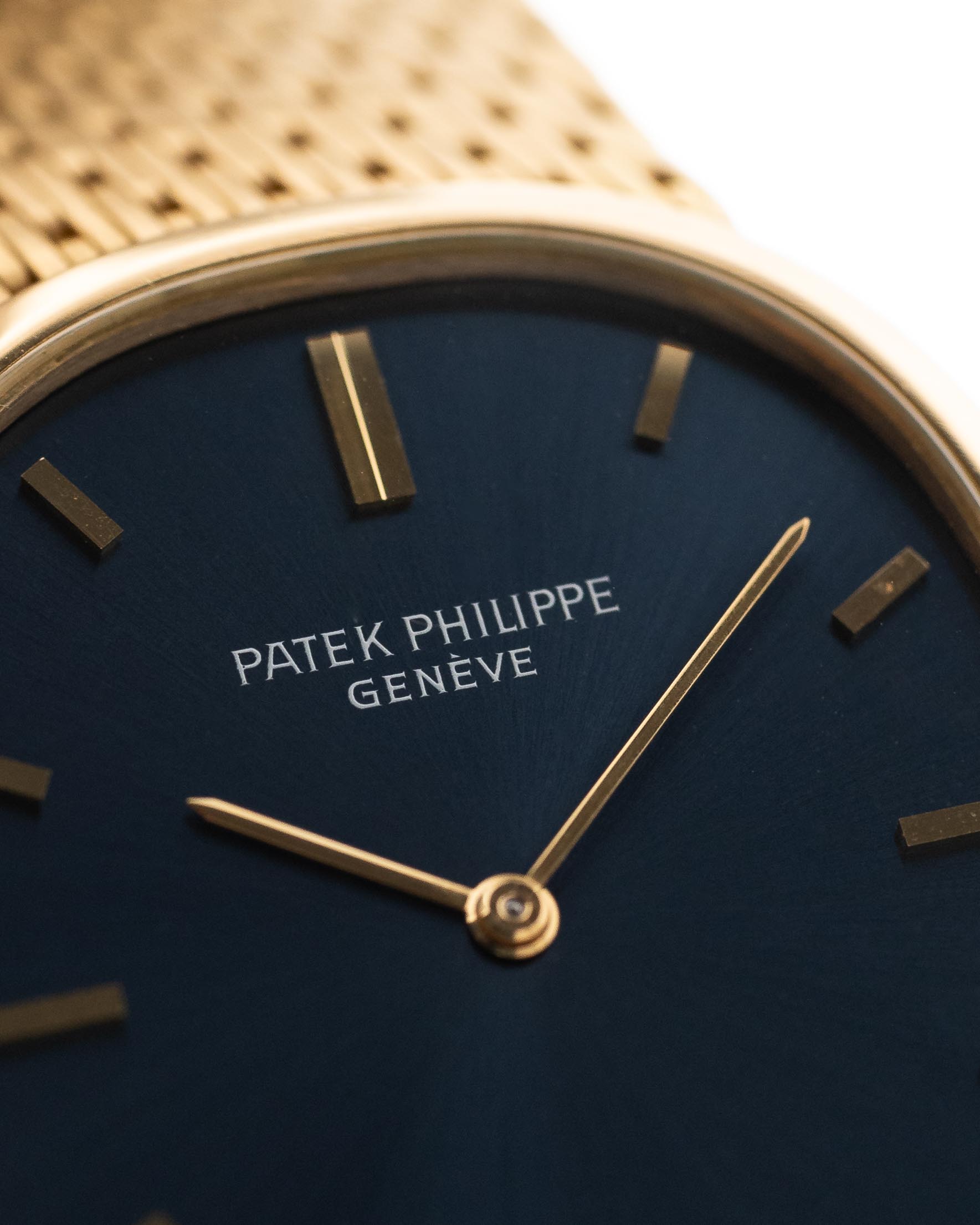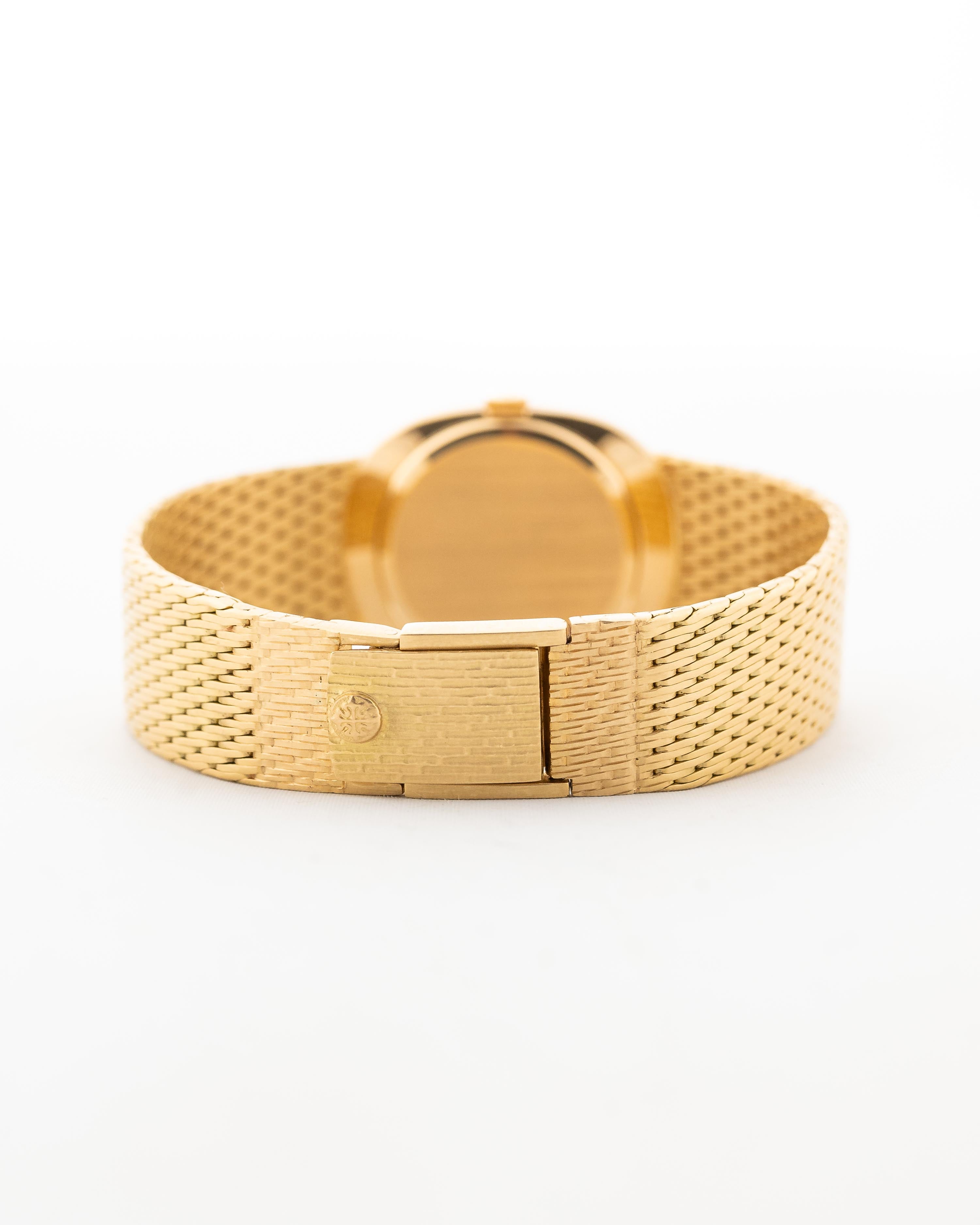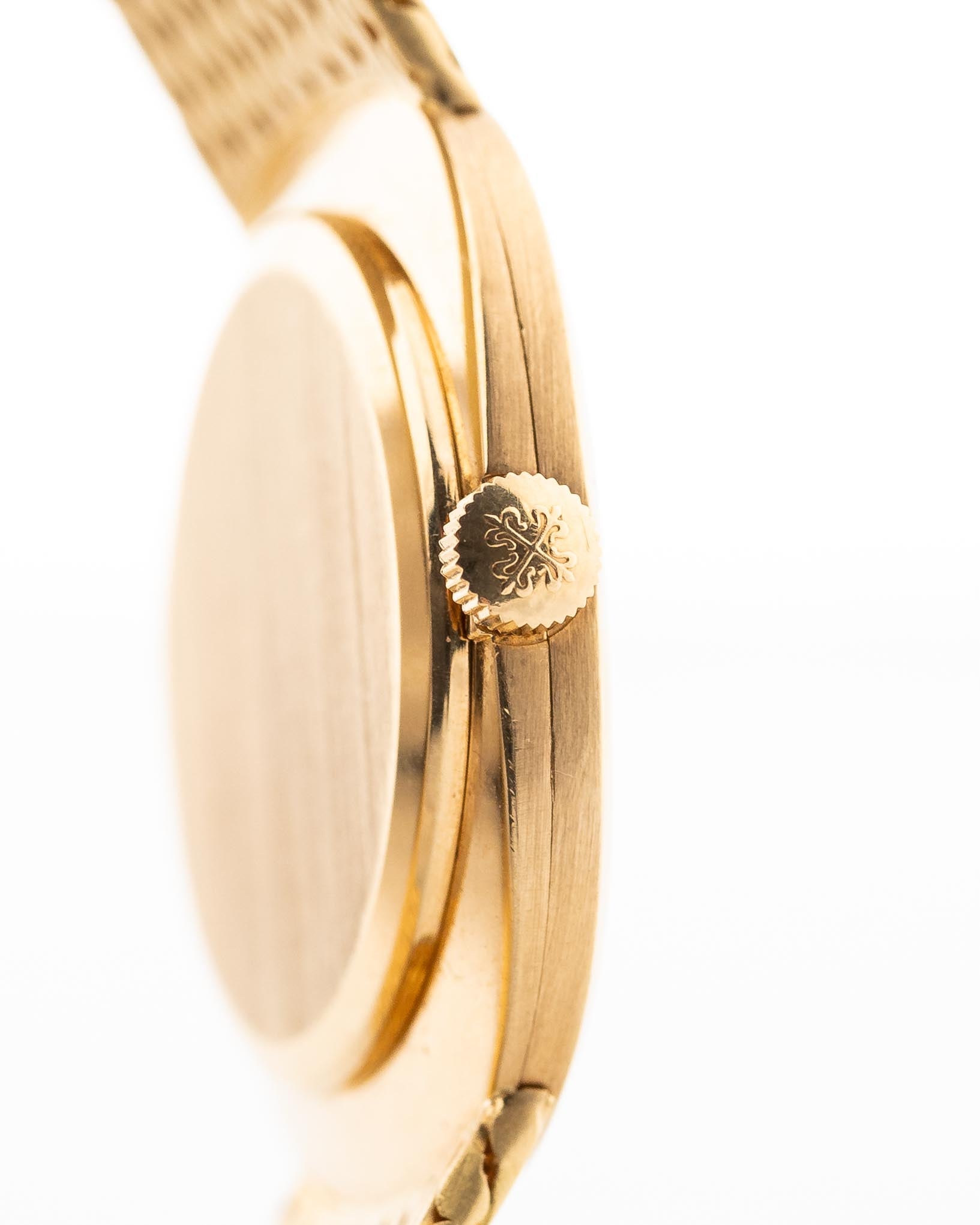 • original Patek Philippe 18k integrated yellow gold bracelet (Ateliers Reunis) is fitting up to 18.5 cm wrist size (was professionally extended in the past) / 2 mm thick