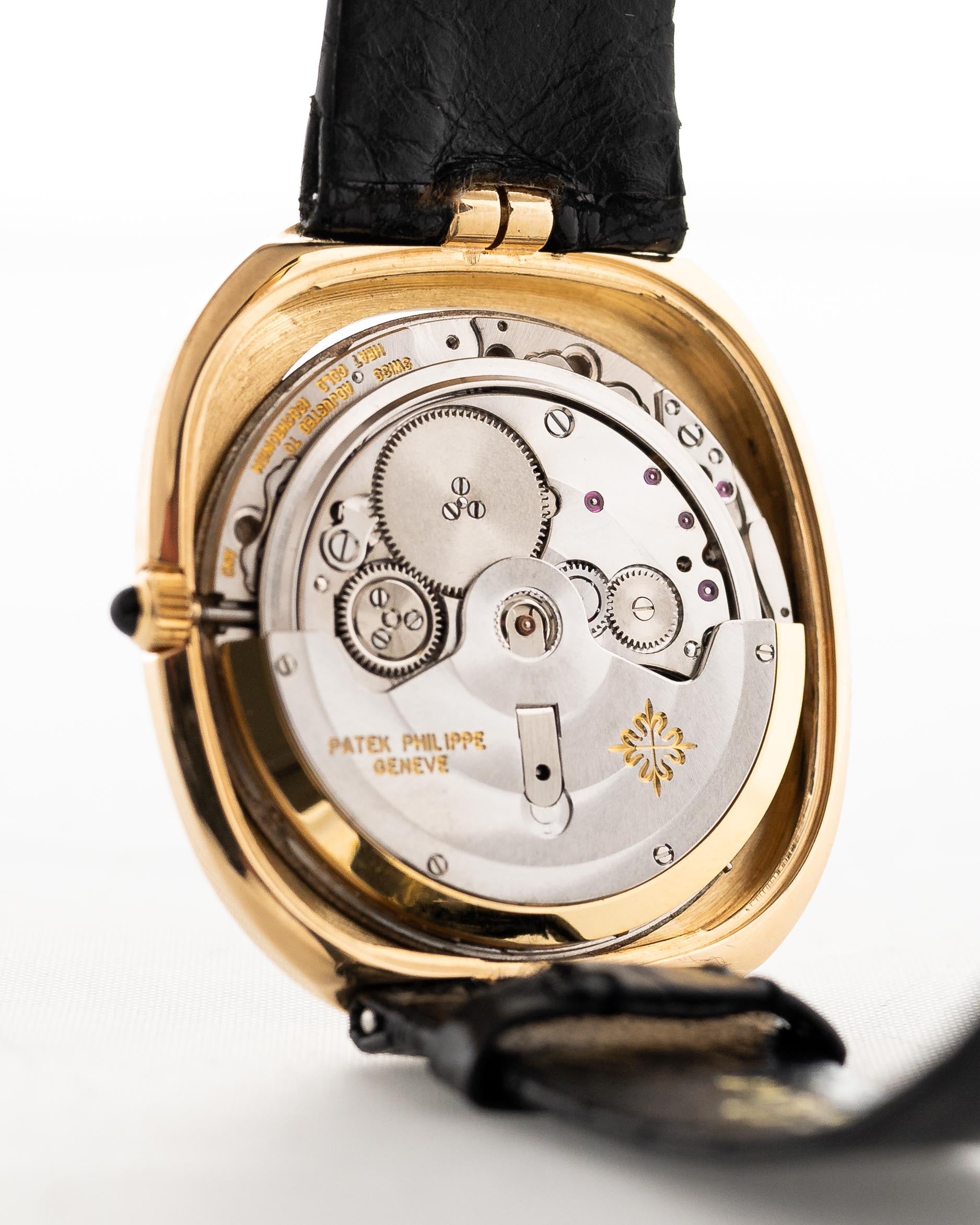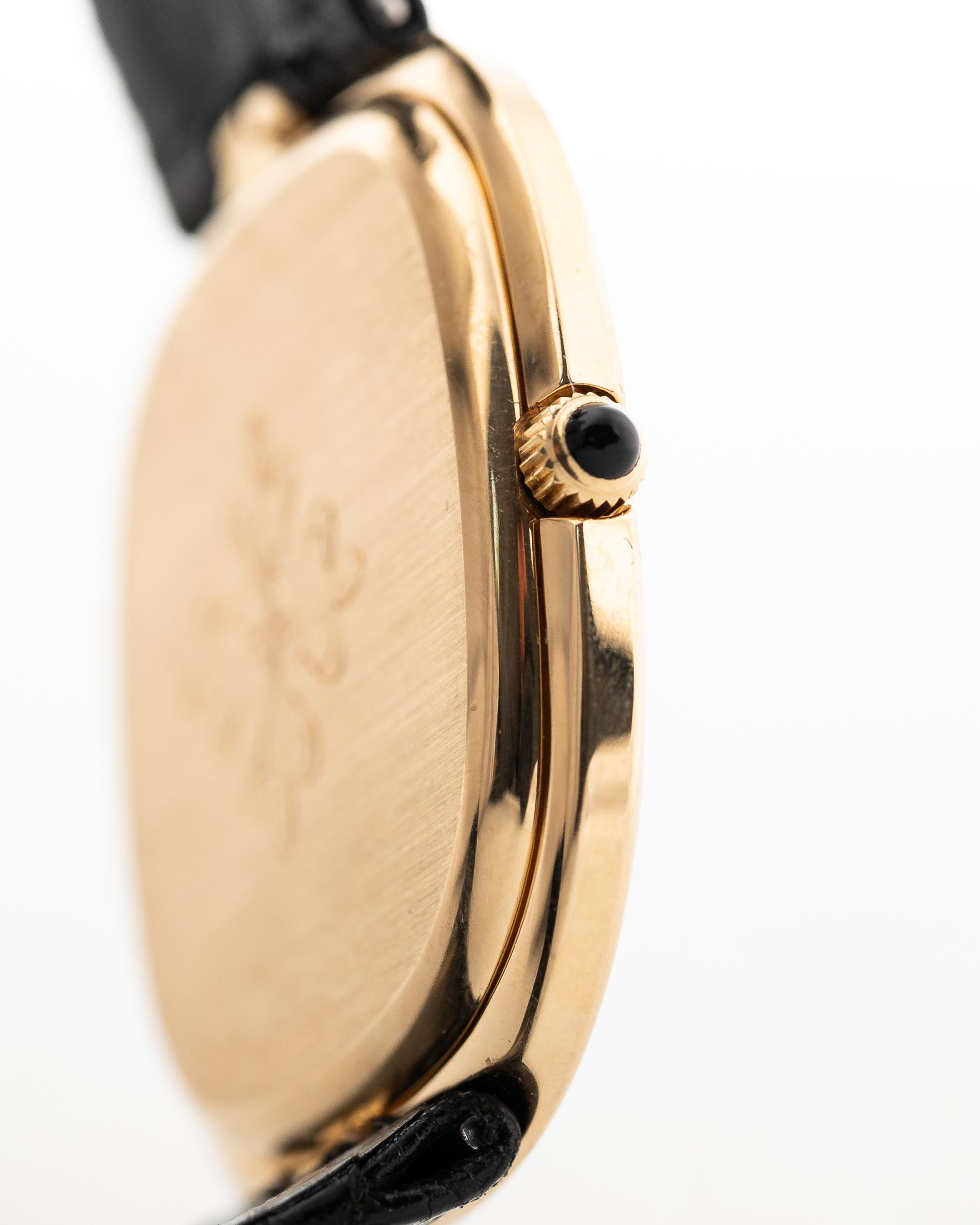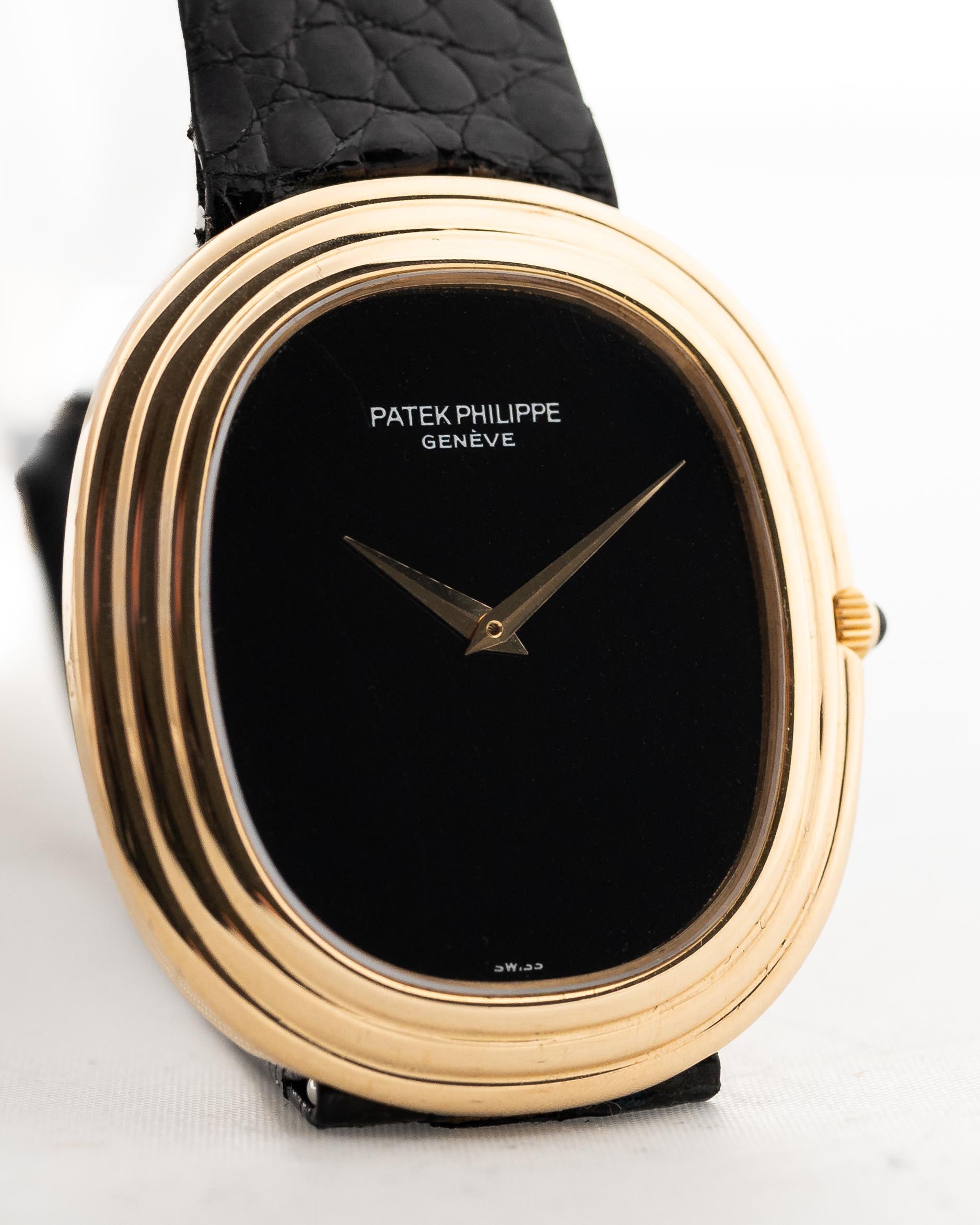Our reference 3634 is a special Ellipse with its three-step case design and so large bezel. Even more rare is the deep black onyx stone dial with the alpha 18k gold hand set. Its comes in fantastic condition including the original Patek Philippe leather strap and an 18k yellow gold Patek Philippe folding clasp. Inside we have the legendary automatic calibre 28-255, the same movement as the 3700 Nautilus.