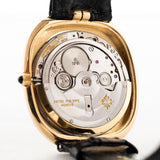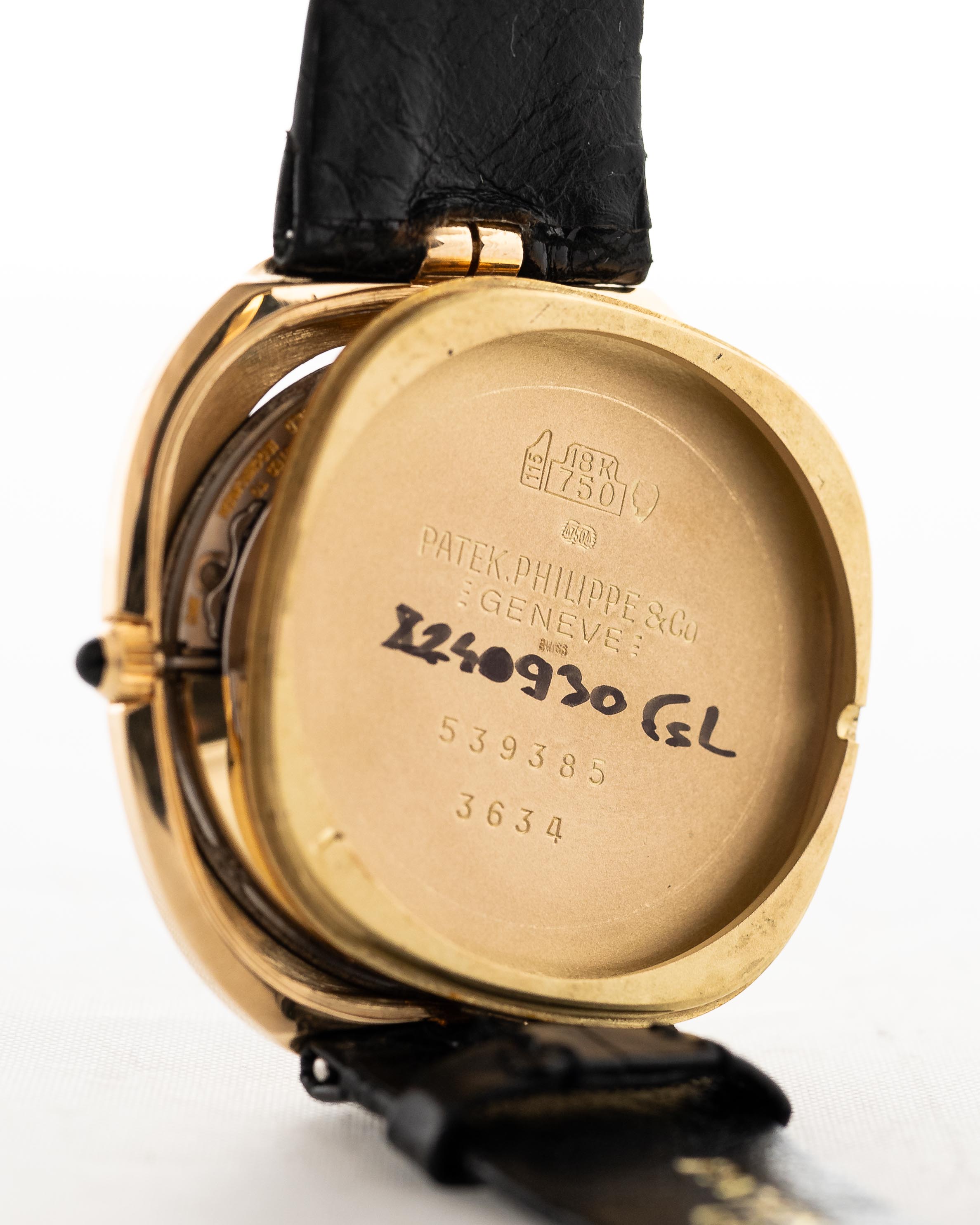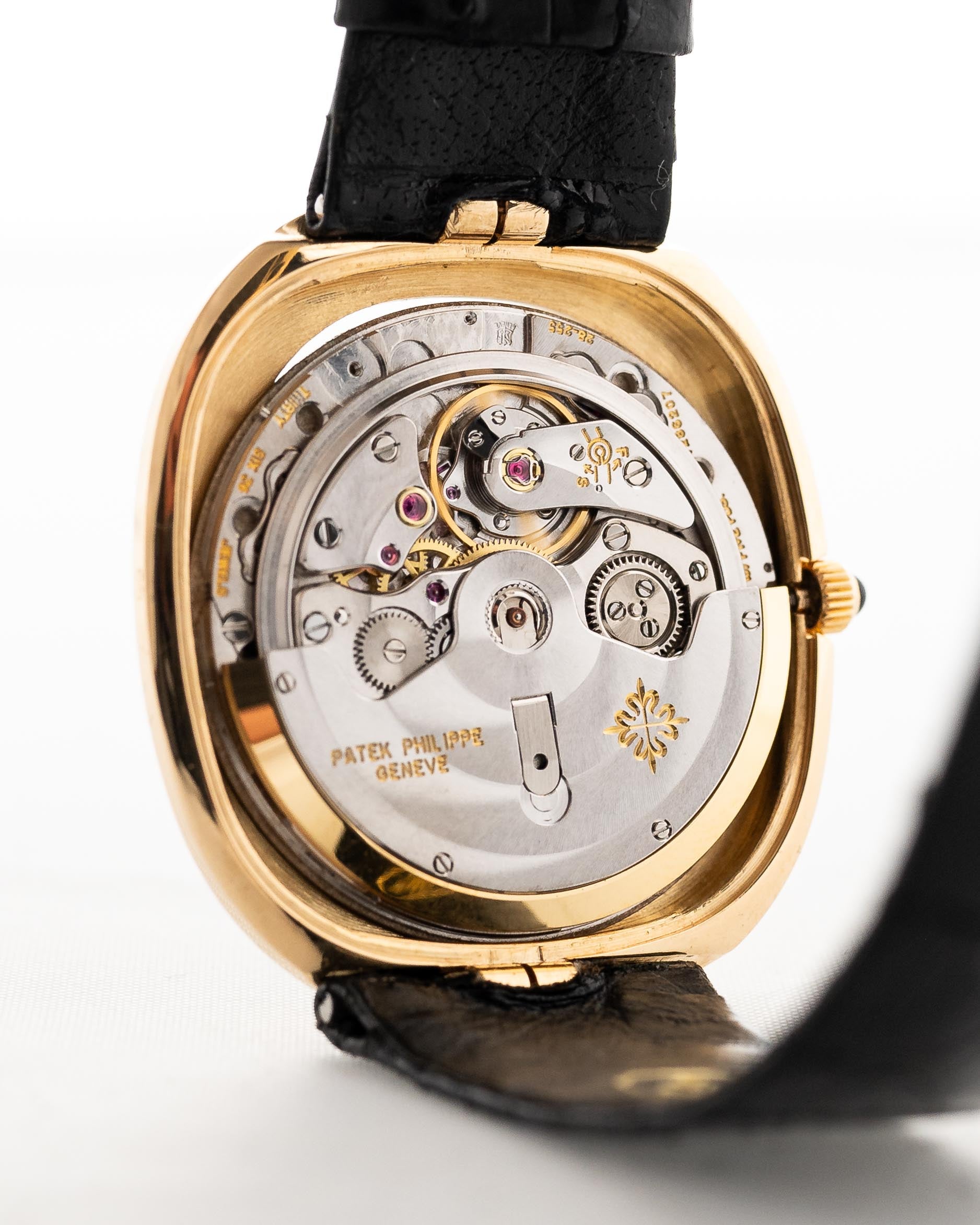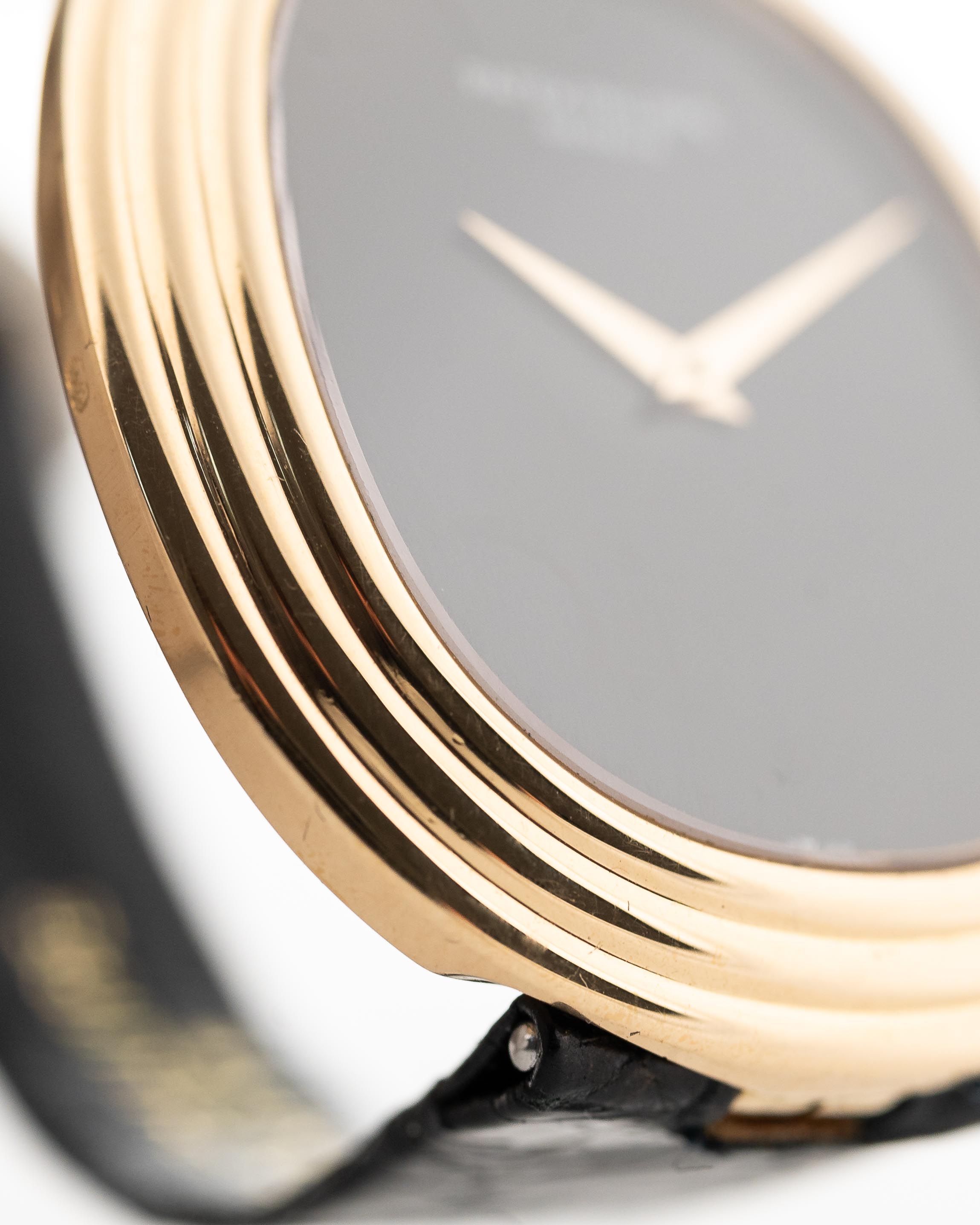 Our reference 3634 is a special Ellipse with its three-step case design and so large bezel. Even more rare is the deep black onyx stone dial with the alpha 18k gold hand set. Its comes in fantastic condition including the original Patek Philippe leather strap and an 18k yellow gold Patek Philippe folding clasp. Inside we have the legendary automatic calibre 28-255, the same movement as the 3700 Nautilus.