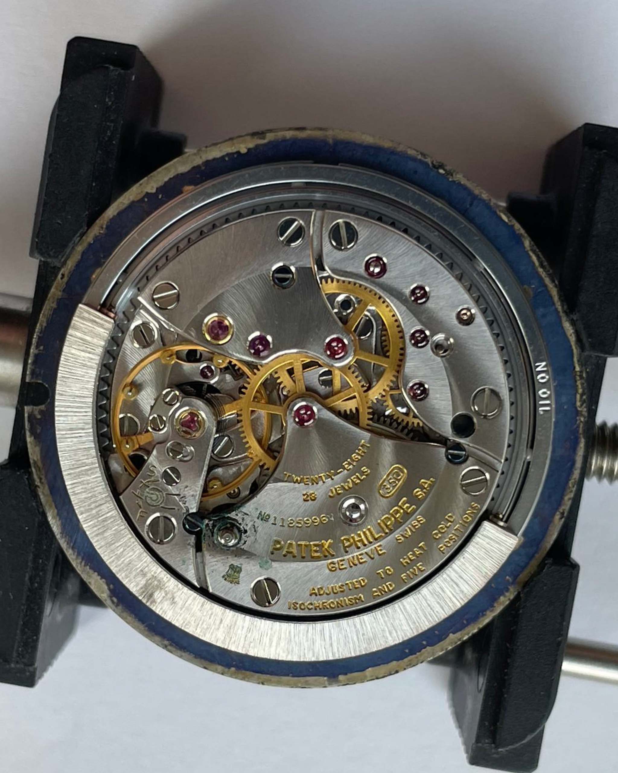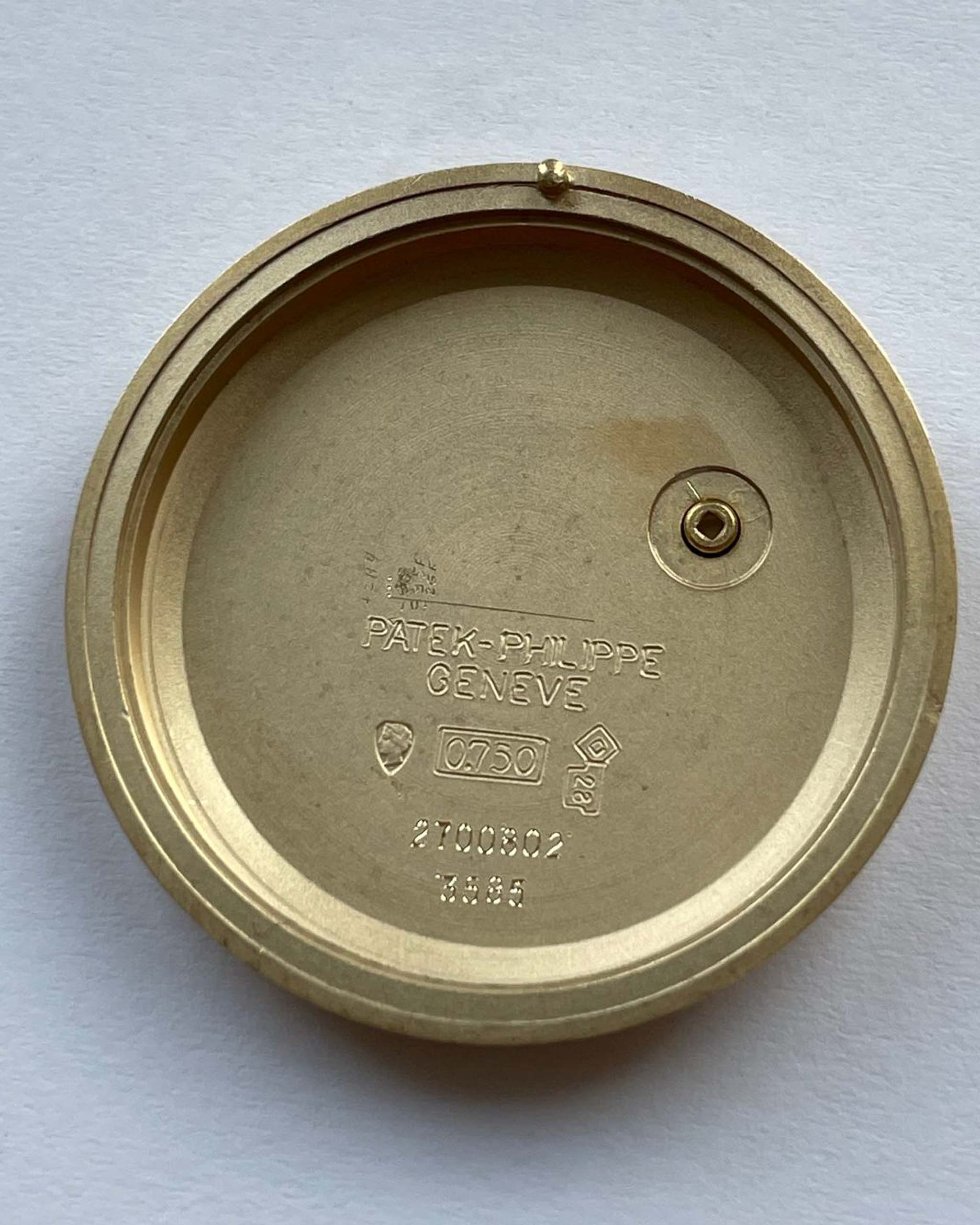 The navy blue Sigma dial — crafted from solid gold and adorned with a fine textured finish — has developed a mesmerizing stardust-like patina, making this watch feel more like a canvas than a timekeeper. Its clean design and minimalist layout are contrasted by hidden eccentricity: the Caliber 350 is wound automatically, but the crown is discreetly tucked on the caseback — a hallmark of Patek’s innovative era.