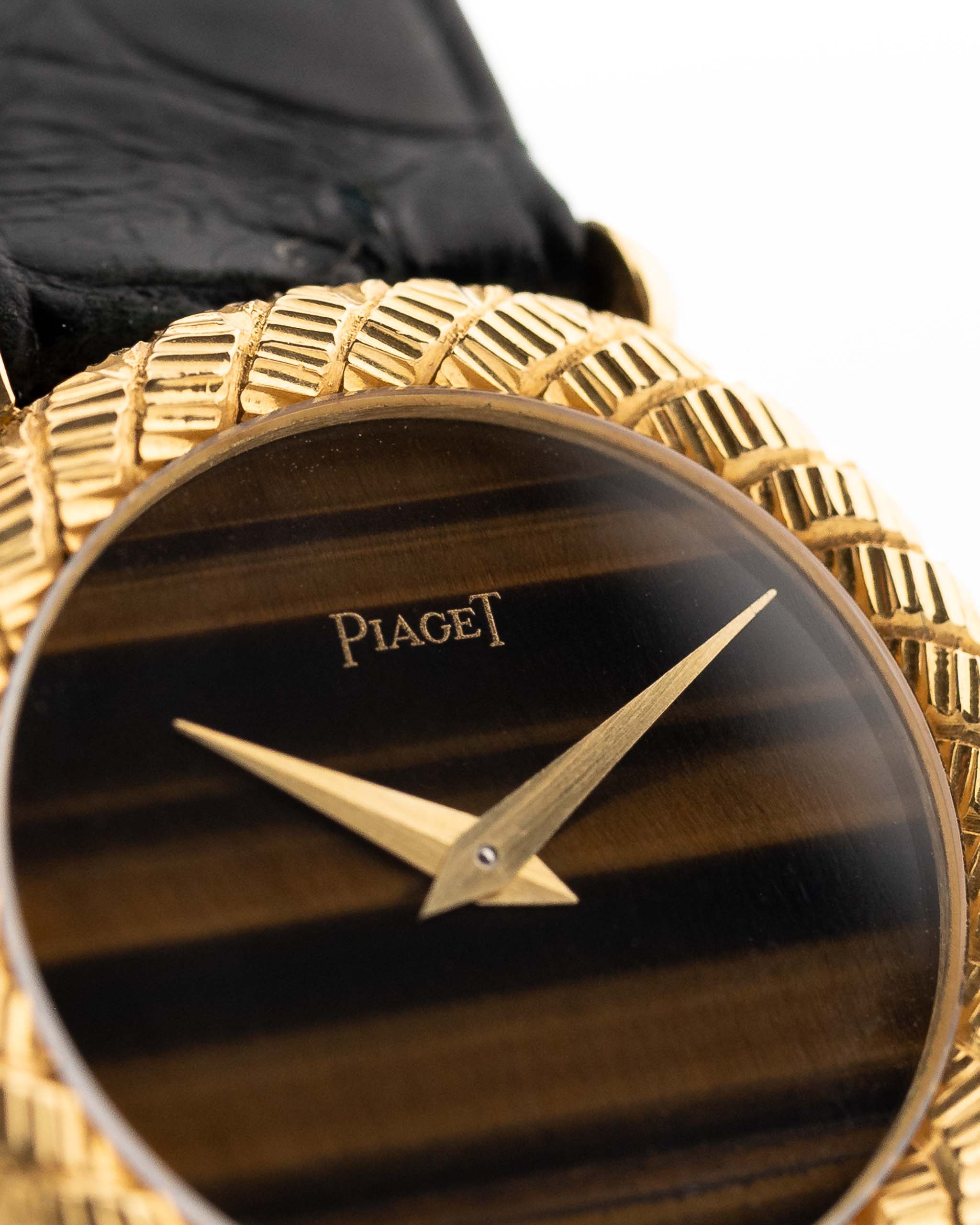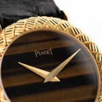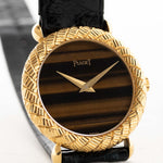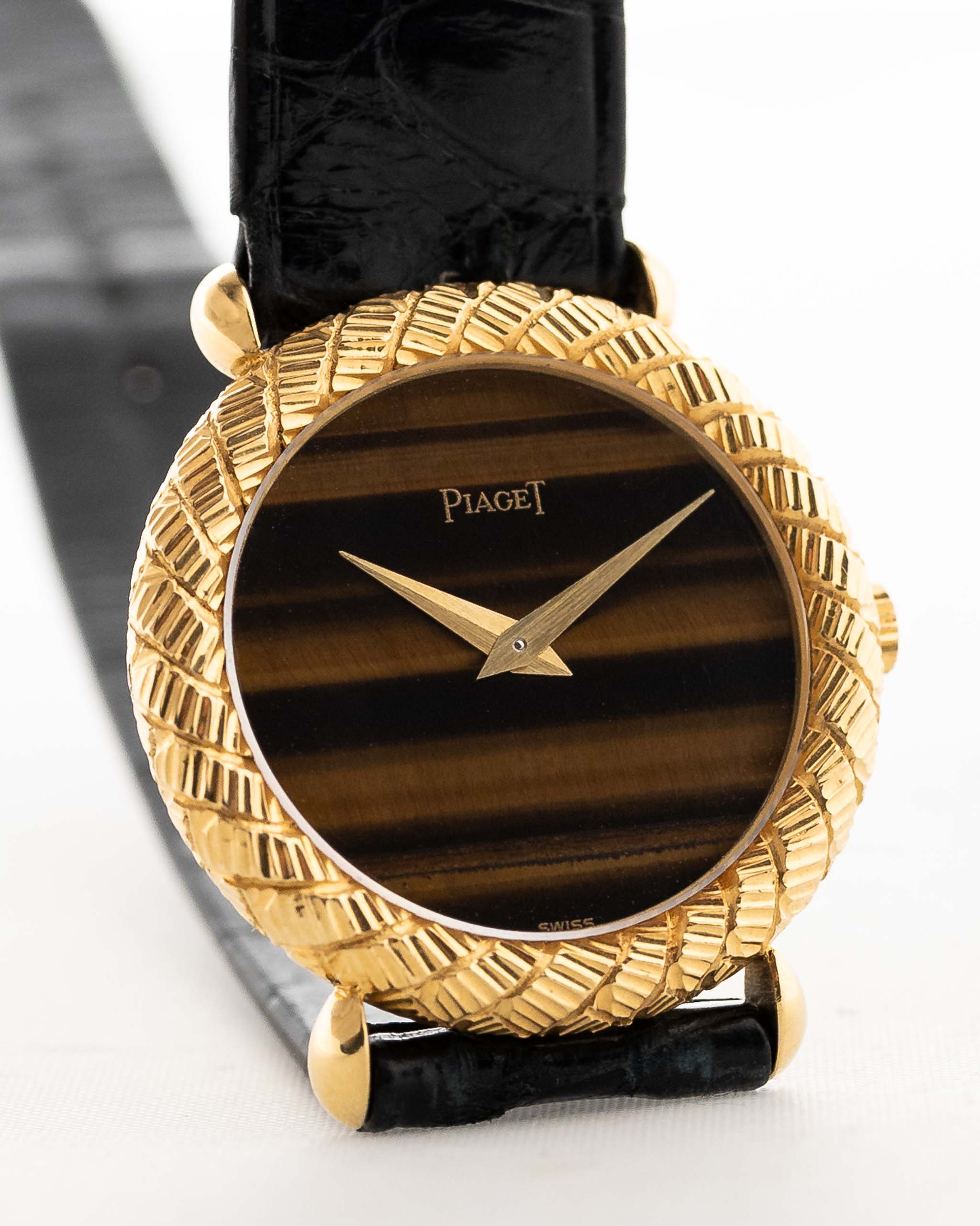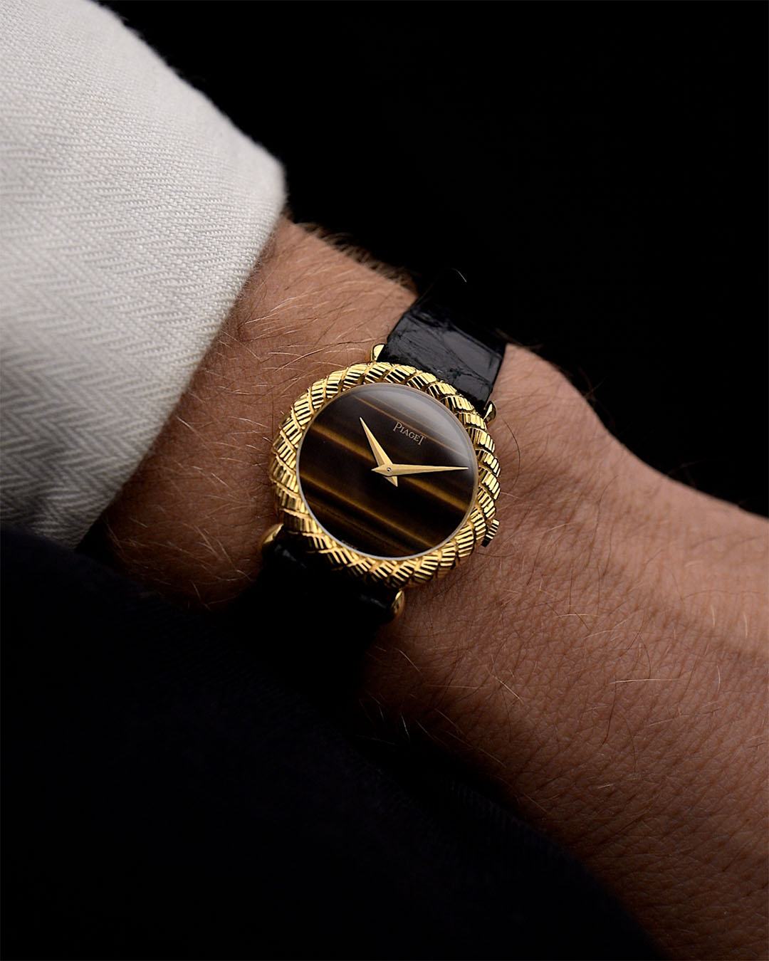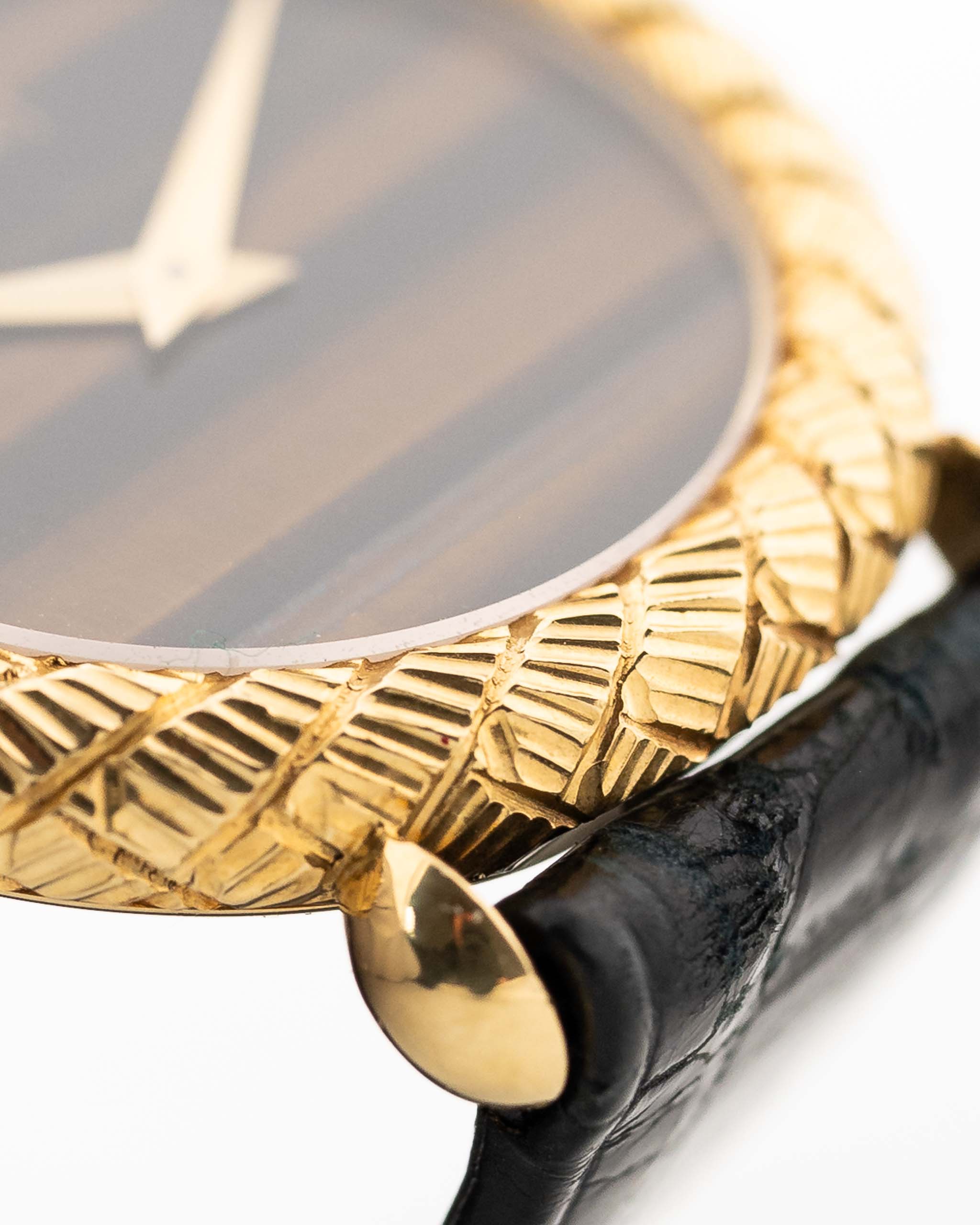 Its slimness was not only a technical accomplishment, it also allowed the manufacture to fit dials made of hard stones while retaining a thin profile like this flawless 18k Piaget with a beautiful tiger eye stone dial. Special on this one is the filigree bezel finish in combination with the beautiful teardrop lugs.