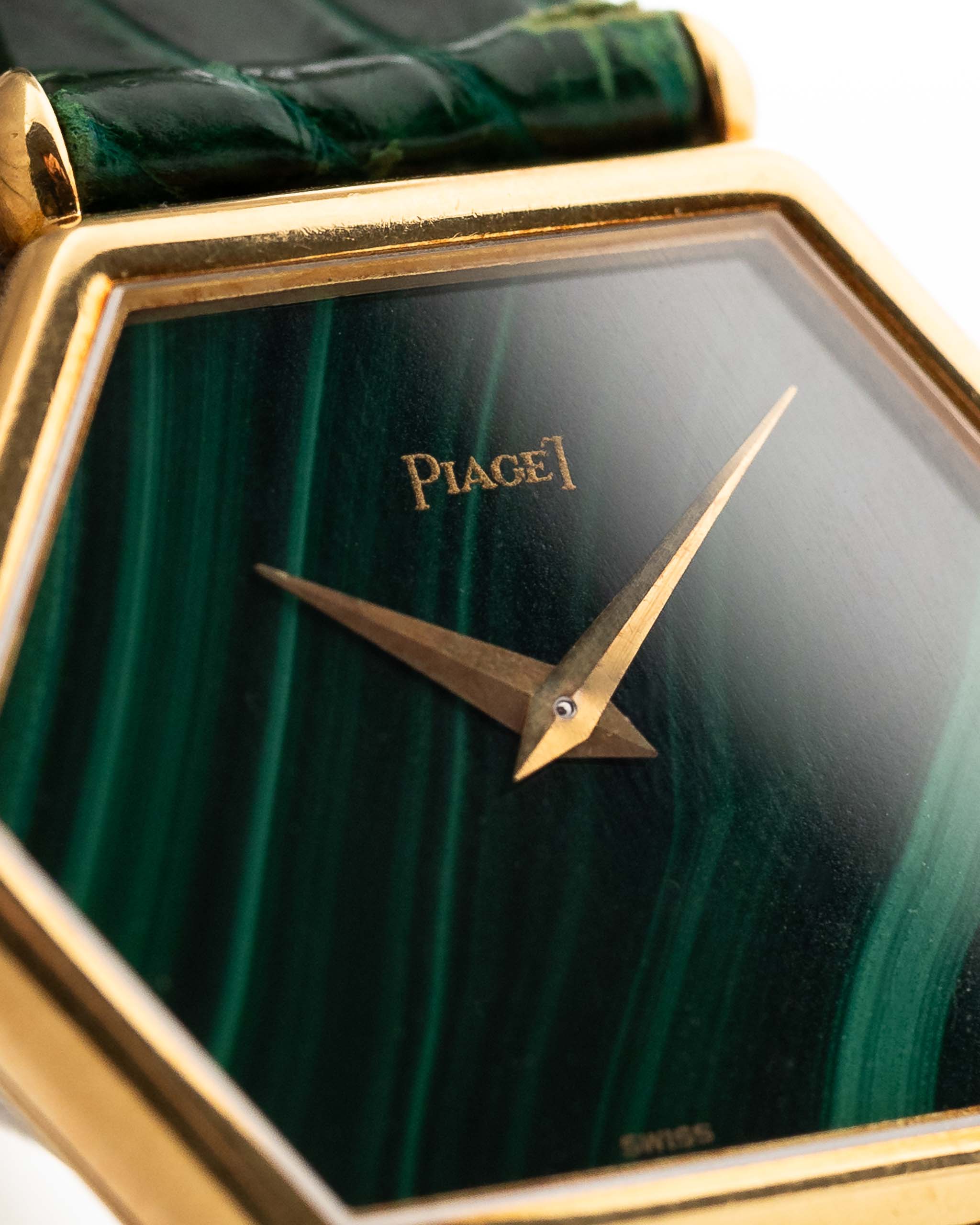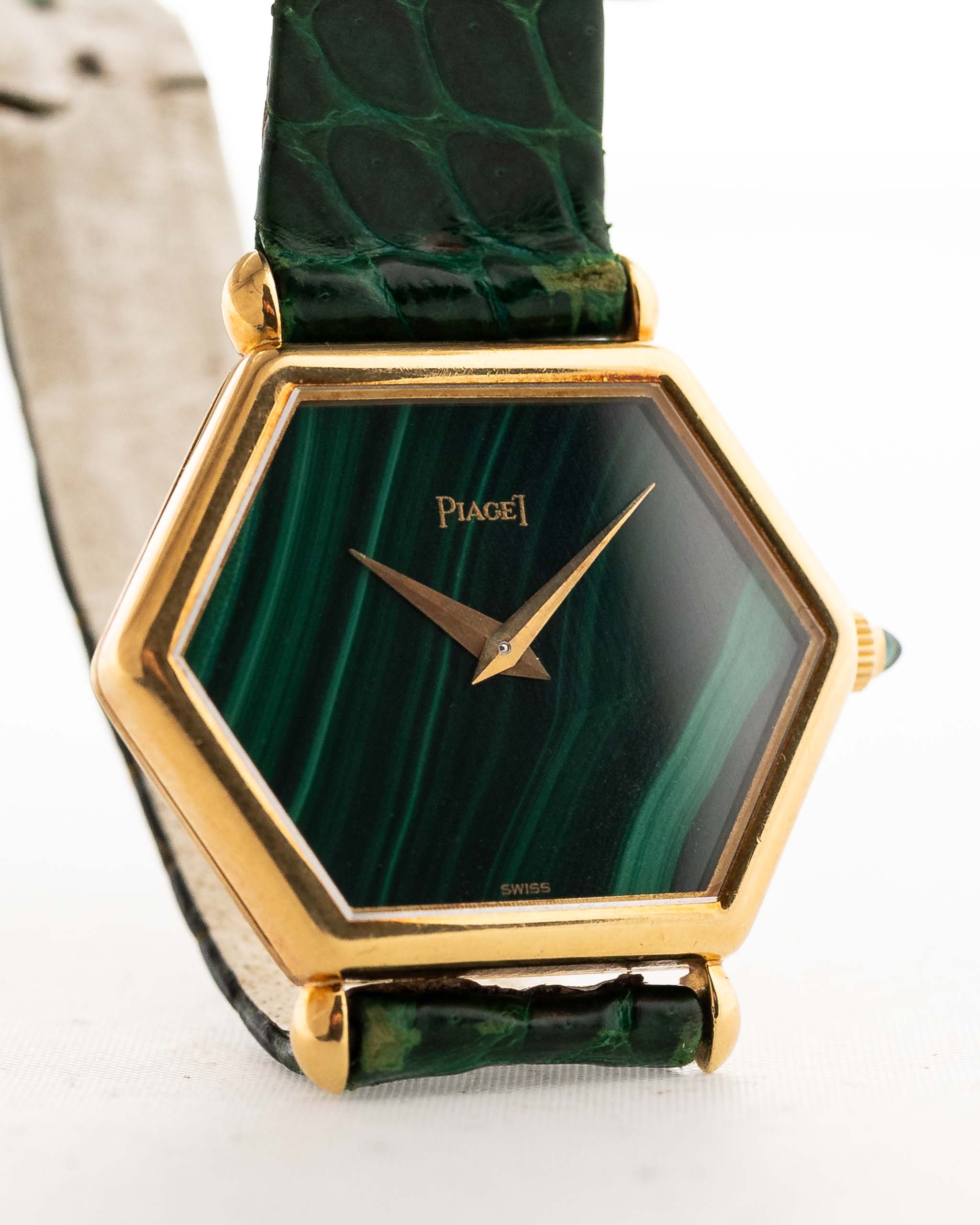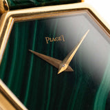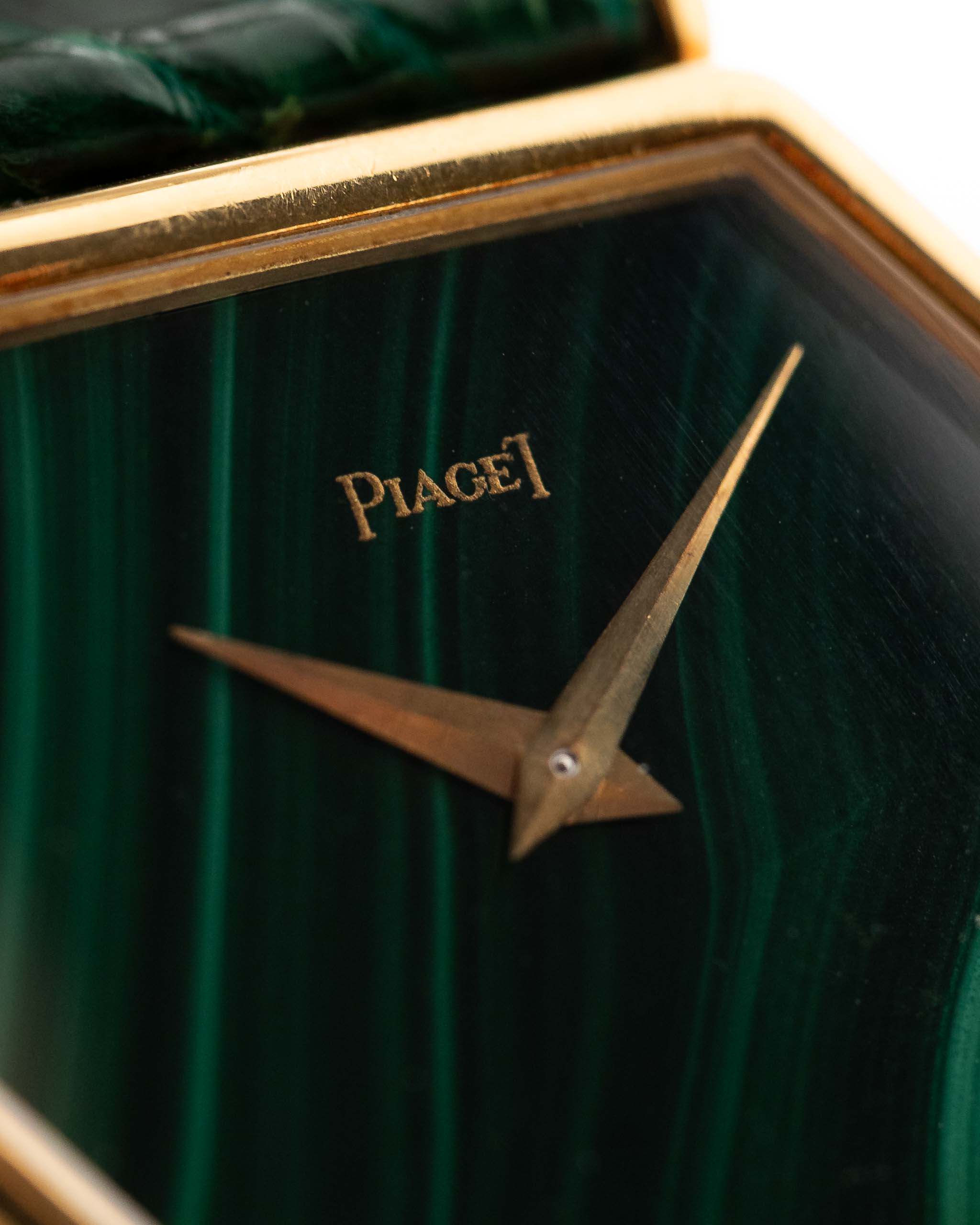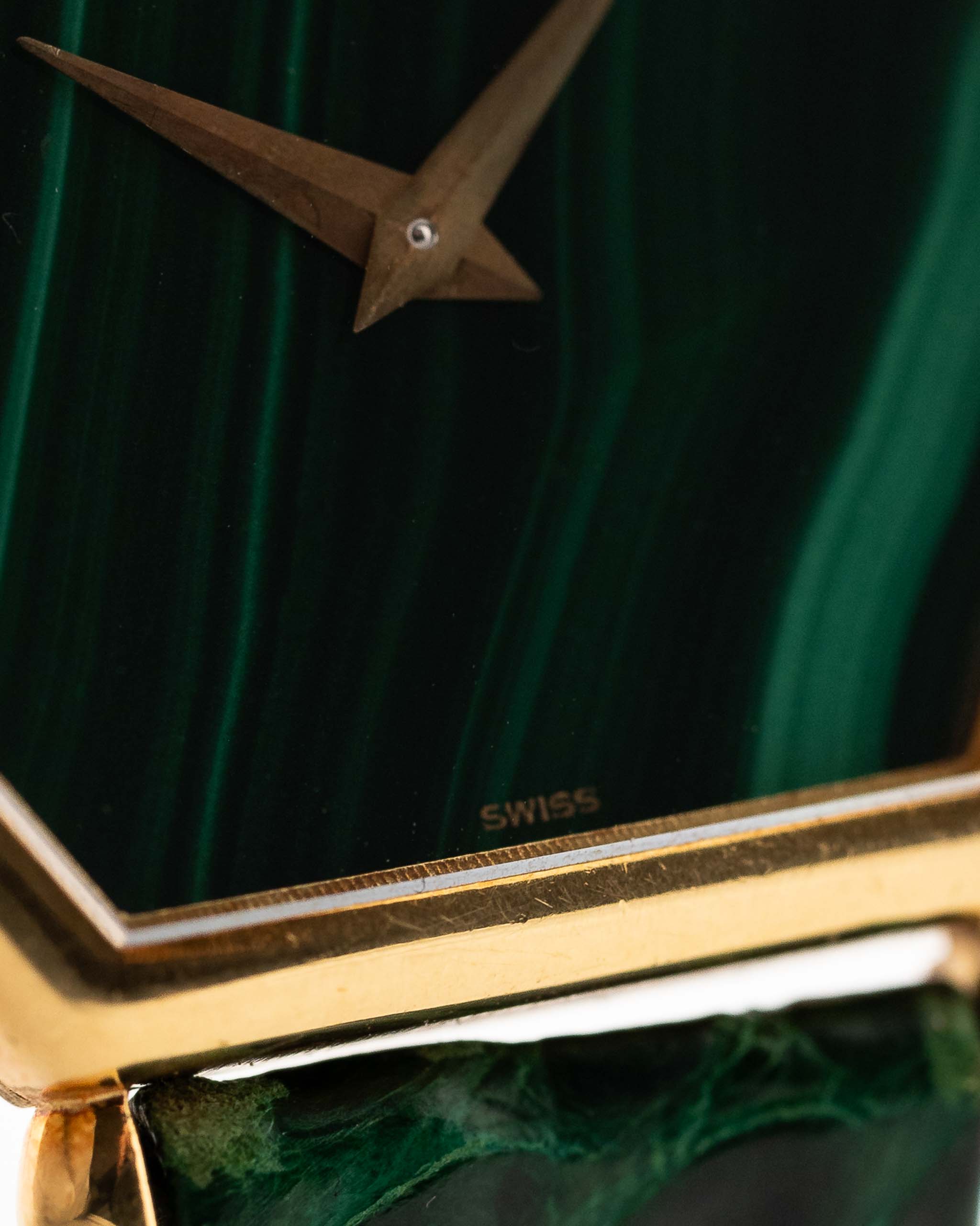 Its slimness was not only a technical accomplishment, it also allowed the manufacture to fit dials made of hard stones while retaining a thin profile like this flawless 18k Piaget with a beautiful malachite stone dial. Special on this one is the unusual case shape in combination with the beautiful teardrop lugs.