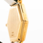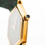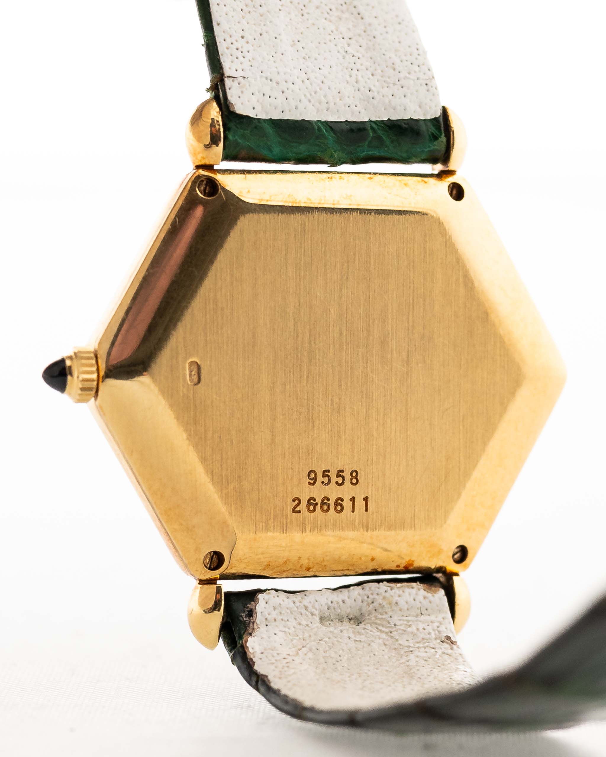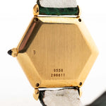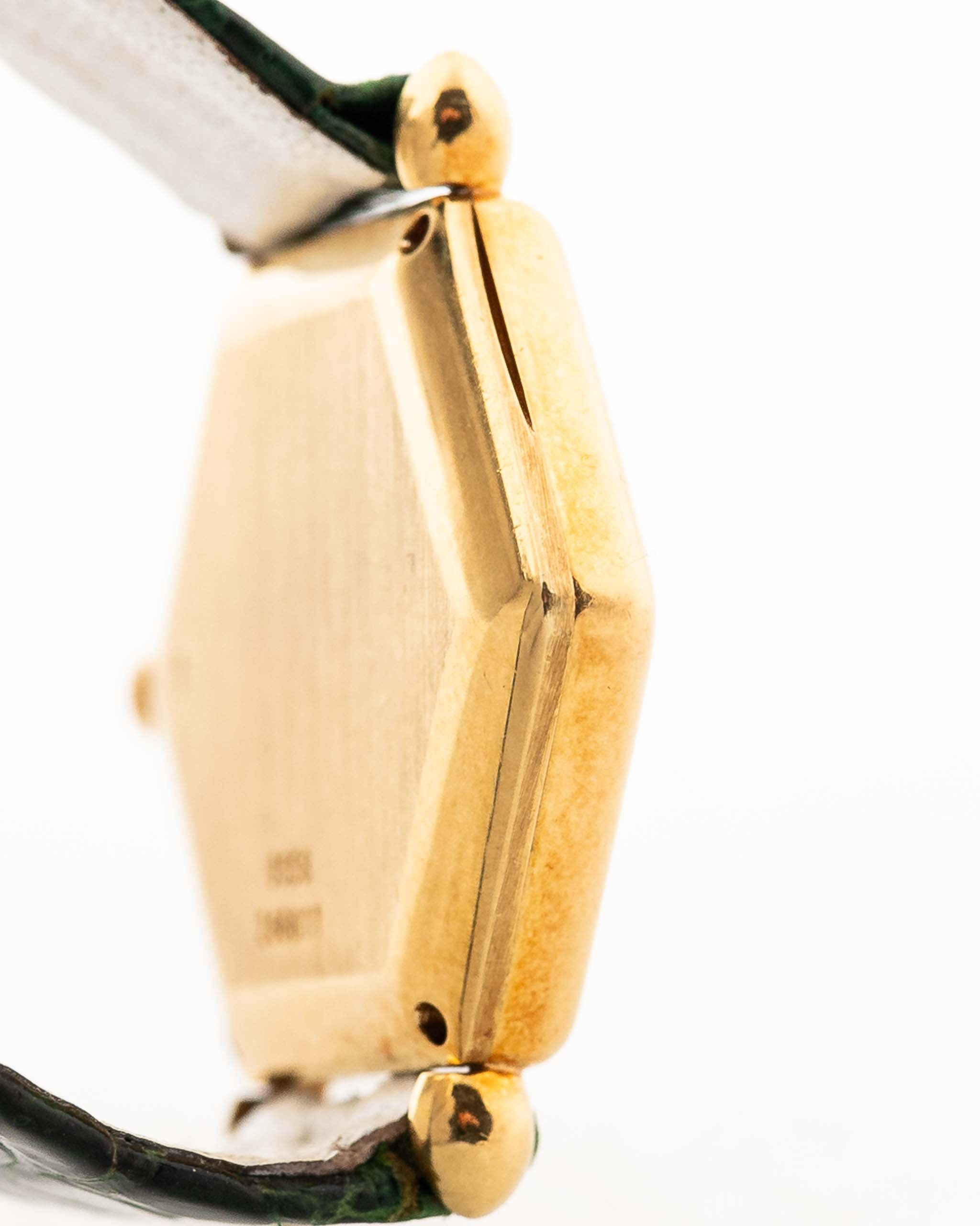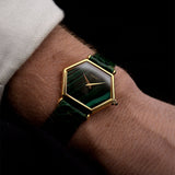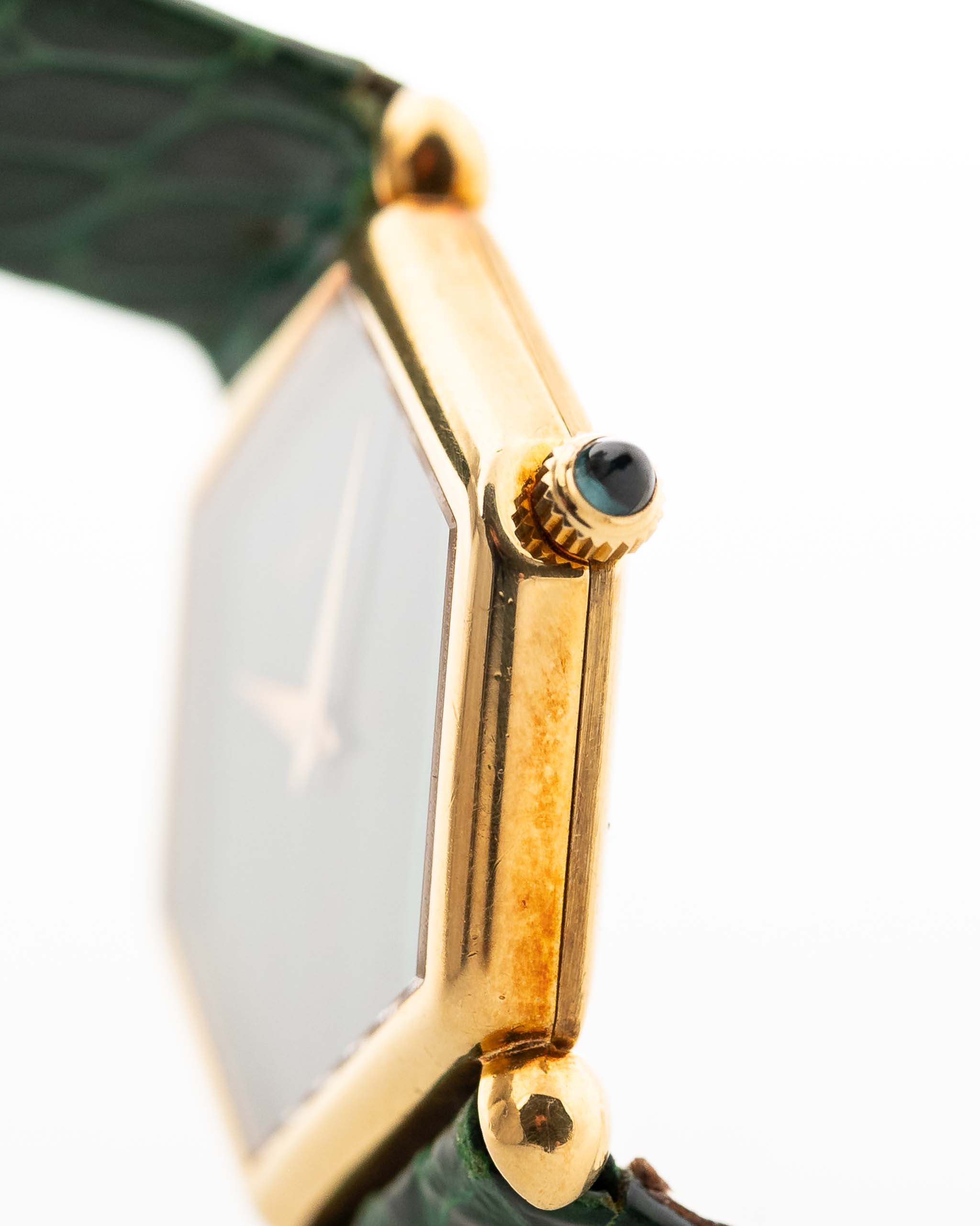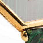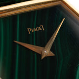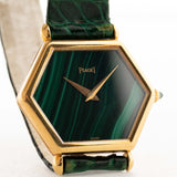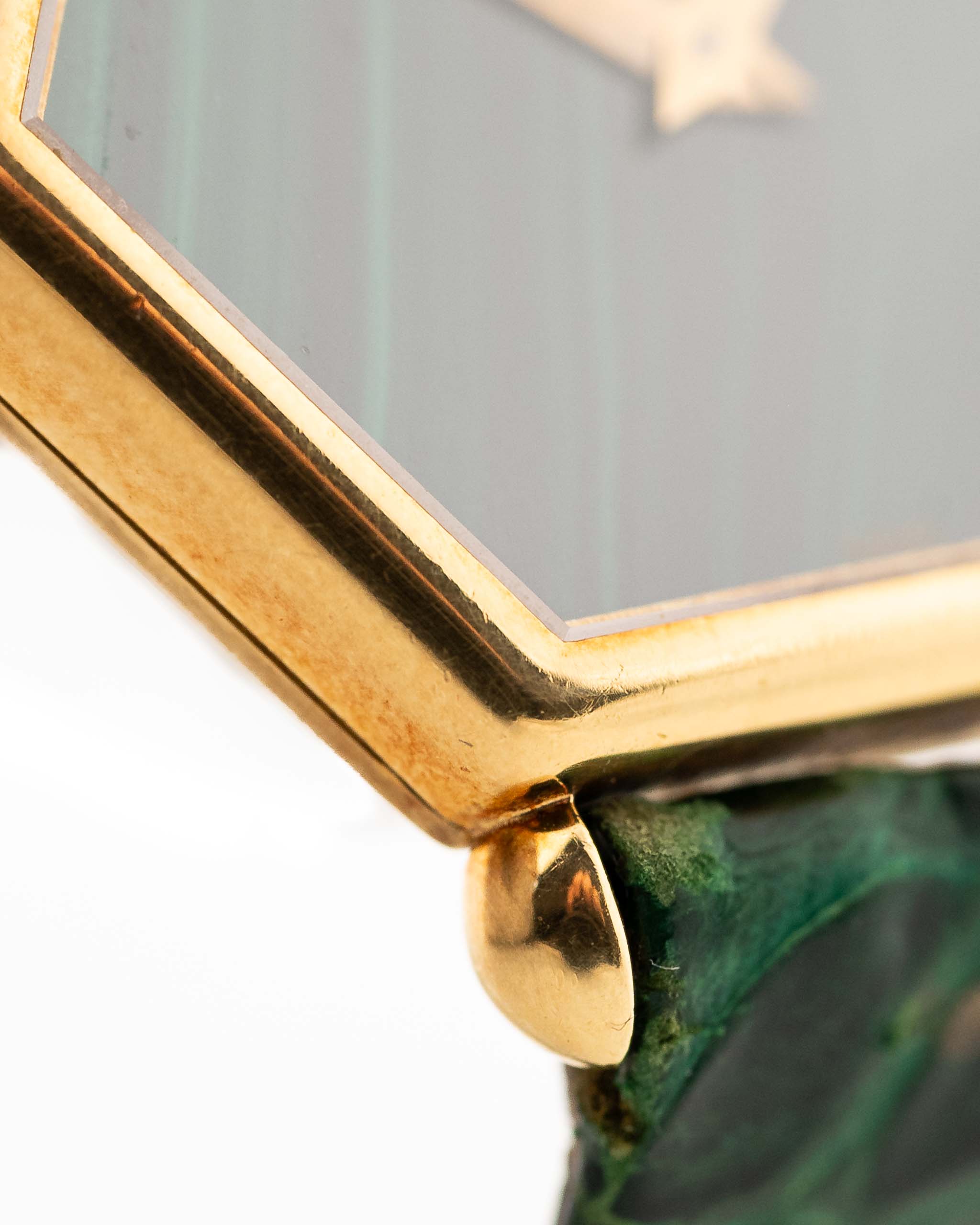 Its slimness was not only a technical accomplishment, it also allowed the manufacture to fit dials made of hard stones while retaining a thin profile like this flawless 18k Piaget with a beautiful malachite stone dial. Special on this one is the unusual case shape in combination with the beautiful teardrop lugs.