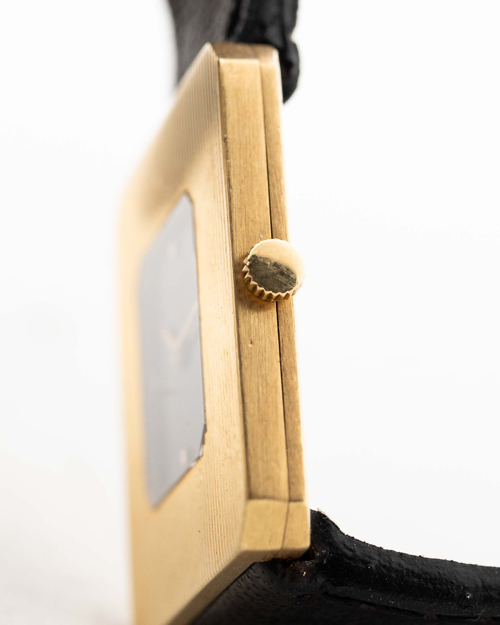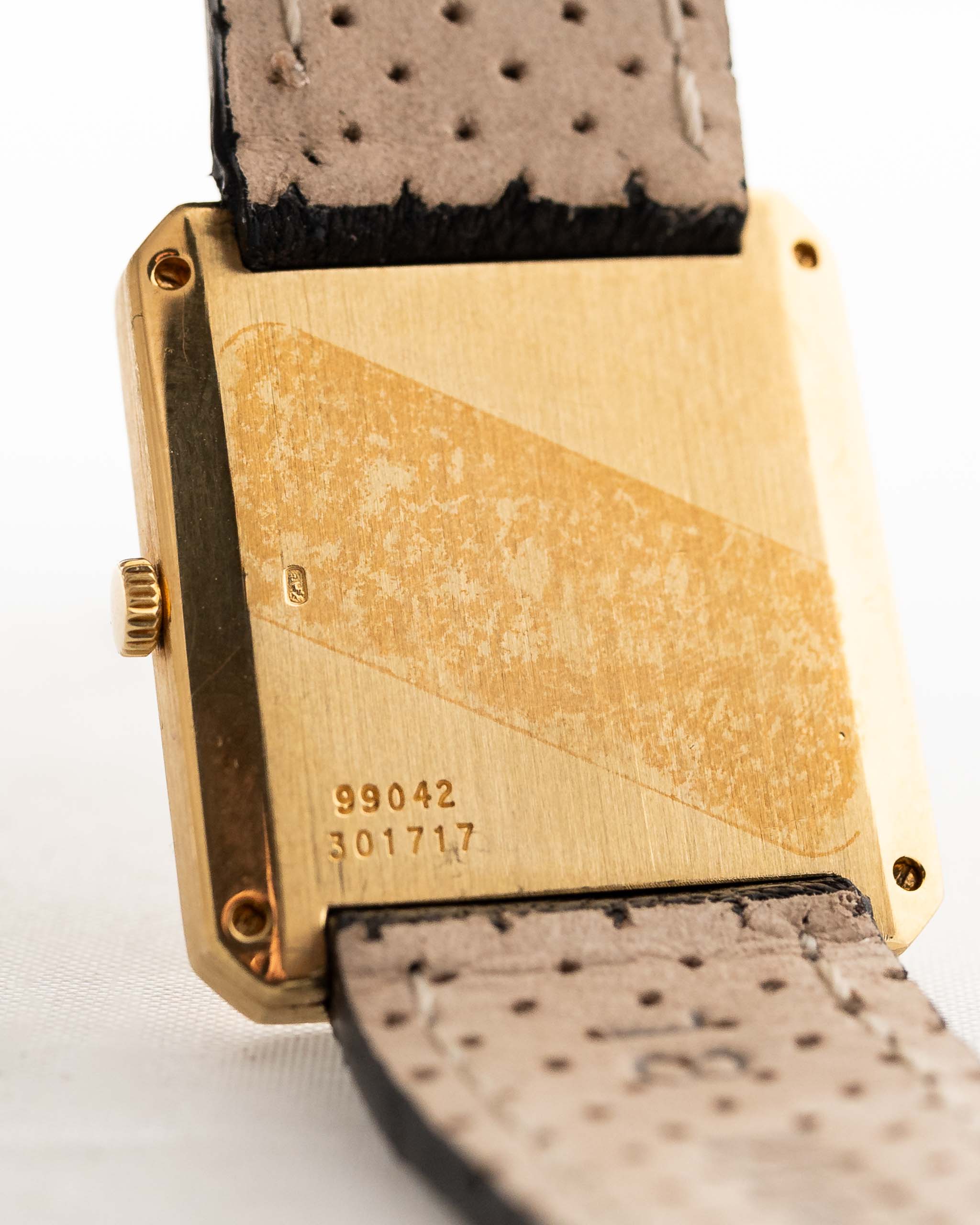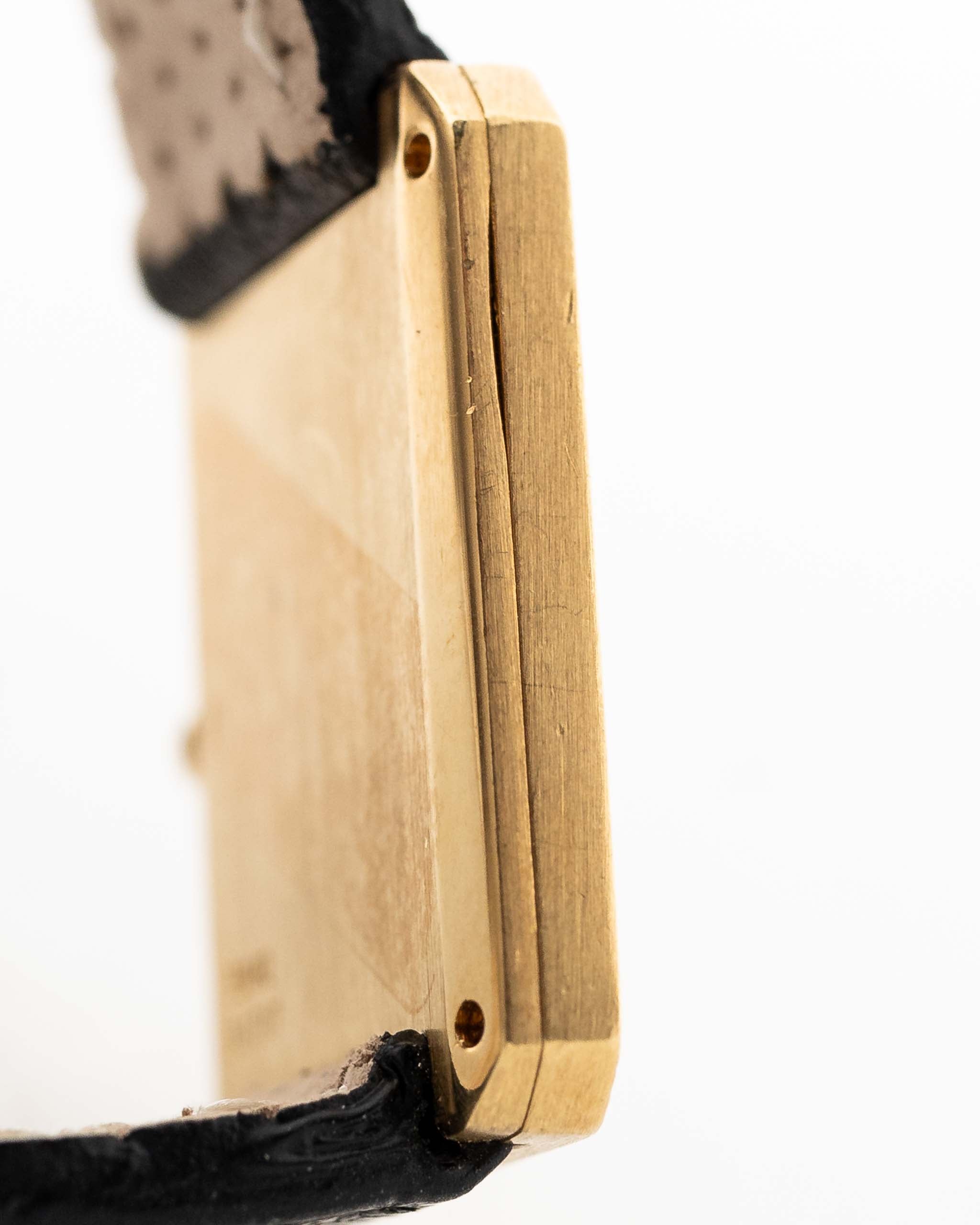 Our piece comes in a very special rectangular shaped design with cute corners and huge but filigree finished gold bezel around the clean black dial, which makes it a piece of art.