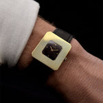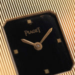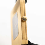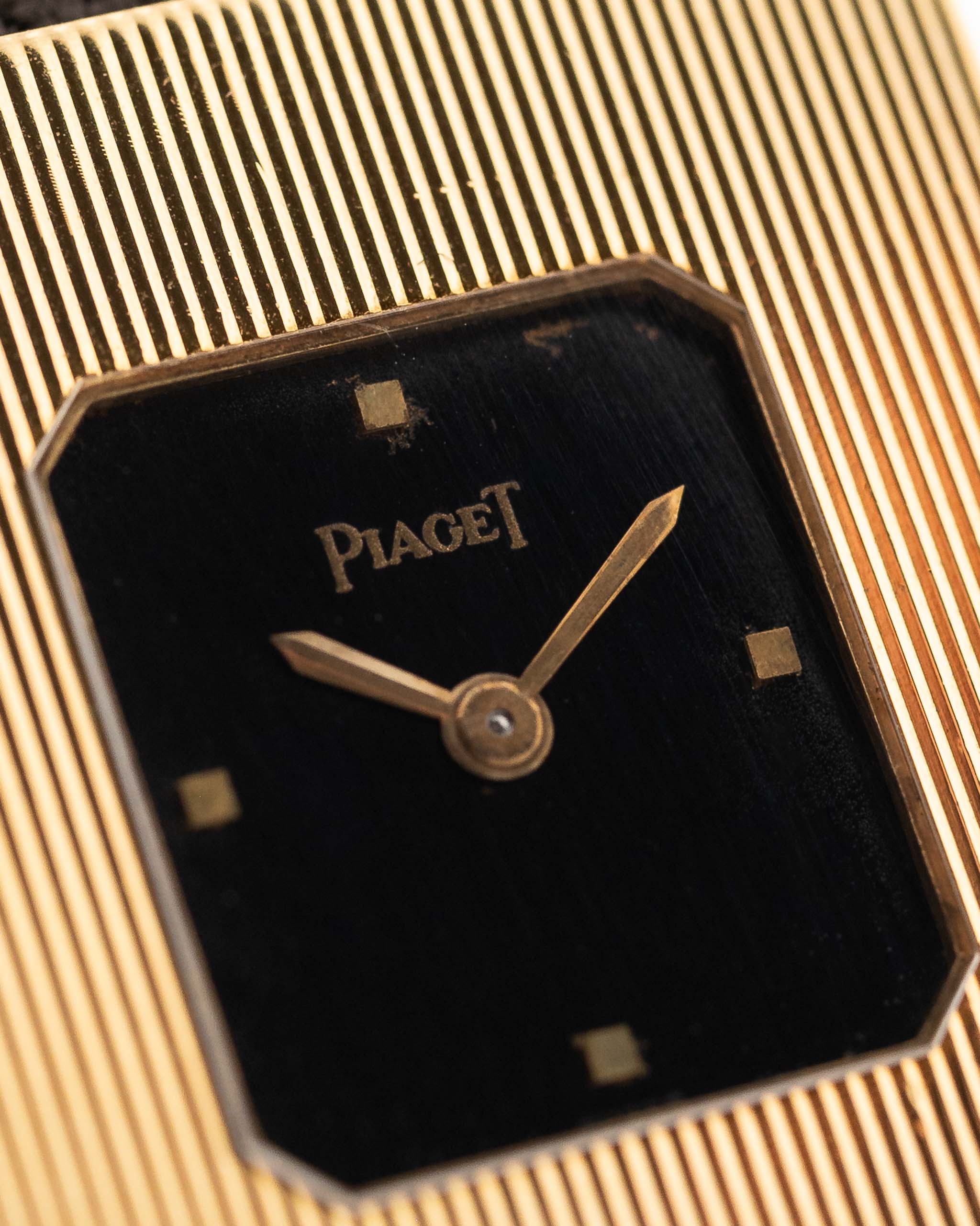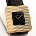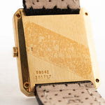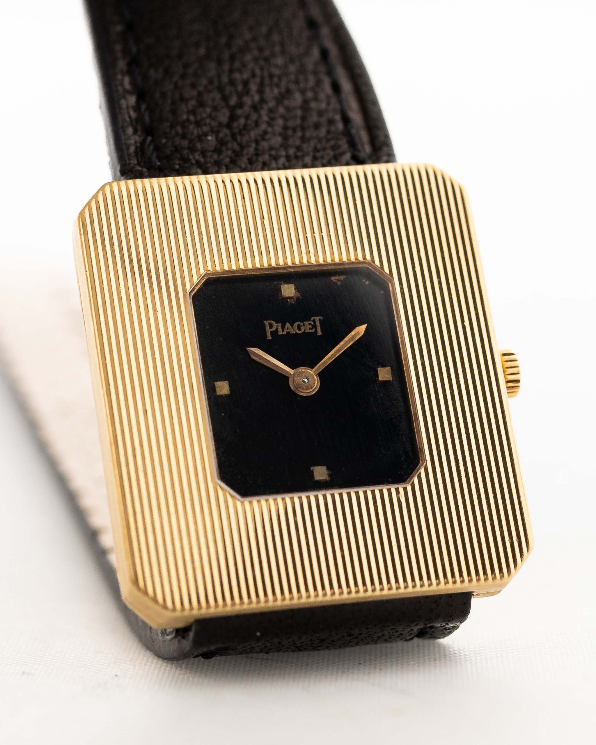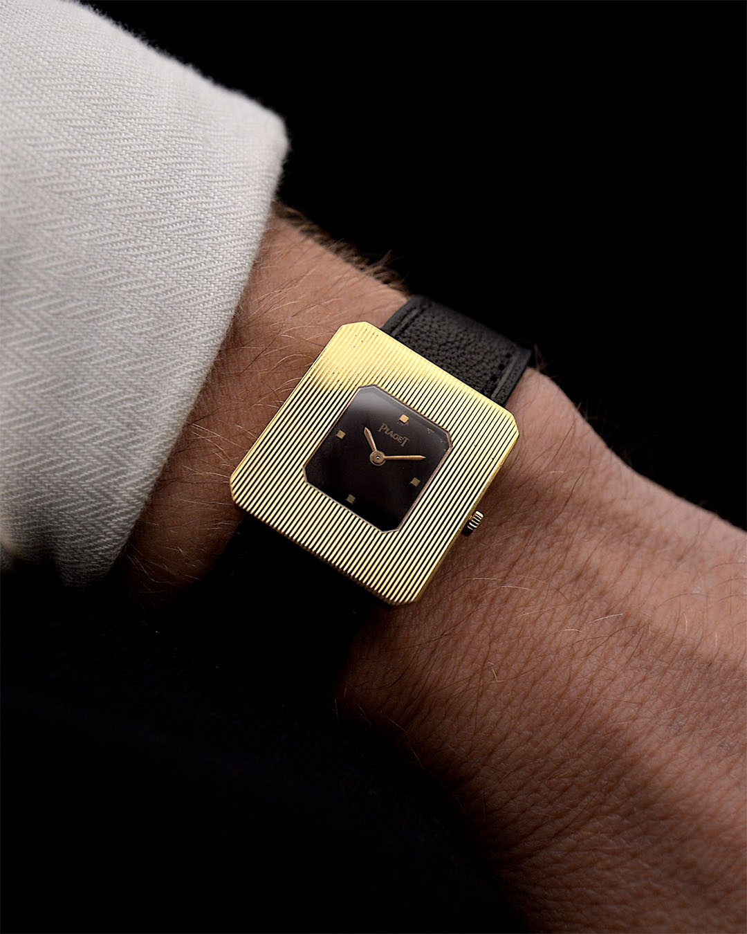 Our piece comes in a very special rectangular shaped design with cute corners and huge but filigree finished gold bezel around the clean black dial, which makes it a piece of art.