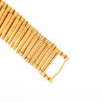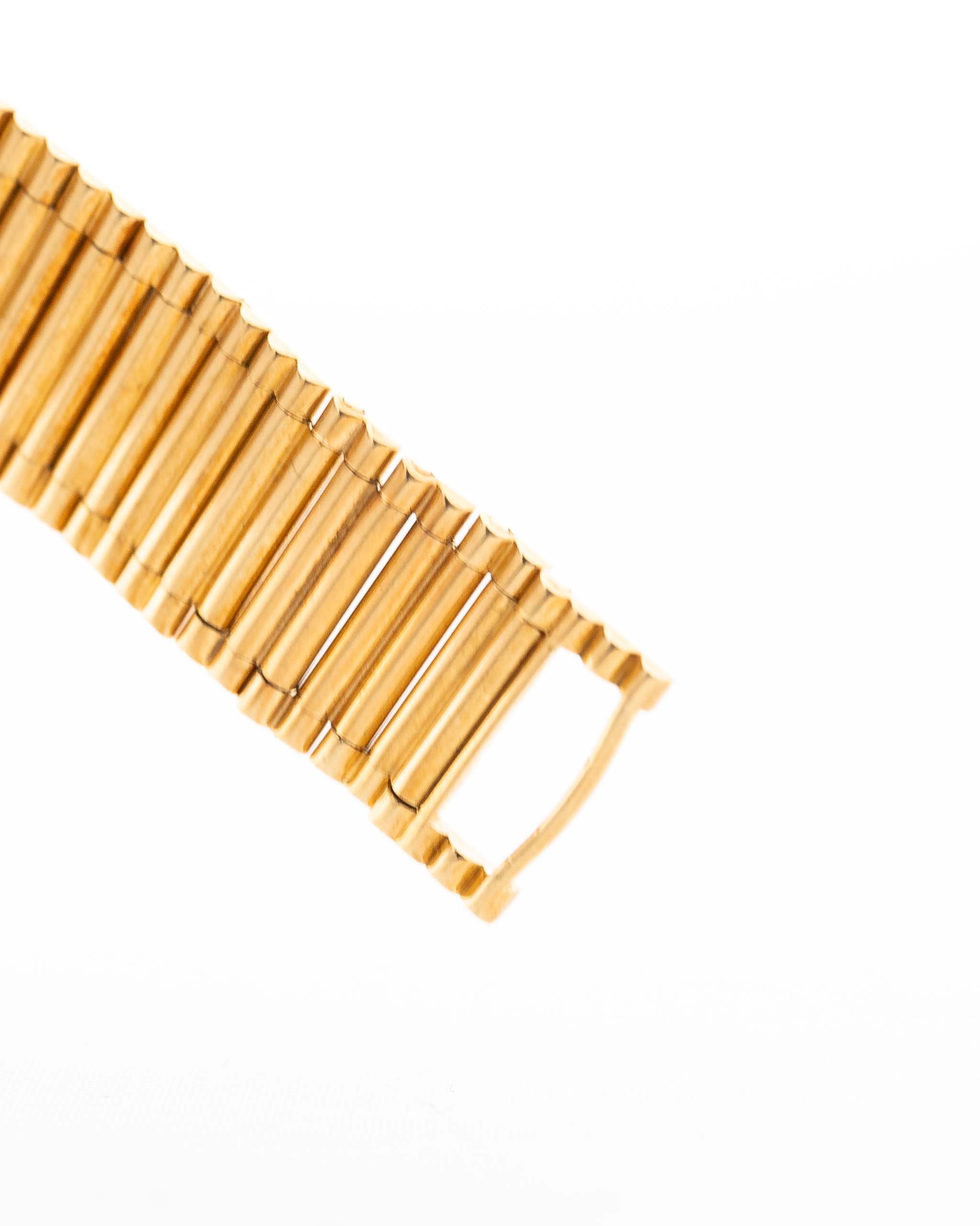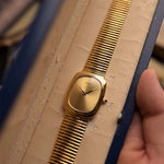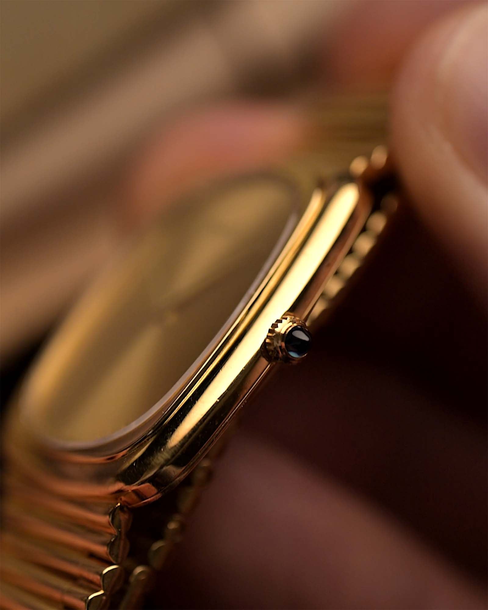 The dial is a minimalist dream: a flawless gold sunburst finish with a crisp outer minute track, paired with slender hands and a sapphire-cabochon crown. But what truly sets this model apart is the integrated 18k yellow gold “bamboo-style” bracelet — a rarely seen and highly collectible detail that elevates the entire piece into a work of wearable sculpture.