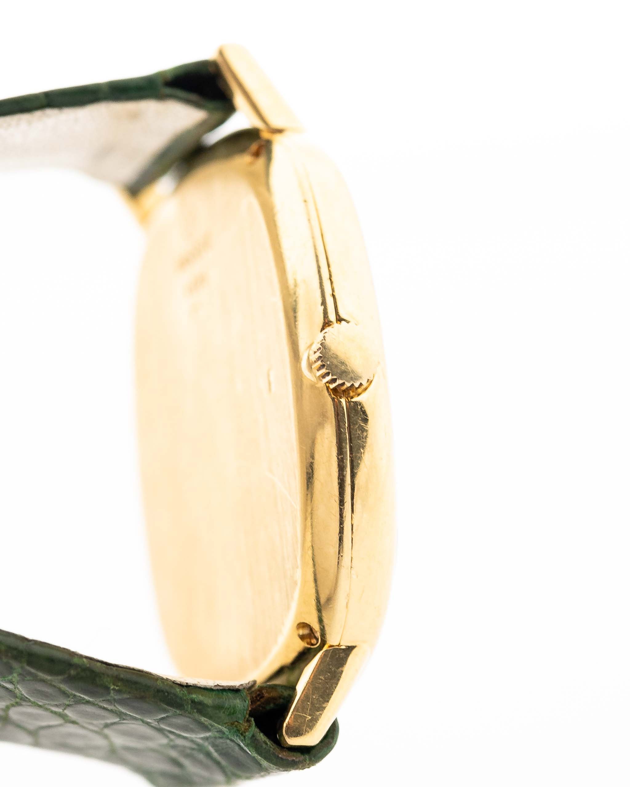 Its slimness was not only a technical accomplishment, it also allowed the manufacture to fit dials made of hard stones while retaining a thin profile like this flawless 18k Piaget with a beautiful green Jade stone dial.