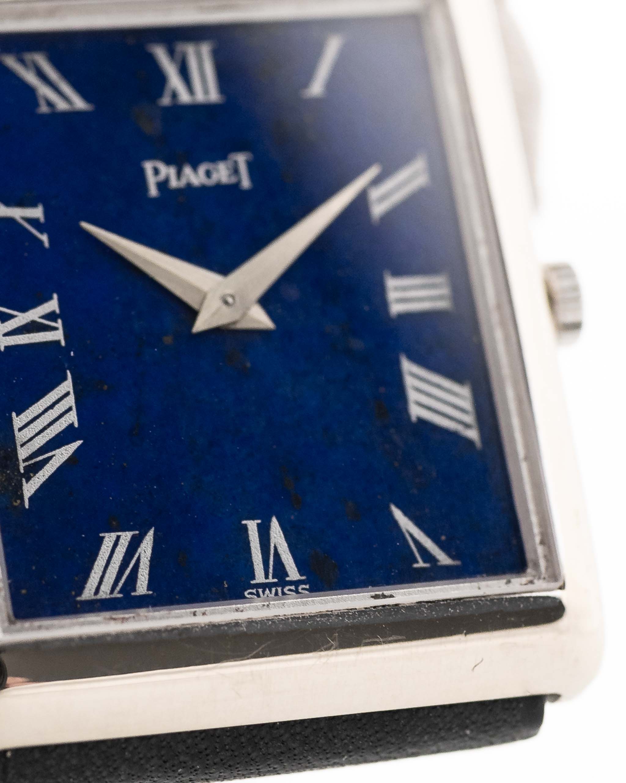 Vintage Piaget Tank 9150 Watch Lapis Lazuli 18k Roman from the 1970s. 23mm with 18k white gold case, Lapislazuli dial, Manual wind Caliber 9P, Black Leather strap in great condition.