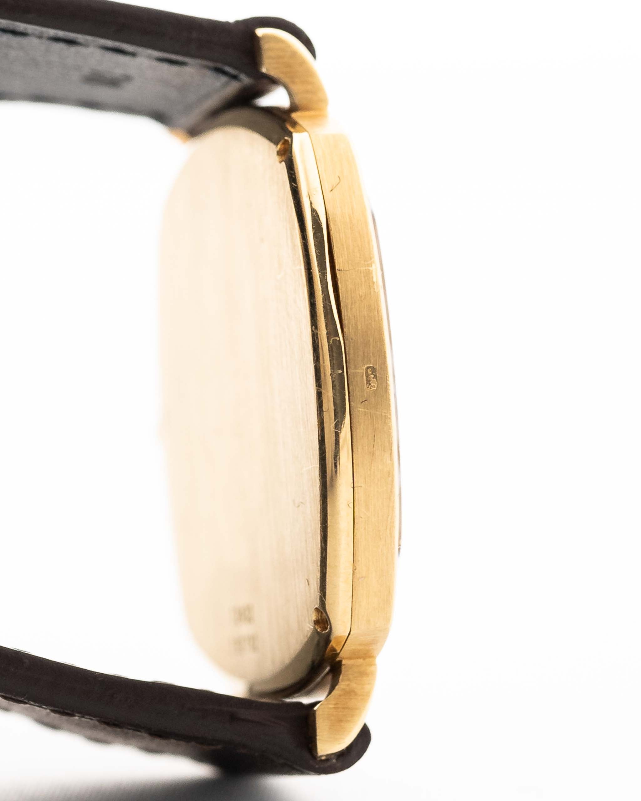 Vintage Piaget TV 12432 Automatic Watch 18k from the 1970s on a wrist. 32.5mm with 18k Yellow Gold Case, Automatic Caliber 12P1, Golden Dial, Leaf Hands and Leather Strap.