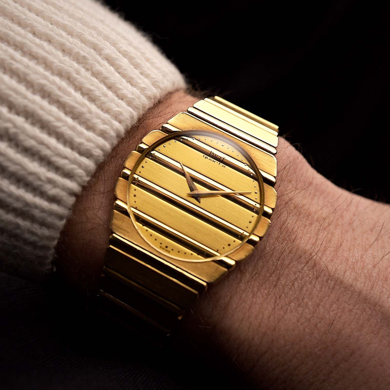 The Rolex Cellini line showcases the dressier side of Rolex compared to its more well-known sport models. This version is fitted in a 18k-yellow-gold square-shaped case, which is an unusual case shape for Rolex.