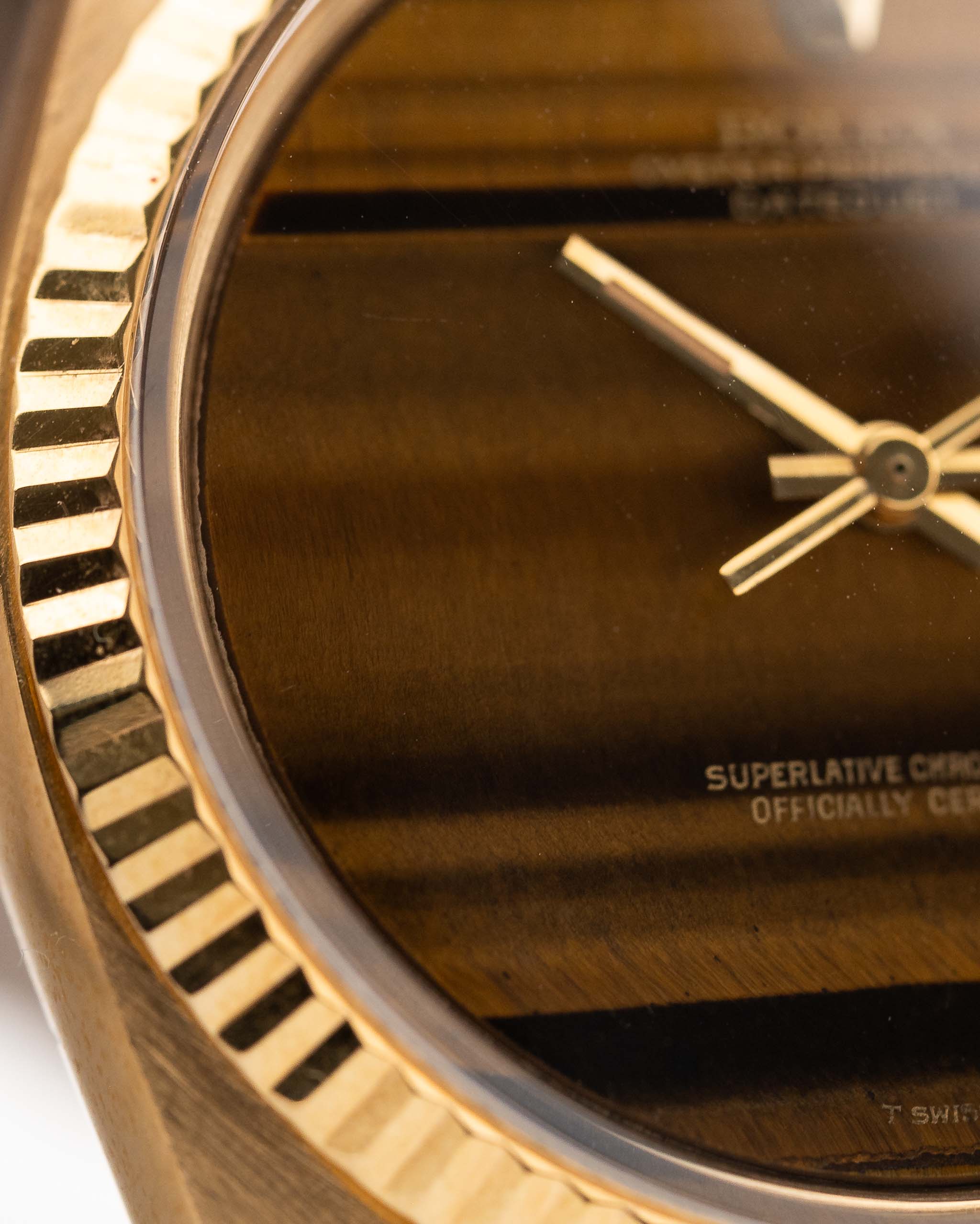 Discover the enduring appeal of the Rolex Datejust 1601, an iconic vintage timepiece crafted in solid 18K yellow gold. This classic 36mm model stands out with its exceptionally rare Tiger Eye dial, prized for its warm brown tones and unique natural patterns—each dial is truly one of a kind.