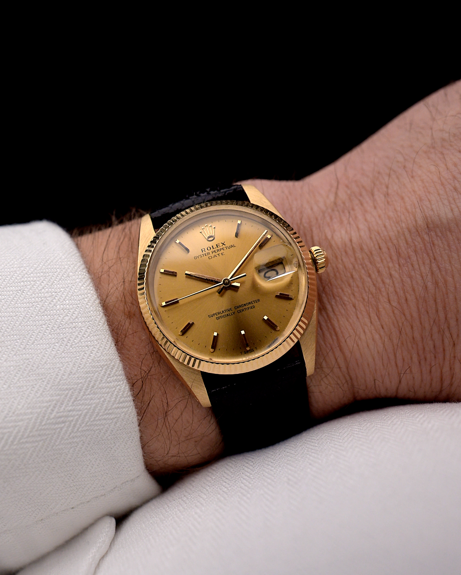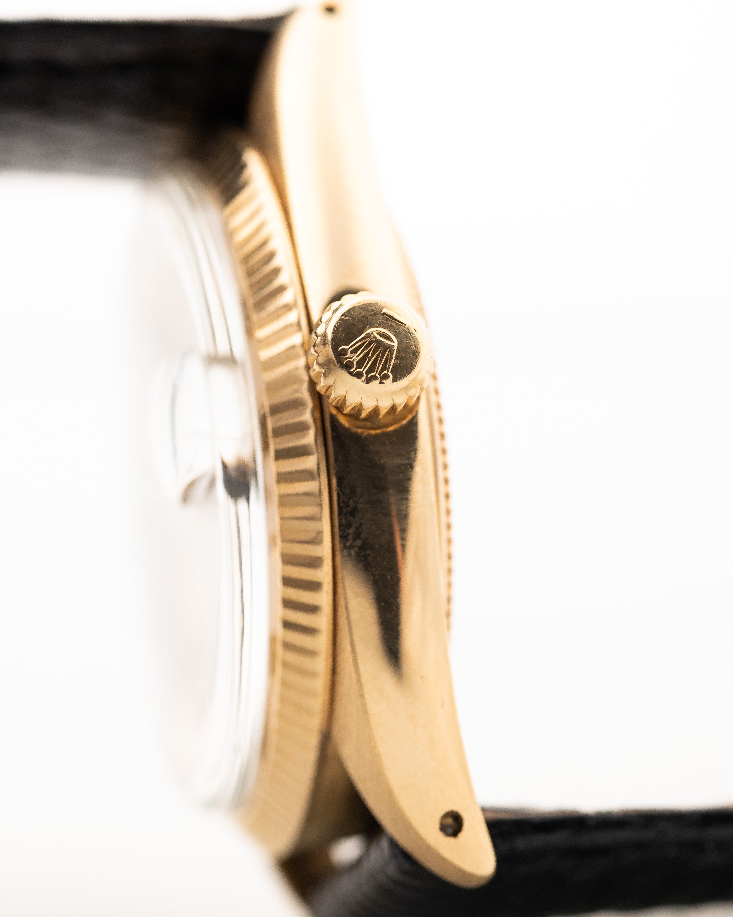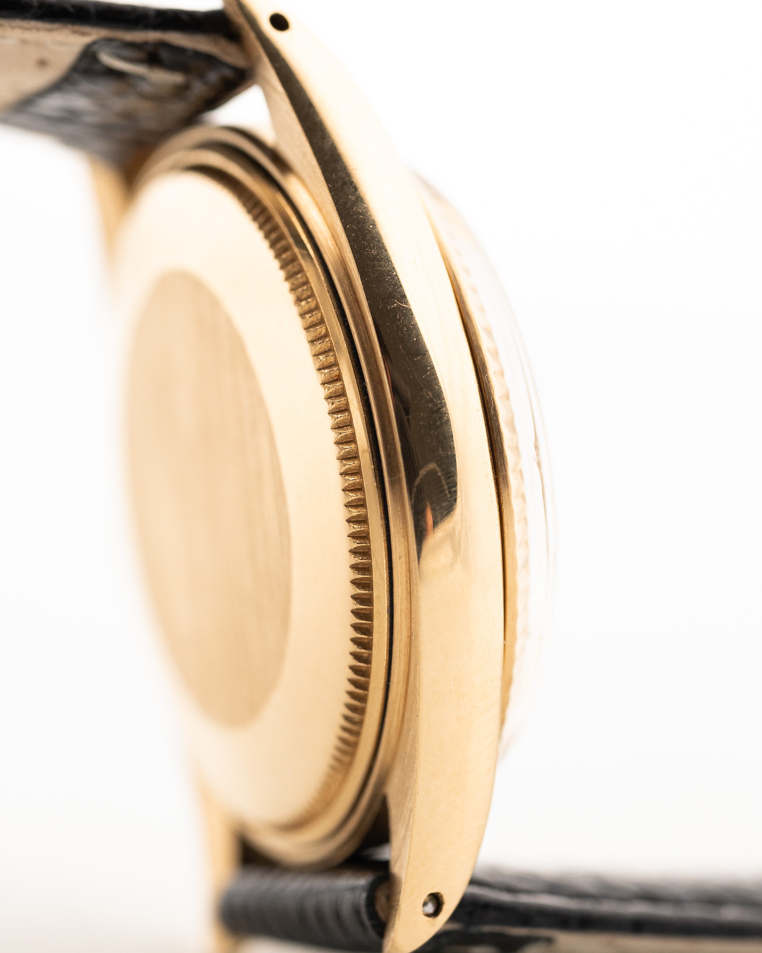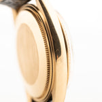 A solid yellow gold case with a fluted bezel and a beautiful and very rare golden colored sunburst dial with diamond cut stick hour markers keep the appearance simple and elegant.